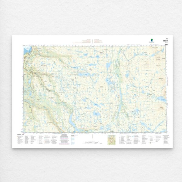 Norge 1:50000 (N50) er Kartverkets topografiske hovedkartserie. Inneholder bebyggelse, høydekurver, skog, dyrka mark, kystkontur, elver, bekker, vann, myr, breer, veier, stier, jernbaner, flyplasser, kommunegrenser, verneområder, samt detaljert dybde- og navigasjonsinformasjon hentet fra sjøkartene. Kartet har har målestokk 1:50.000 og leveres på rull i størrelse 104 x 73 cm. Kan også leveres på plate eller ferdig innrammet. Størrelse med passepartout og ramme er 124 x 93 cm.