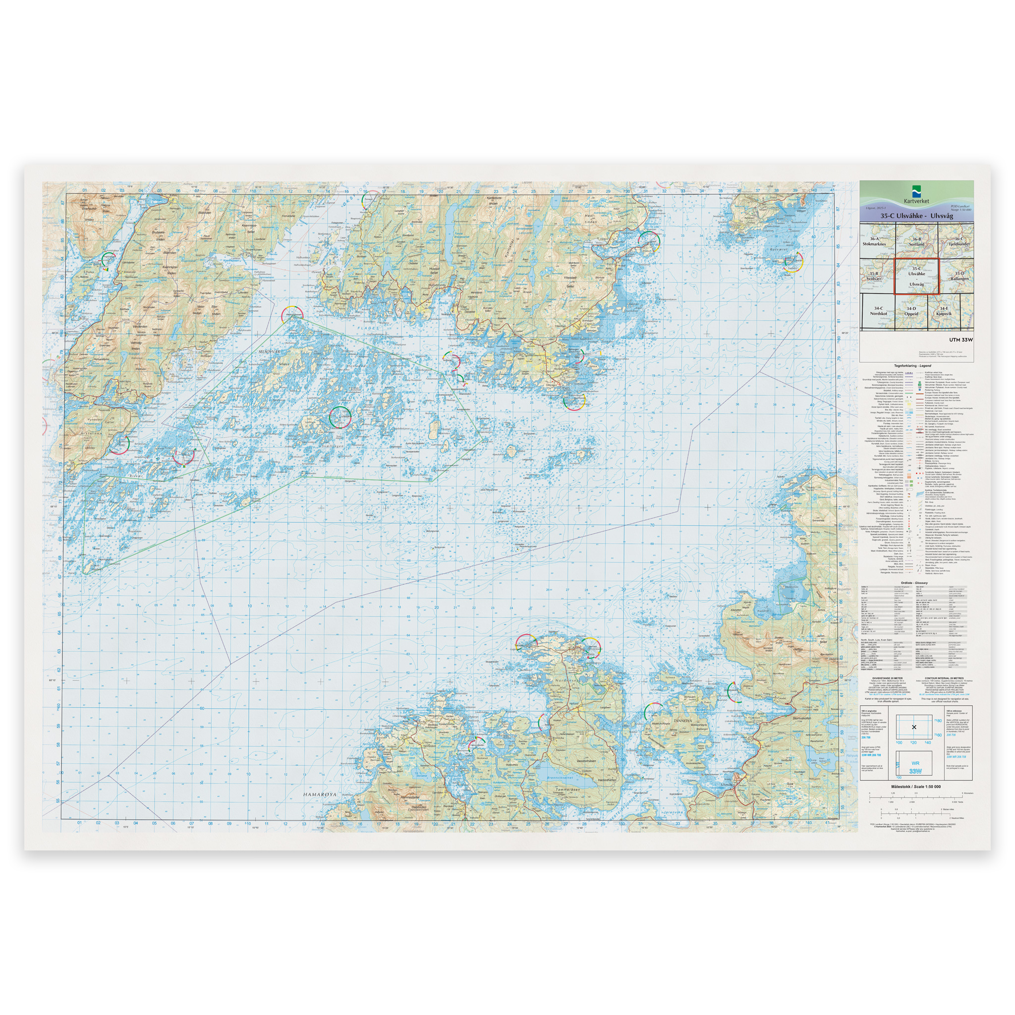 Kartverkets klassiske landkartserie (N50)- i ny oppdatert utgave, utgitt i mai 2025. Viser bebyggelse, høydekurver, skog, dyrka mark, kystkontur, elver, bekker, vann, myr, breer, veier, stier, jernbaner, flyplasser, kommunegrenser, verneområder, samt detaljert dybde- og navigasjonsinformasjon hentet fra sjøkartene. Kartet har har målestokk 1:50.000 og leveres på rull i størrelse 103 x 73 cm. Kan også leveres på plate eller ferdig innrammet. Størrelse med passepartout og ramme er 124 x 93 cm.