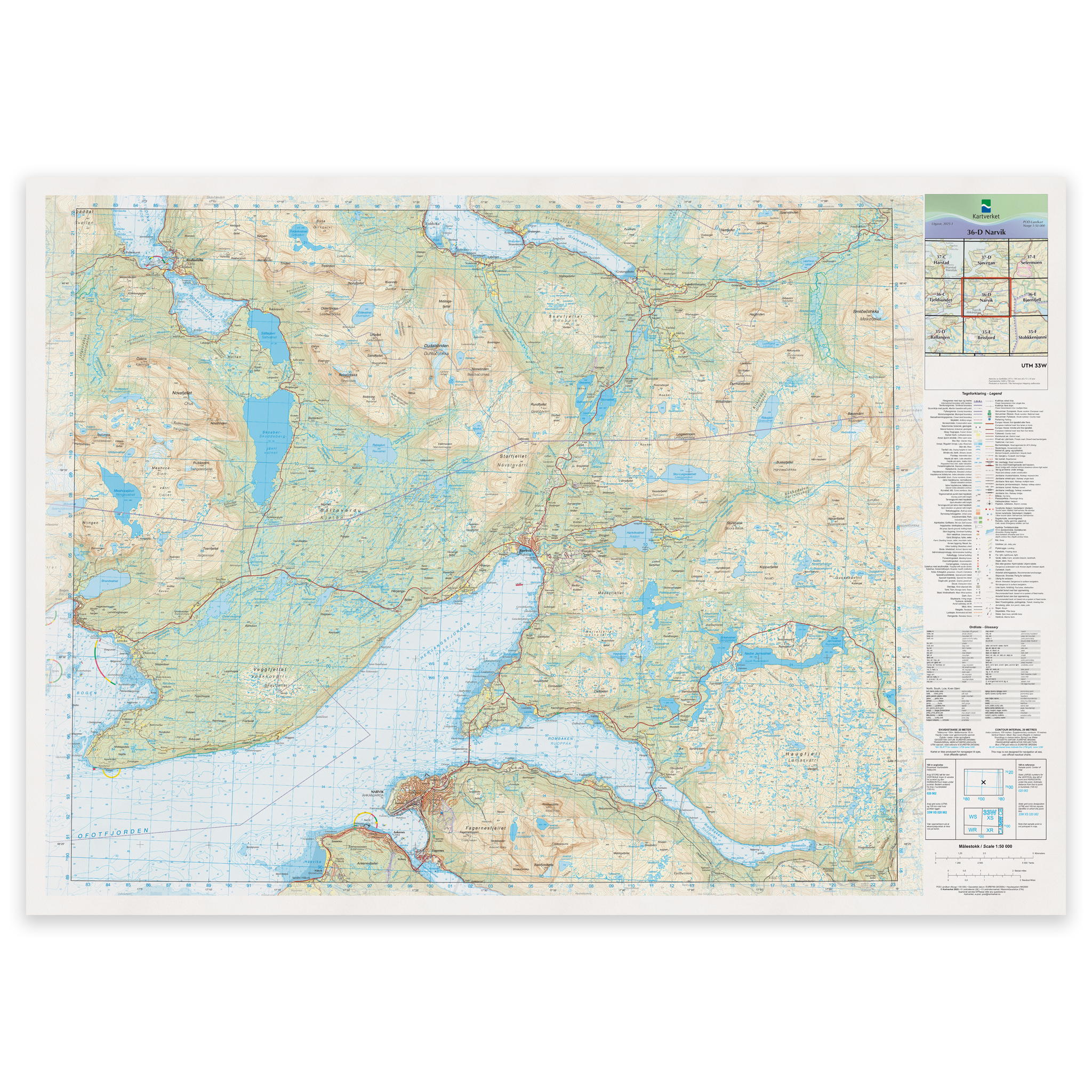 Kartverkets klassiske landkartserie (N50)- i ny oppdatert utgave, utgitt i mai 2025. Viser bebyggelse, høydekurver, skog, dyrka mark, kystkontur, elver, bekker, vann, myr, breer, veier, stier, jernbaner, flyplasser, kommunegrenser, verneområder, samt detaljert dybde- og navigasjonsinformasjon hentet fra sjøkartene. Kartet har har målestokk 1:50.000 og leveres på rull i størrelse 103 x 73 cm. Kan også leveres på plate eller ferdig innrammet. Størrelse med passepartout og ramme er 124 x 93 cm.