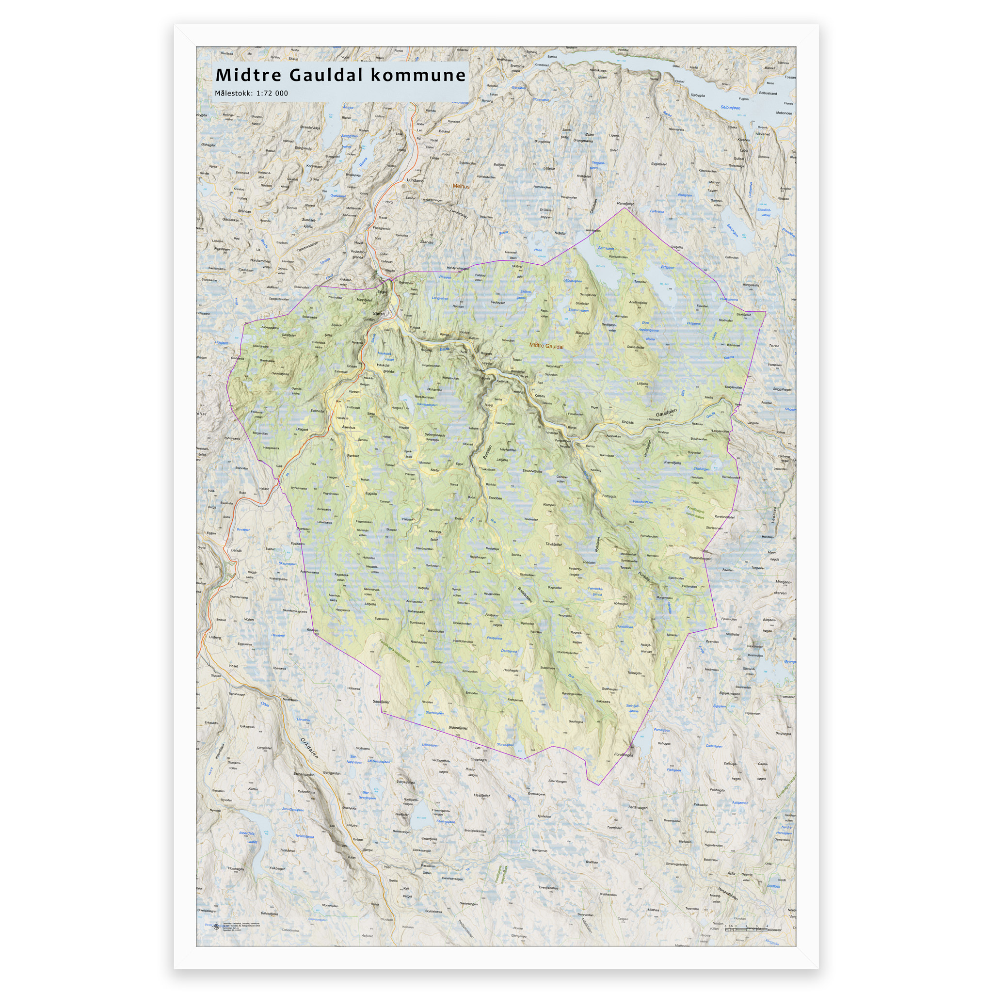 Stilrent og detaljert kart over Midtre Gauldal kommune, tilgjengelig i fem størrelser. Kartet viser hele kommunen med tettsteder, fjorder, innsjøer og oppdaterte grenser mot nabokommunene, og lages på bestilling med de nyeste kartdataene fra Kartverket – alltid ajour med veinett, stedsnavn og administrative inndelinger. De topografiske terrengskyggene gir en naturtro og tredimensjonal effekt som gjengir landskapet rundt Midtre Gauldal på en elegant måte.