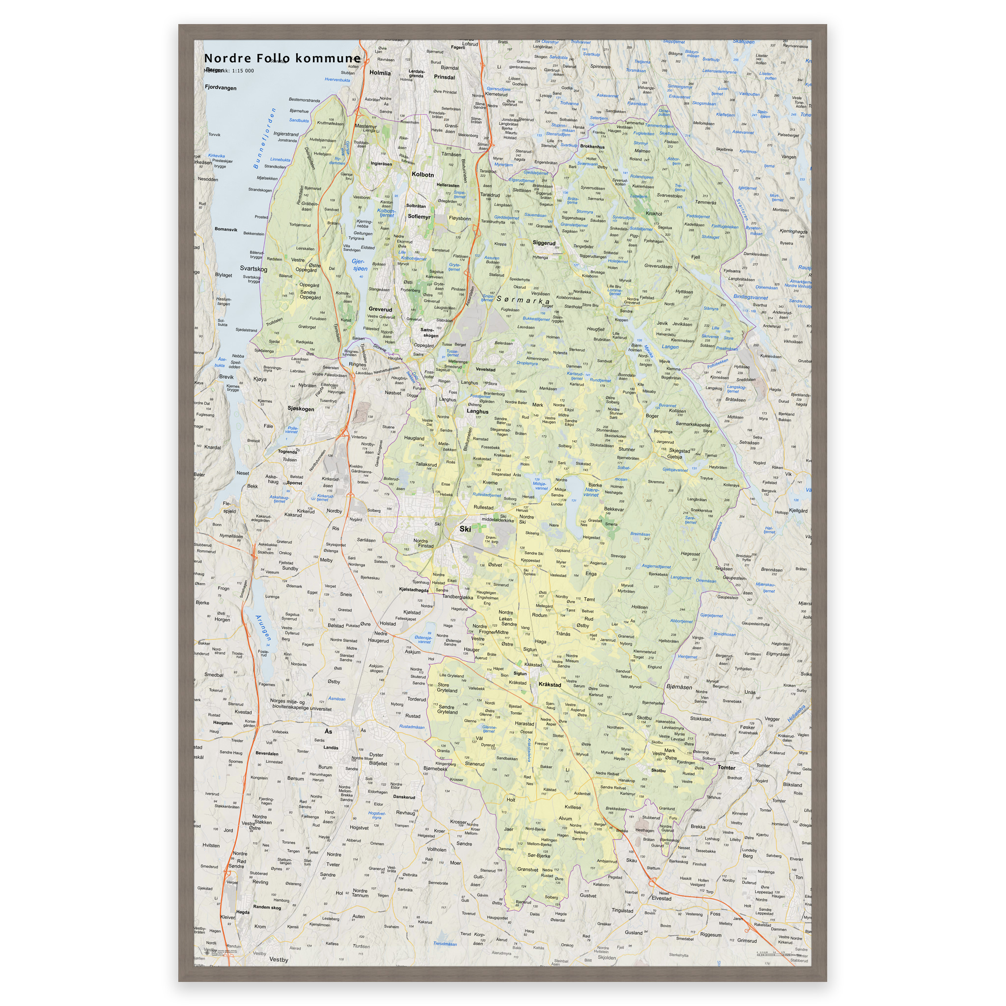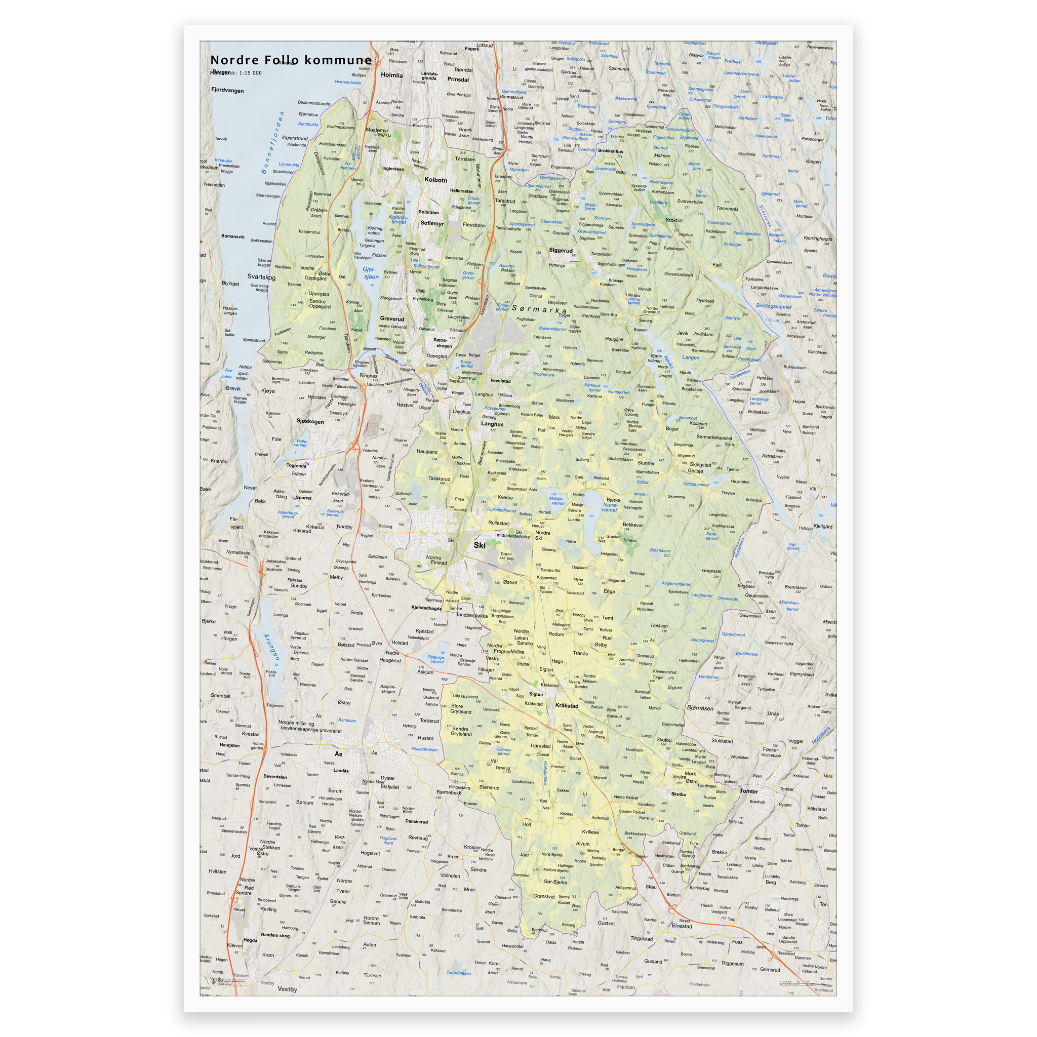 Stilrent og detaljert kart over Nordre Follo kommune, tilgjengelig i fem størrelser. Kartet viser hele kommunen med tettsteder, fjorder, innsjøer og oppdaterte grenser mot nabokommunene, og lages på bestilling med de nyeste kartdataene fra Kartverket – alltid ajour med veinett, stedsnavn og administrative inndelinger. De topografiske terrengskyggene gir en naturtro og tredimensjonal effekt som gjengir landskapet rundt Nordre Follo på en elegant måte.