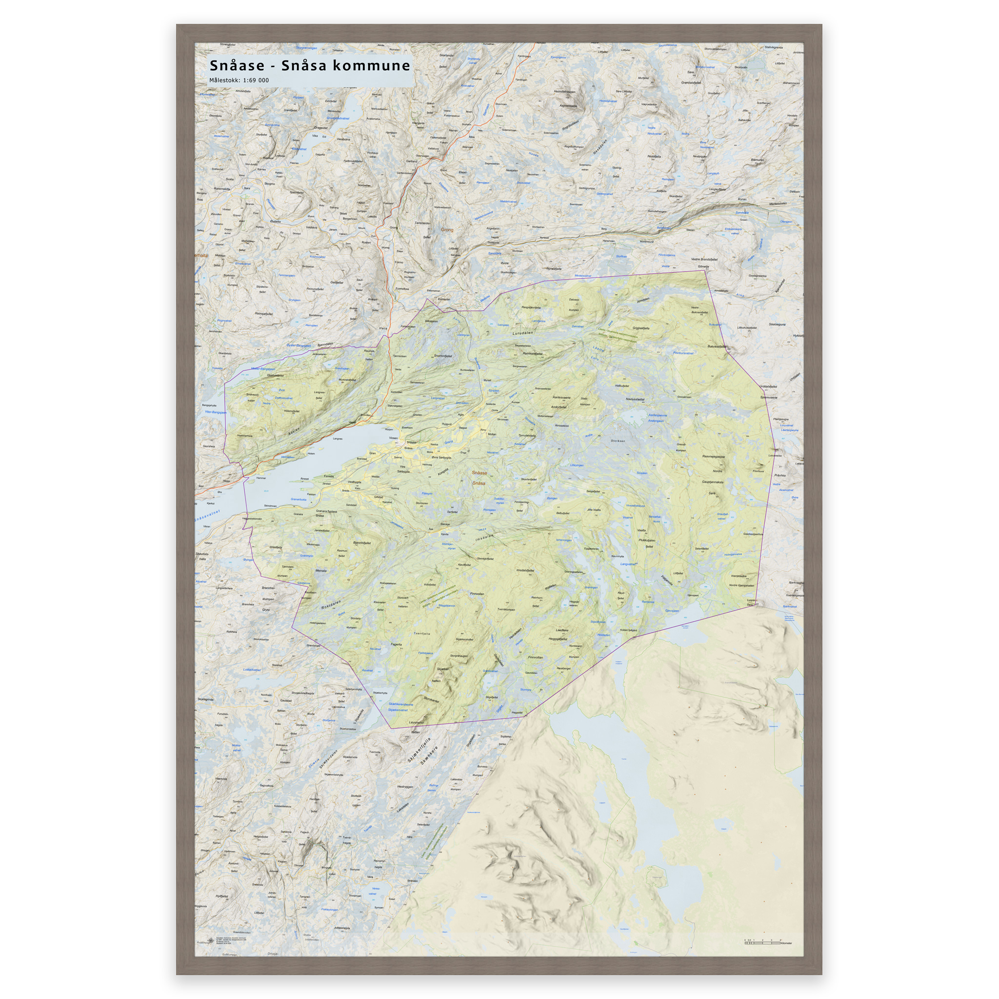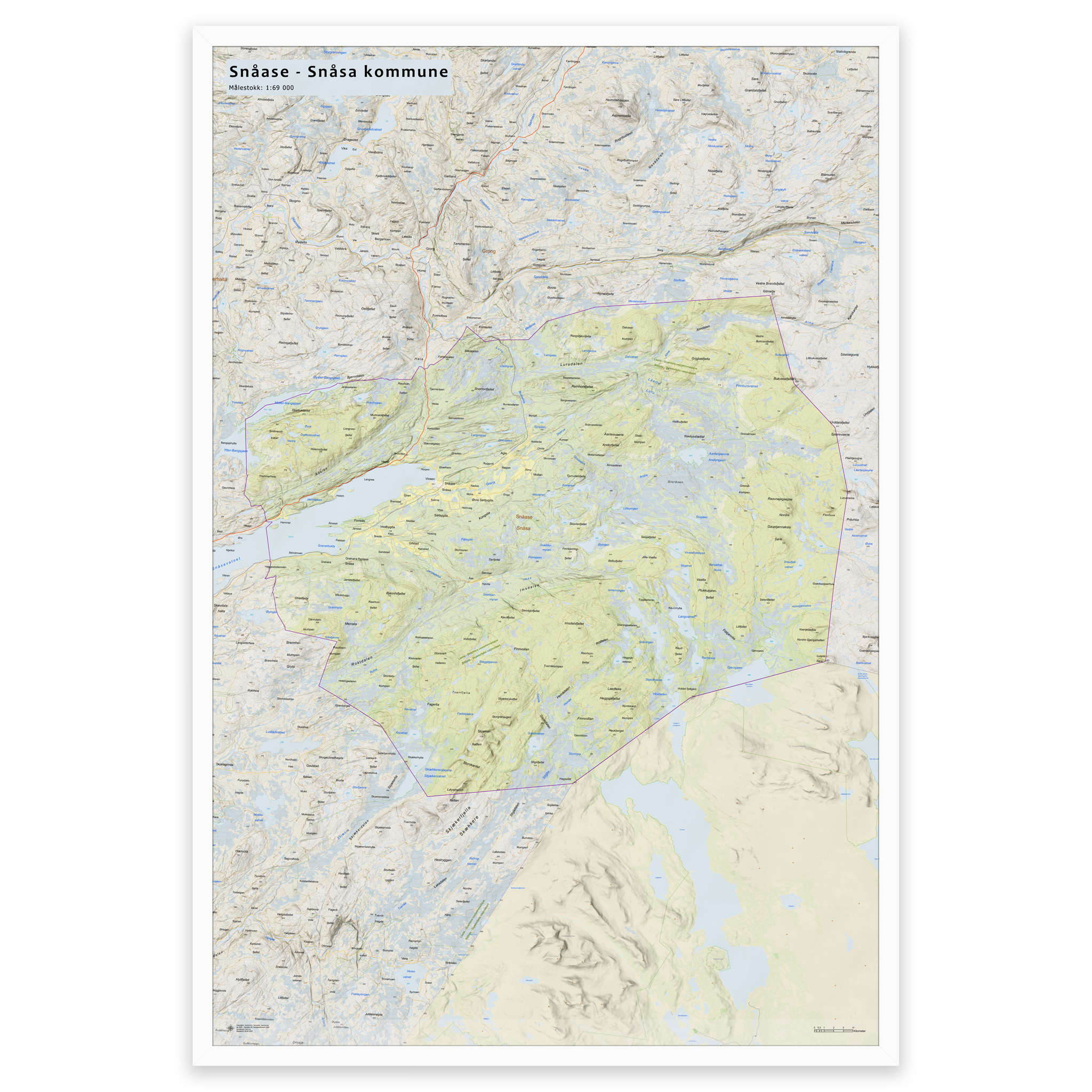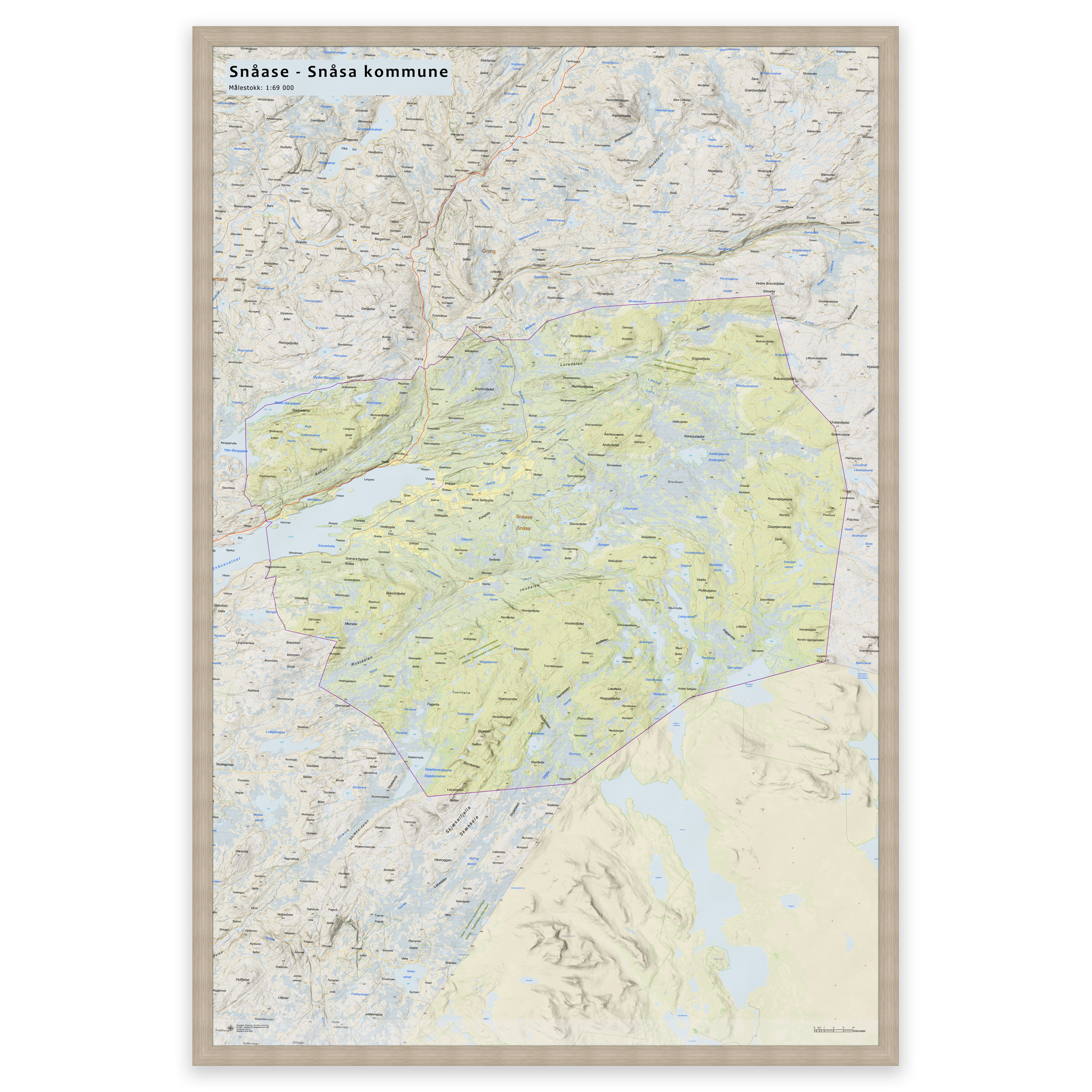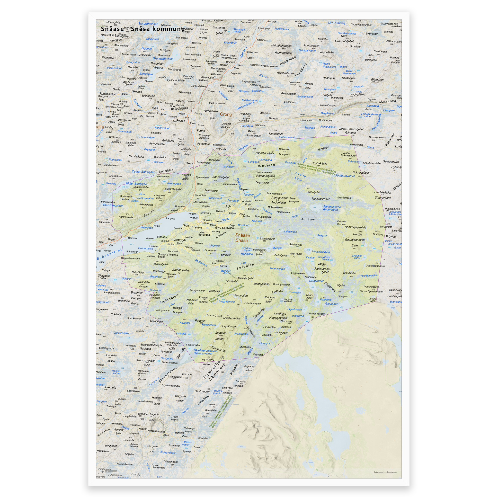 Stilrent og detaljert kart over Snåsa kommune, tilgjengelig i fem størrelser. Kartet viser hele kommunen med tettsteder, fjorder, innsjøer og oppdaterte grenser mot nabokommunene, og lages på bestilling med de nyeste kartdataene fra Kartverket – alltid ajour med veinett, stedsnavn og administrative inndelinger. De topografiske terrengskyggene gir en naturtro og tredimensjonal effekt som gjengir landskapet rundt Snåsa på en elegant måte.