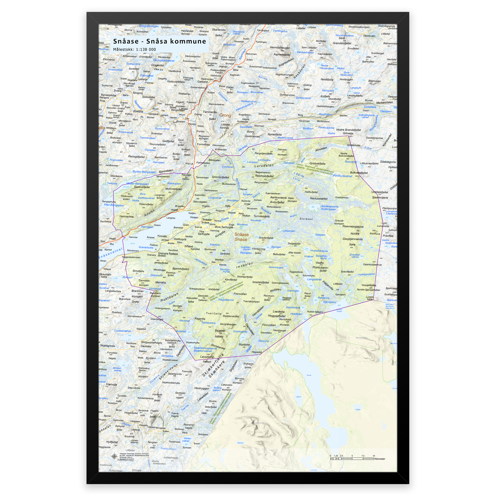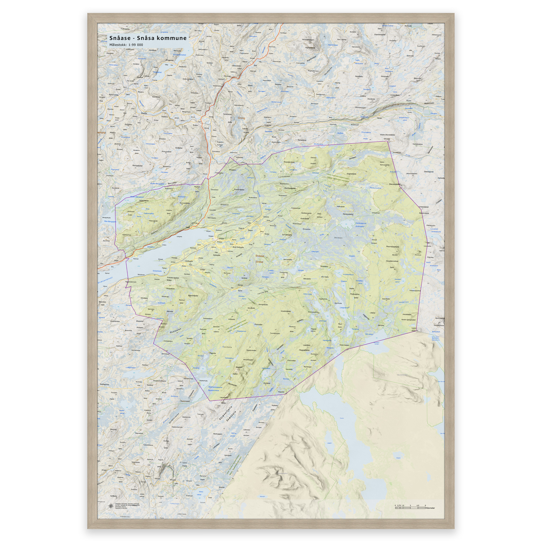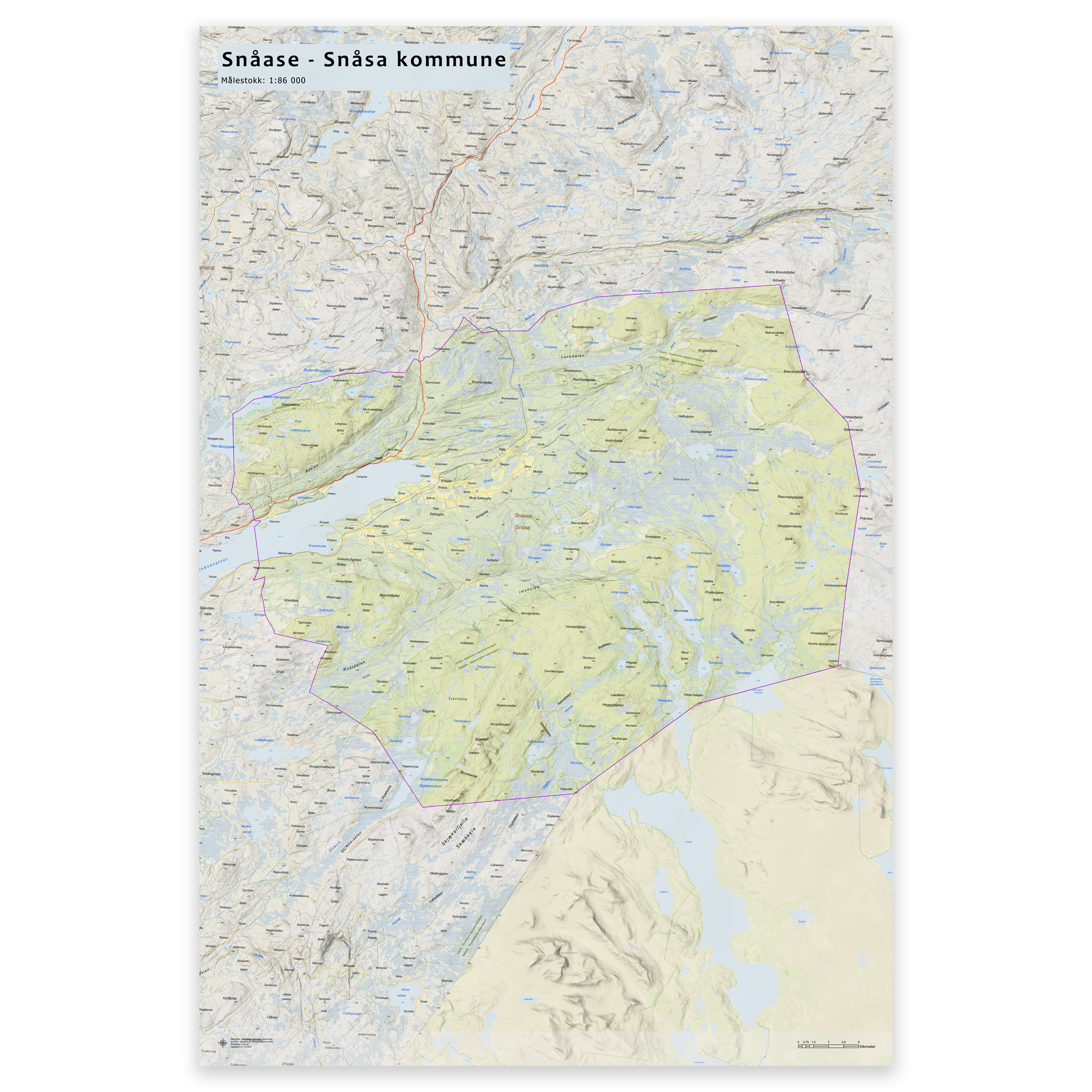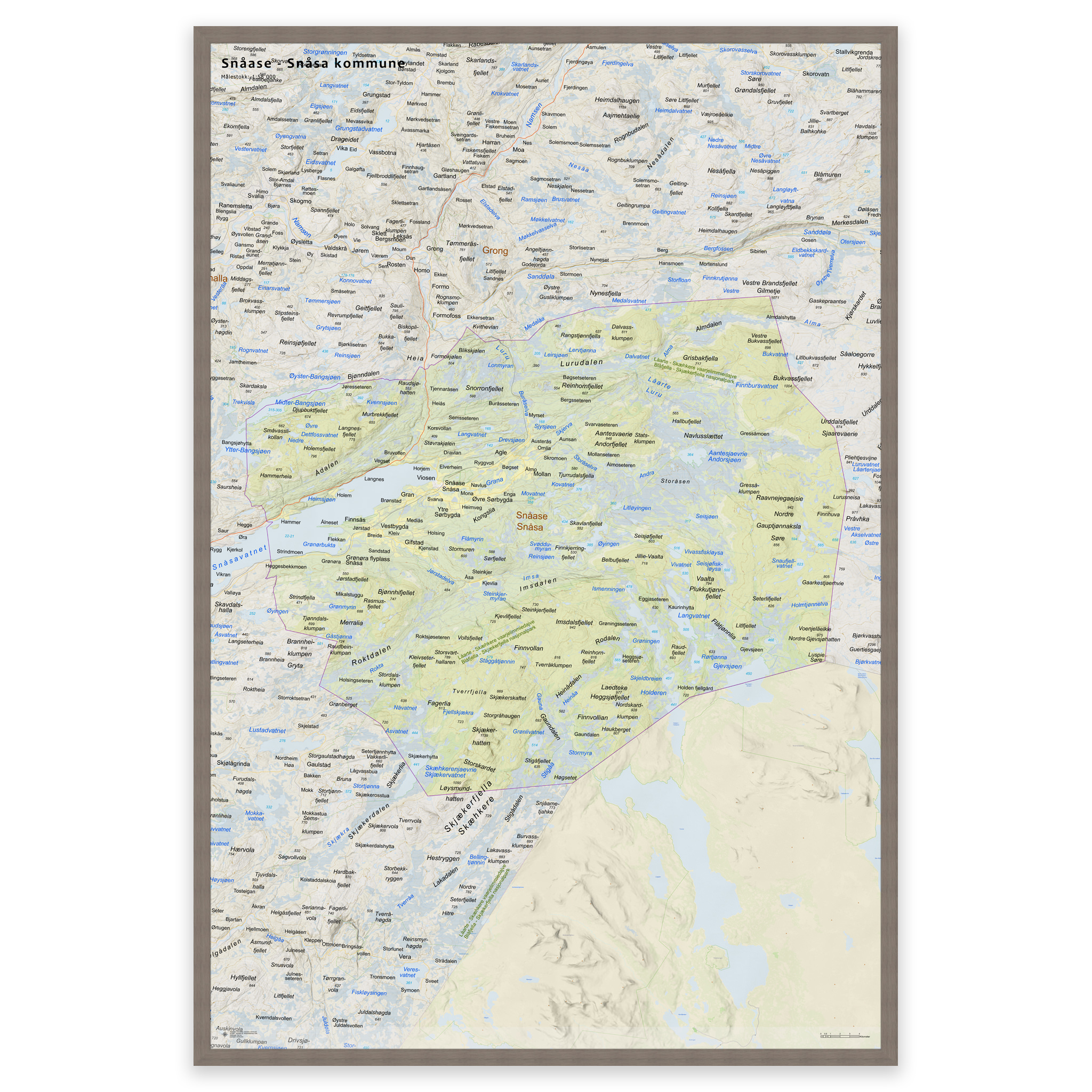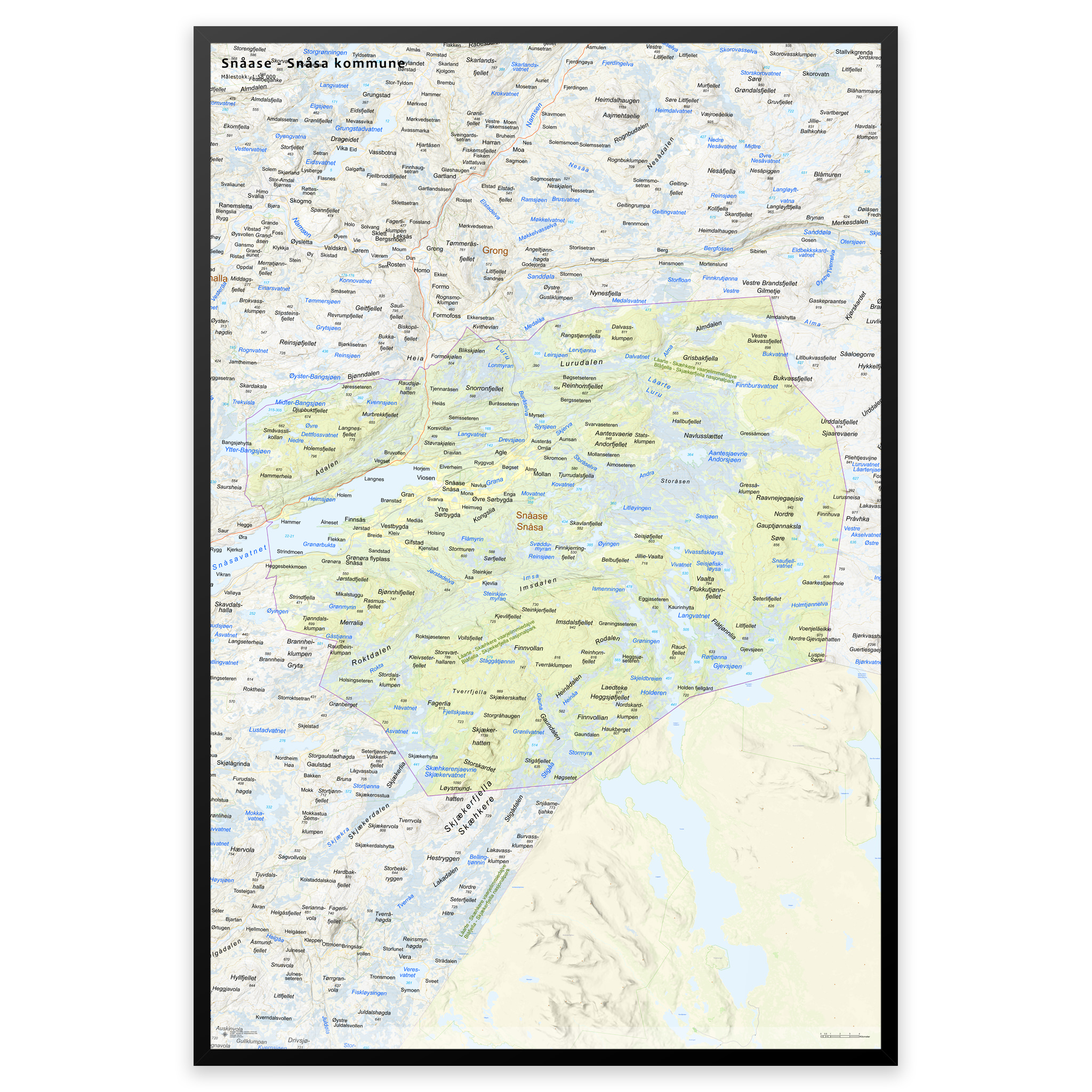 Stilrent og detaljert kart over Snåsa kommune, tilgjengelig i fem størrelser. Kartet viser hele kommunen med tettsteder, fjorder, innsjøer og oppdaterte grenser mot nabokommunene, og lages på bestilling med de nyeste kartdataene fra Kartverket – alltid ajour med veinett, stedsnavn og administrative inndelinger. De topografiske terrengskyggene gir en naturtro og tredimensjonal effekt som gjengir landskapet rundt Snåsa på en elegant måte.