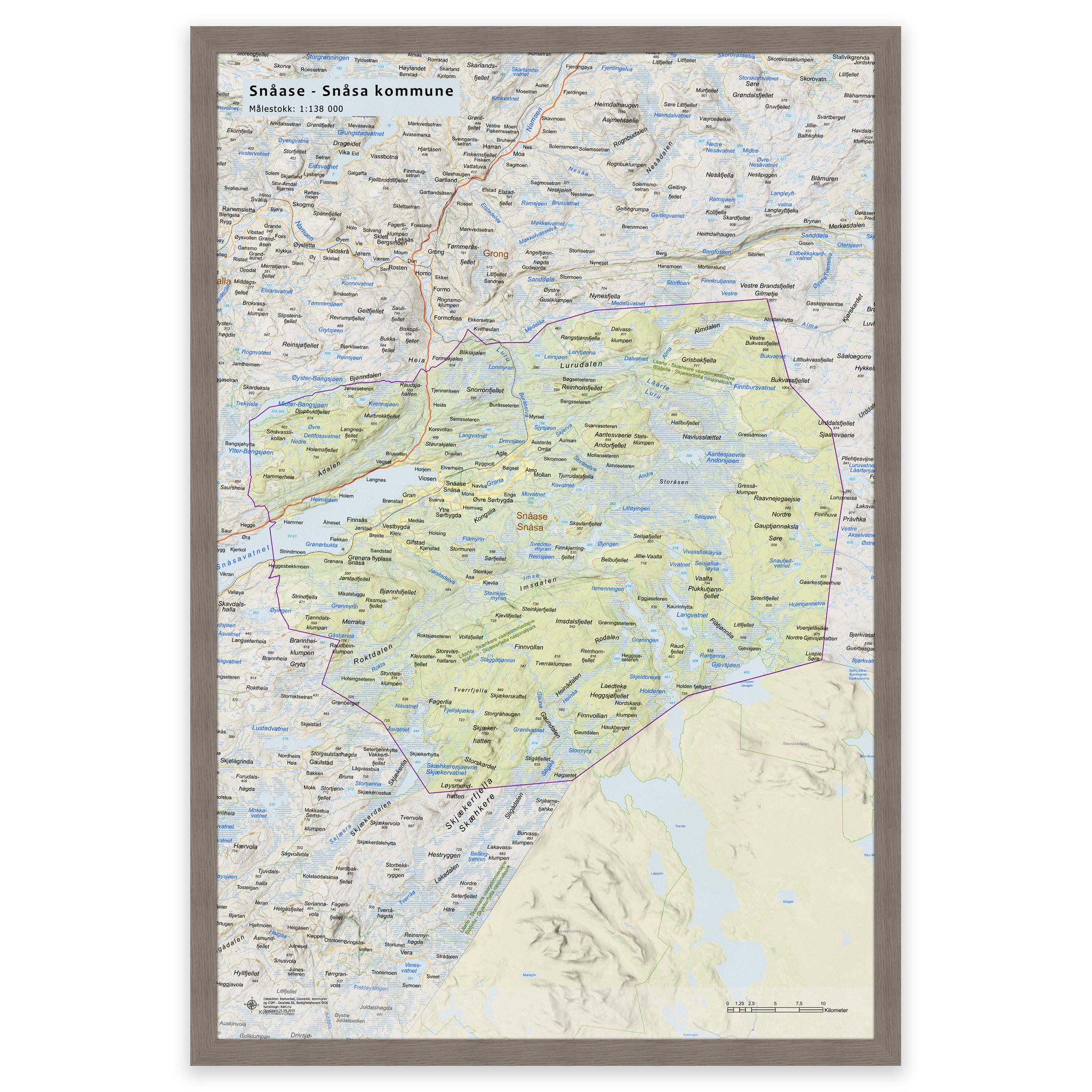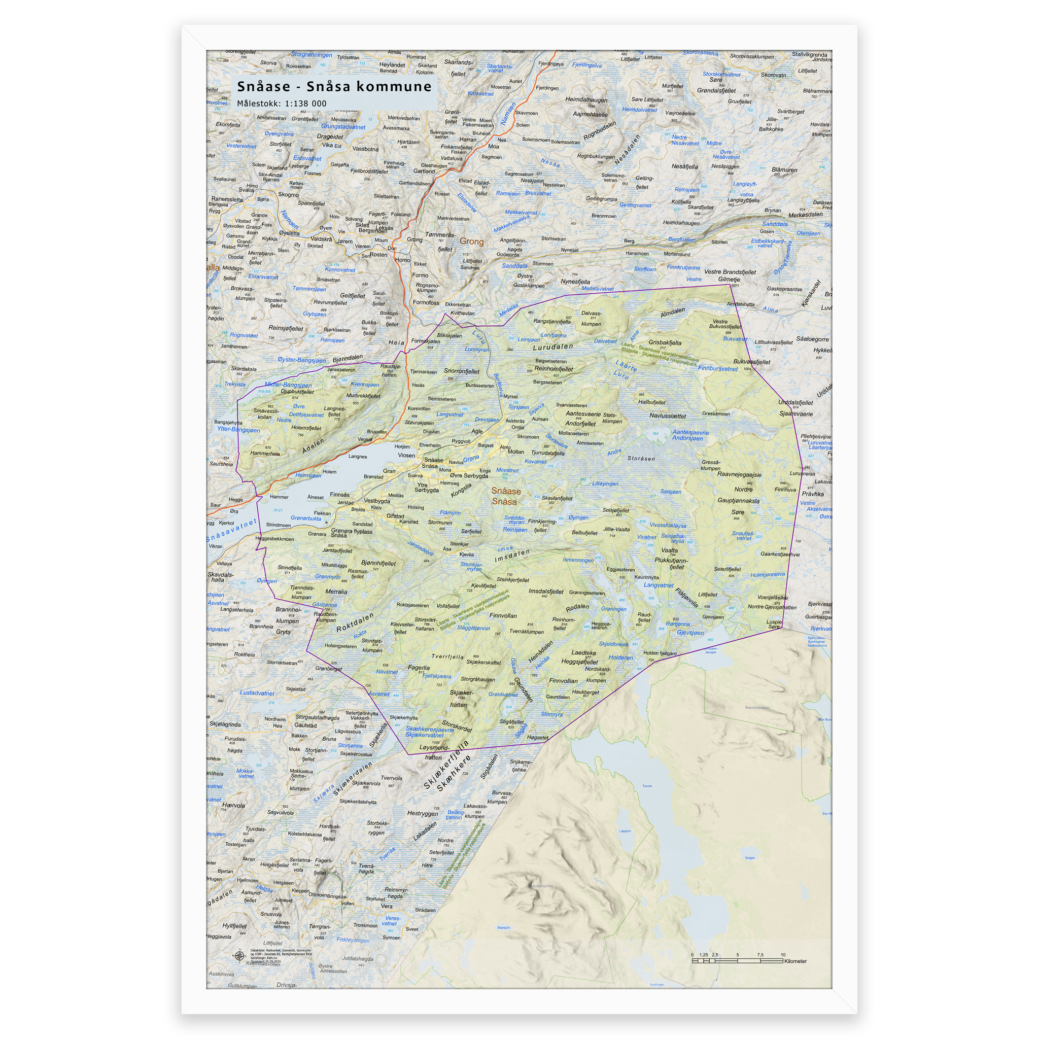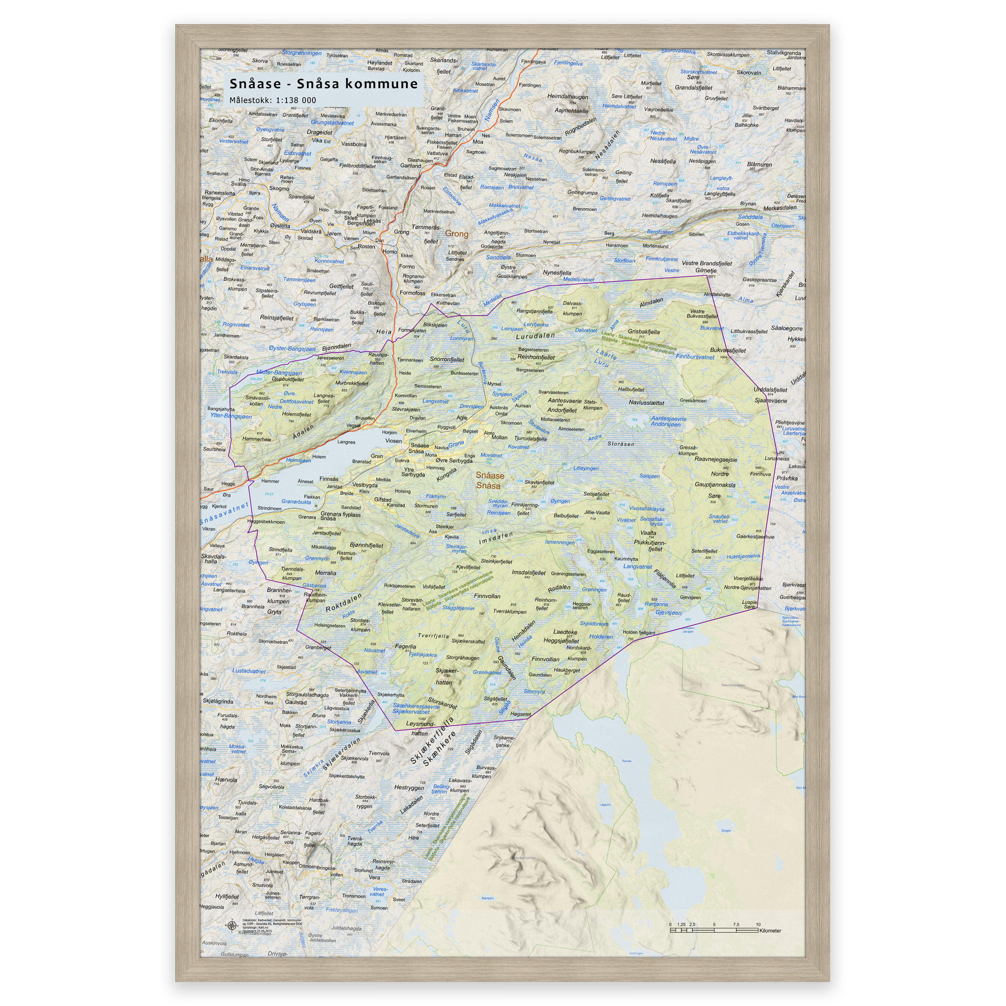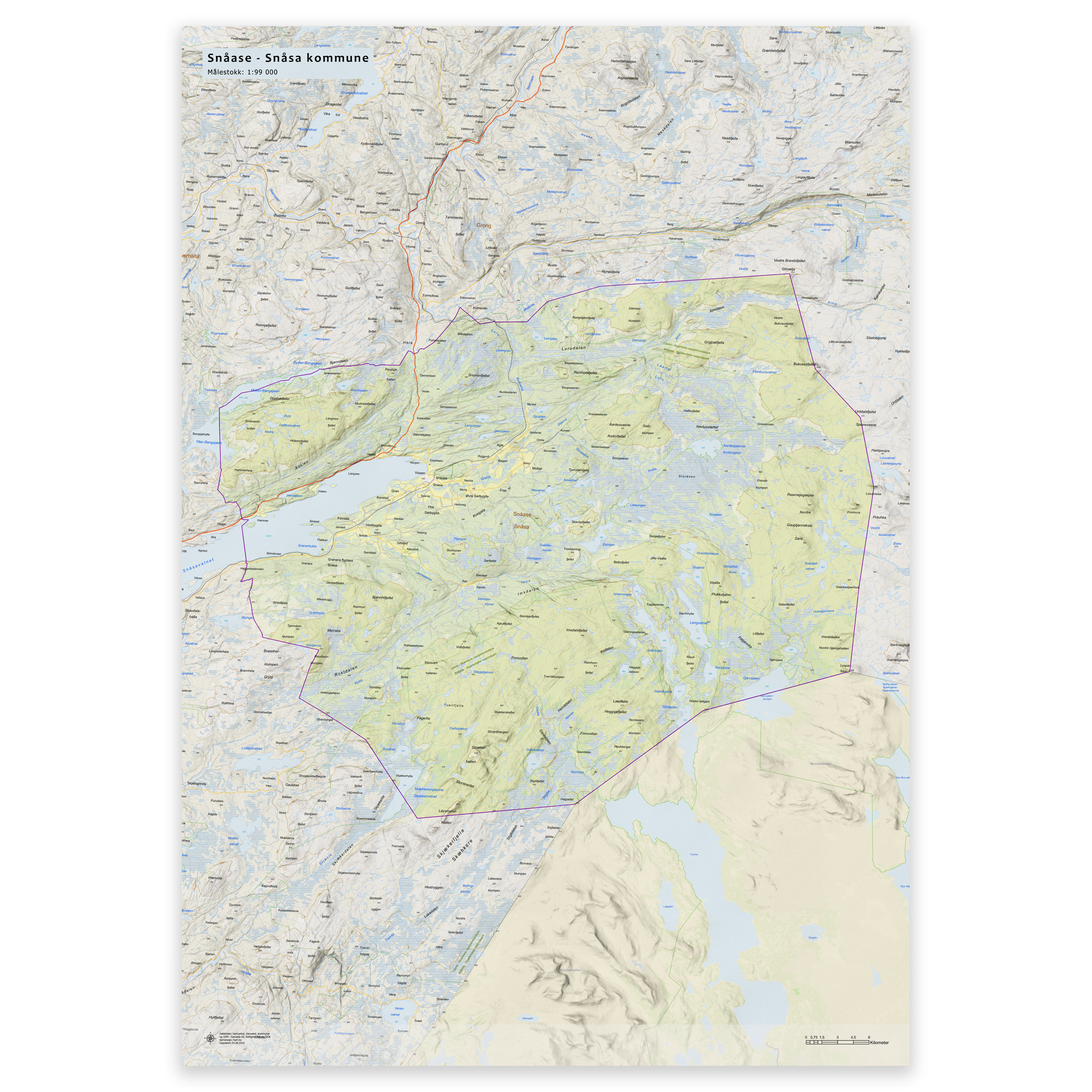 Stilrent og detaljert kart over Snåsa kommune, tilgjengelig i fem størrelser. Kartet viser hele kommunen med tettsteder, fjorder, innsjøer og oppdaterte grenser mot nabokommunene, og lages på bestilling med de nyeste kartdataene fra Kartverket – alltid ajour med veinett, stedsnavn og administrative inndelinger. De topografiske terrengskyggene gir en naturtro og tredimensjonal effekt som gjengir landskapet rundt Snåsa på en elegant måte.