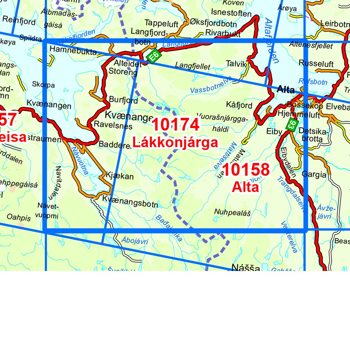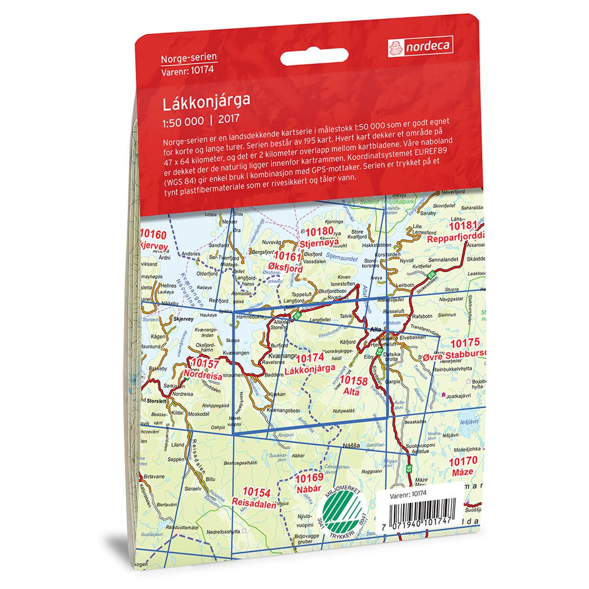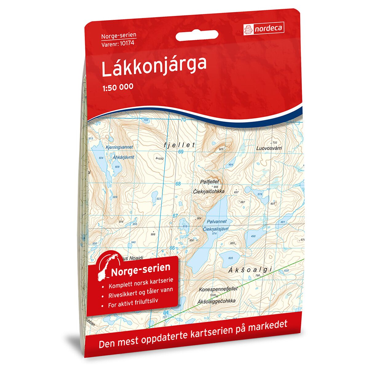 Norge-serie kartet Lakkonjarga i målestokk 1:50 000 er trykket på et slitesterkt resirkulerbart plastfibermaterial som tåler vann. Kartet egner seg for turgåere, jegere, fiskere og brukes blant annet av redningskorpsene. Norge-serien er en landsdekkende kartserie og er derfor også populær for de som går lengre turer. Overlapp på alle kart gjør det enkelt å navigere mellom kartene.