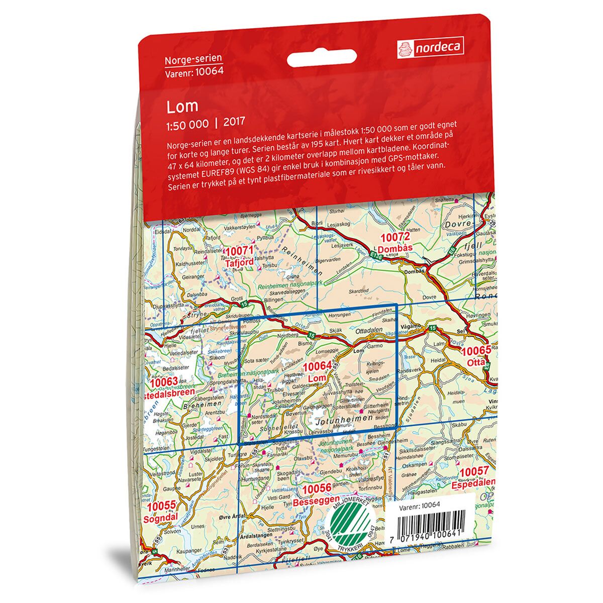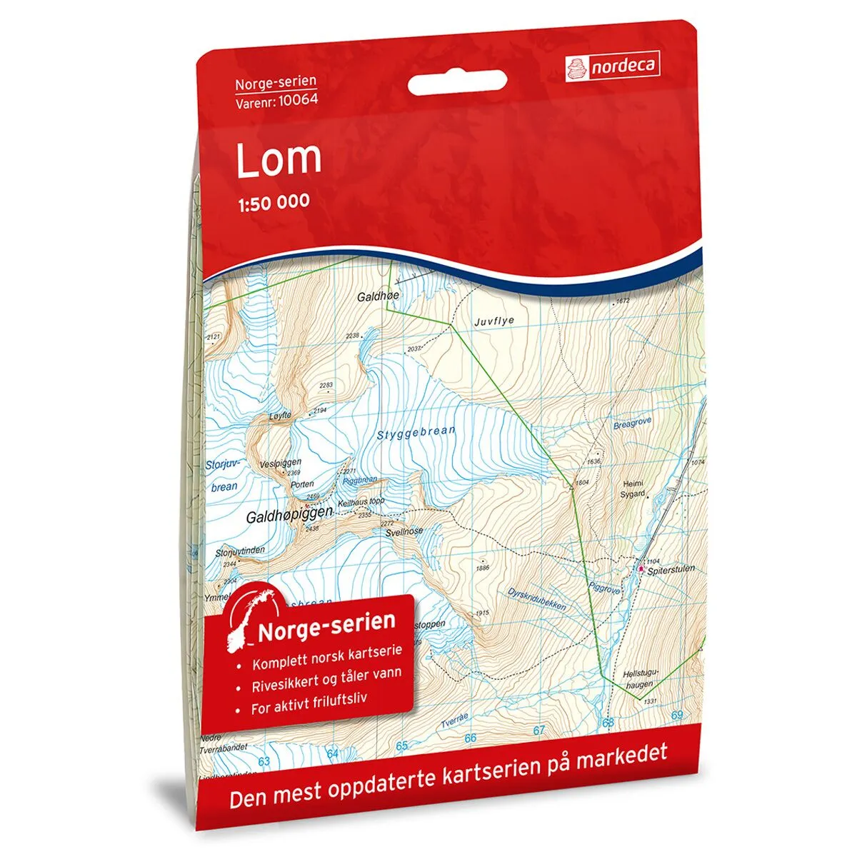 Dette kartet dekker området Lom og er en del av Norge-serien – de ikoniske røde turkartene som i flere generasjoner har vært brukt av turfolk over hele landet. Norge-serien er den eneste turkartserien som dekker hele Norge, fra Lindesnes til Nordkapp.