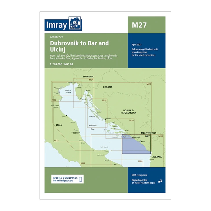 Dette oversiktskartet fra Imray dekker kyststrekningen fra Dubrovnik i Kroatia til Bar og Ulcinj i Montenegro, samt tilhørende farvann i det sørlige Adriaterhavet. Kartet inkluderer planoversikter og innseilinger til viktige havner og ankringsområder, blant annet Dubrovnik, Kotorbukta, Budva, Bar Marina og Ulcinj.