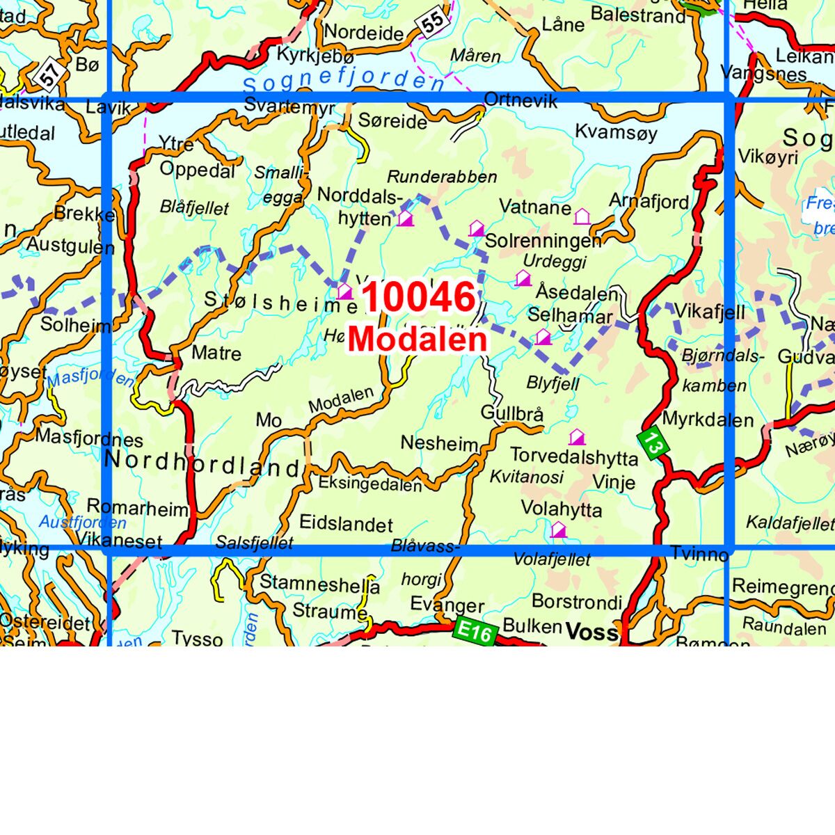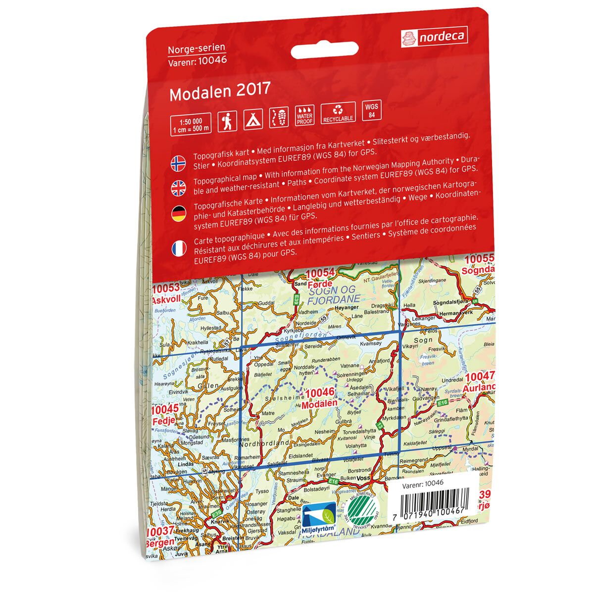 Norge-serie kartet Modalen i målestokk 1:50 000 er trykket på et slitesterkt resirkulerbart plastfibermaterial som tåler vann. Kartet egner seg for turgåere, jegere, fiskere og brukes blant annet av redningskorpsene. Norge-serien er en landsdekkende kartserie og er derfor også populær for de som går lengre turer. Overlapp på alle kart gjør det enkelt å navigere mellom kartene.
