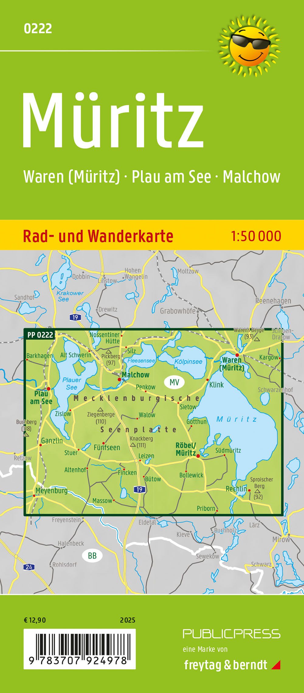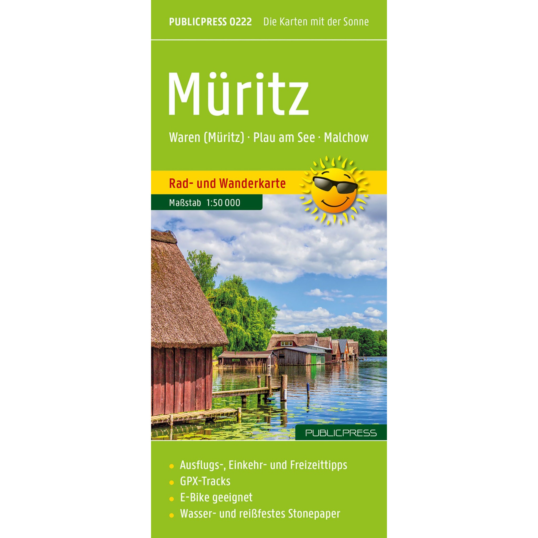Kartet viser et tett nett av lokale og regionale sykkelruter, vandrestier og forbindelser mellom tettsteder, innsjøer og naturområder. Områder som Waren (Müritz), Malchow og Plau am See er tydelig dekket, og kartet inkluderer også deler av Müritz nasjonalpark. På baksiden av kartet er viktige utfluktsmål og severdigheter kort beskrevet, noe som gir nyttig tilleggsinformasjon underveis.