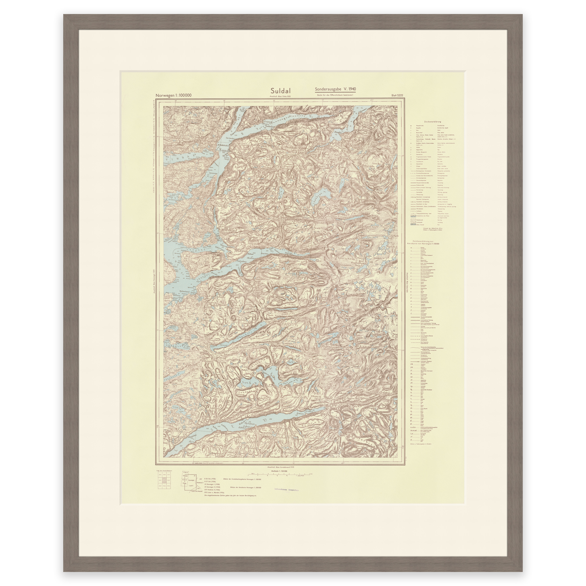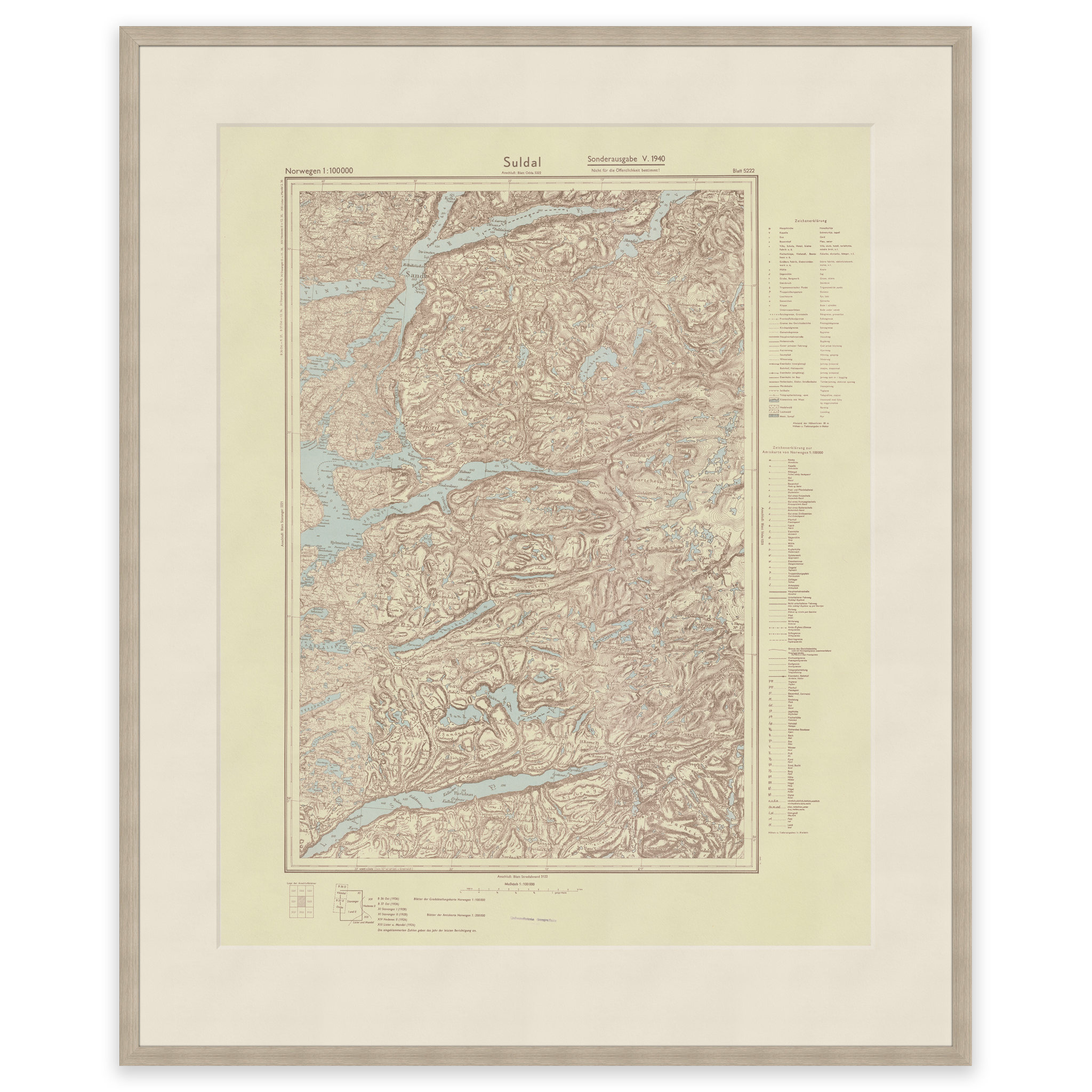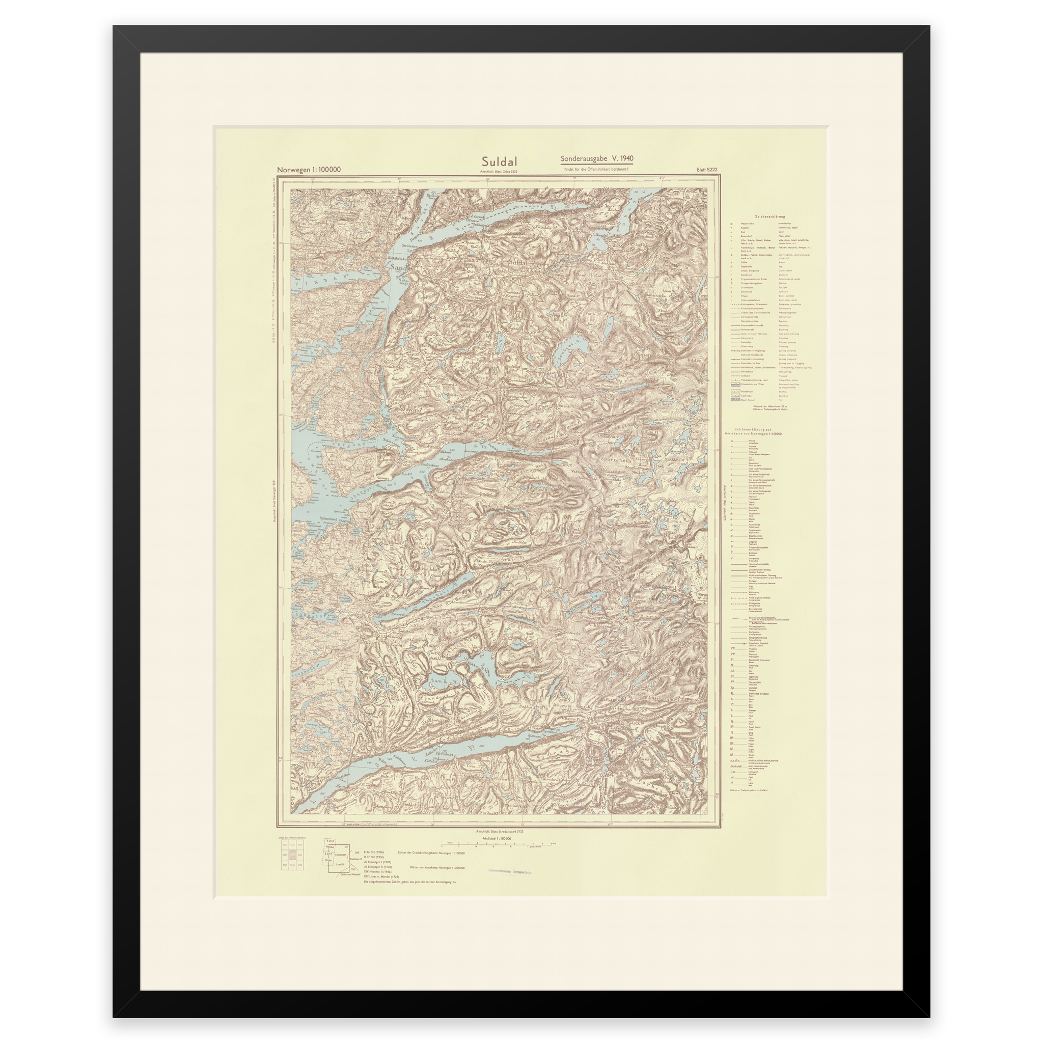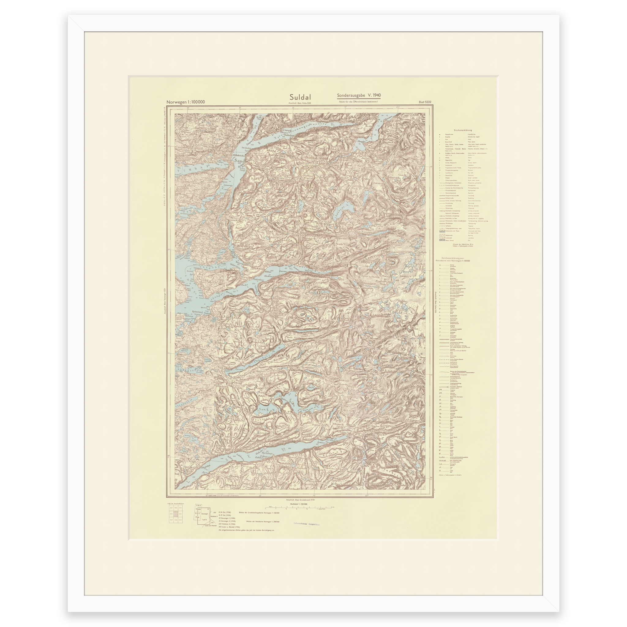 Kart over Suldal utgitt i 1940. Kartet leveres i originalstørrelse 79,1 x 70,3 cm. Størrelsen med ramme og passepartout er 99,1 x 92,3 cm. Ønsker du kartet i en annen størrelse? Bare ta kontakt – vi gir deg gjerne et pristilbud på tilpasning.