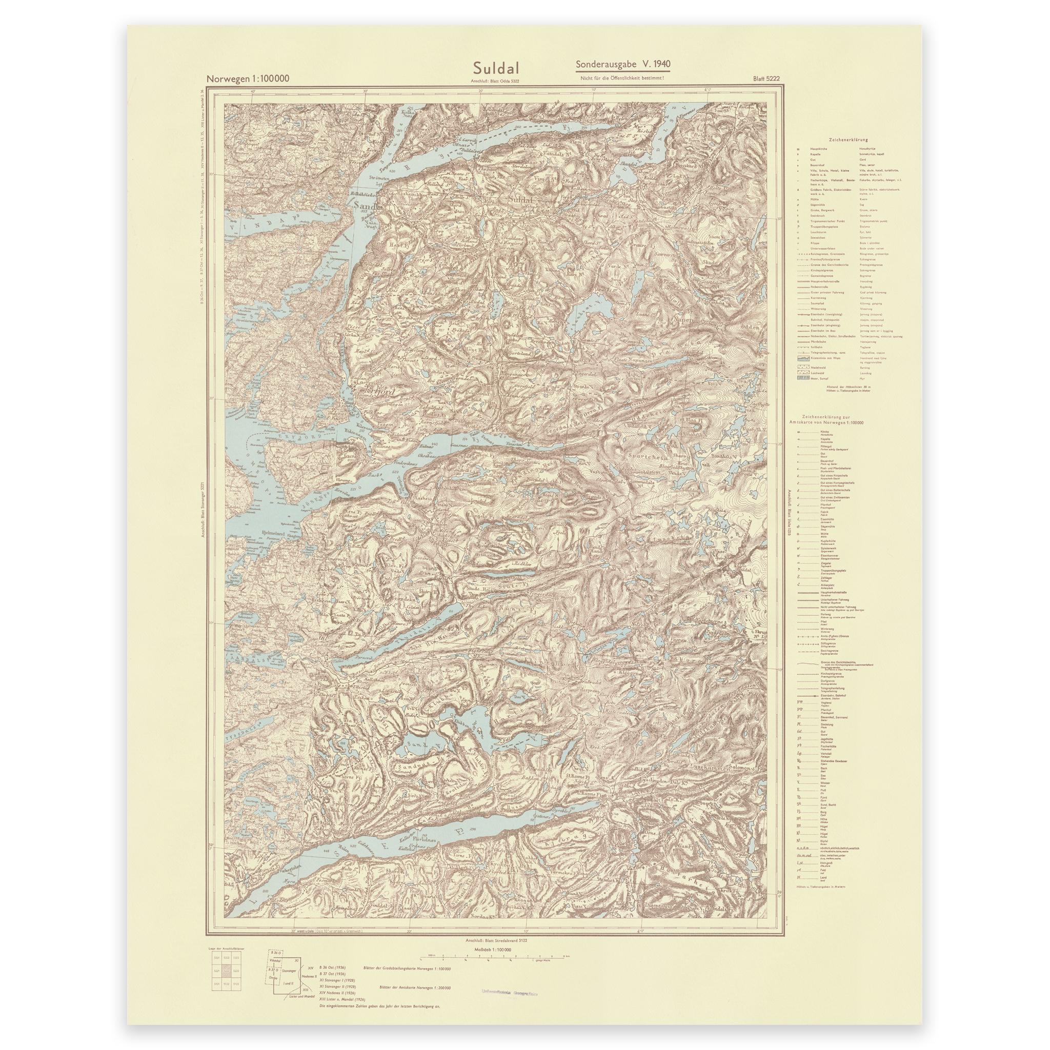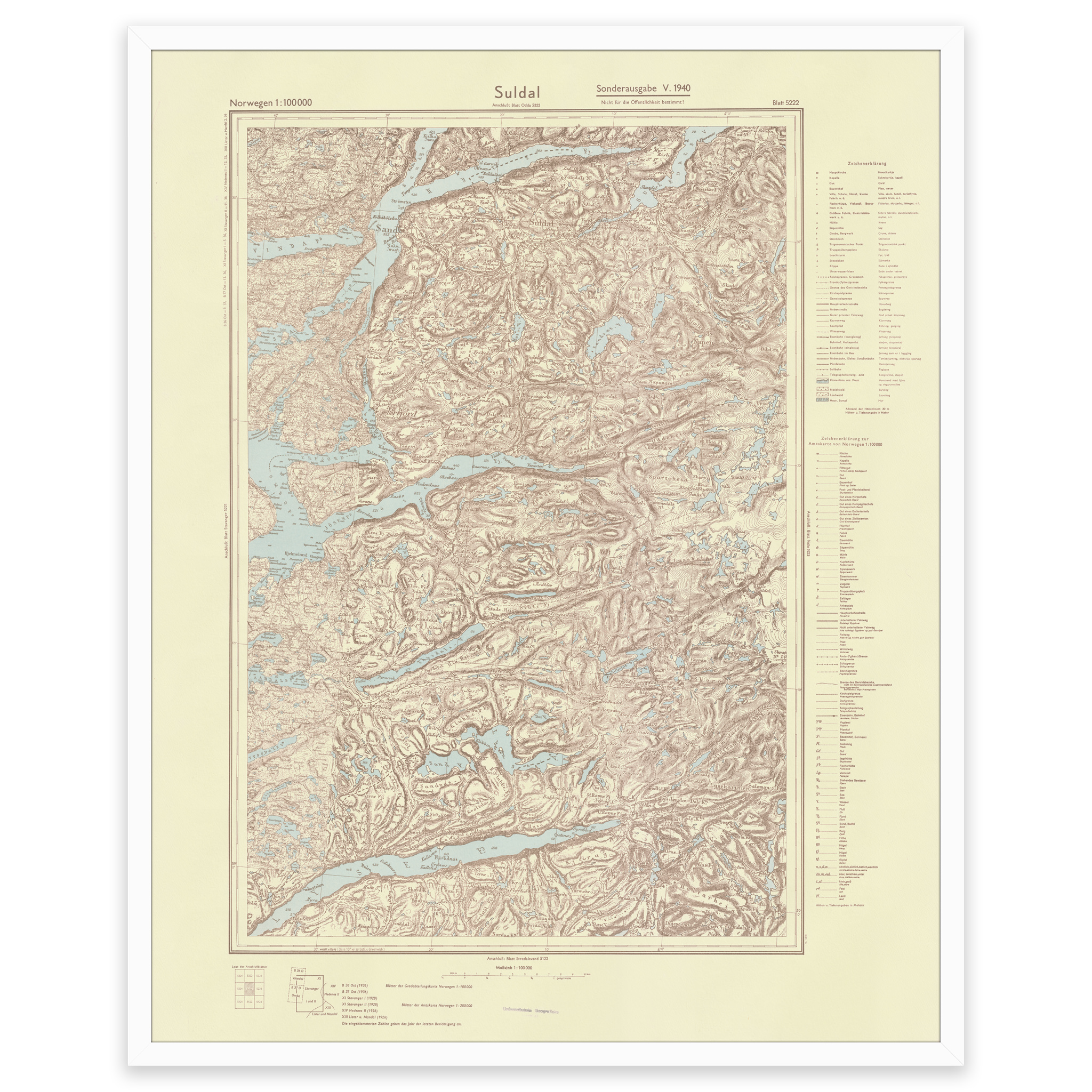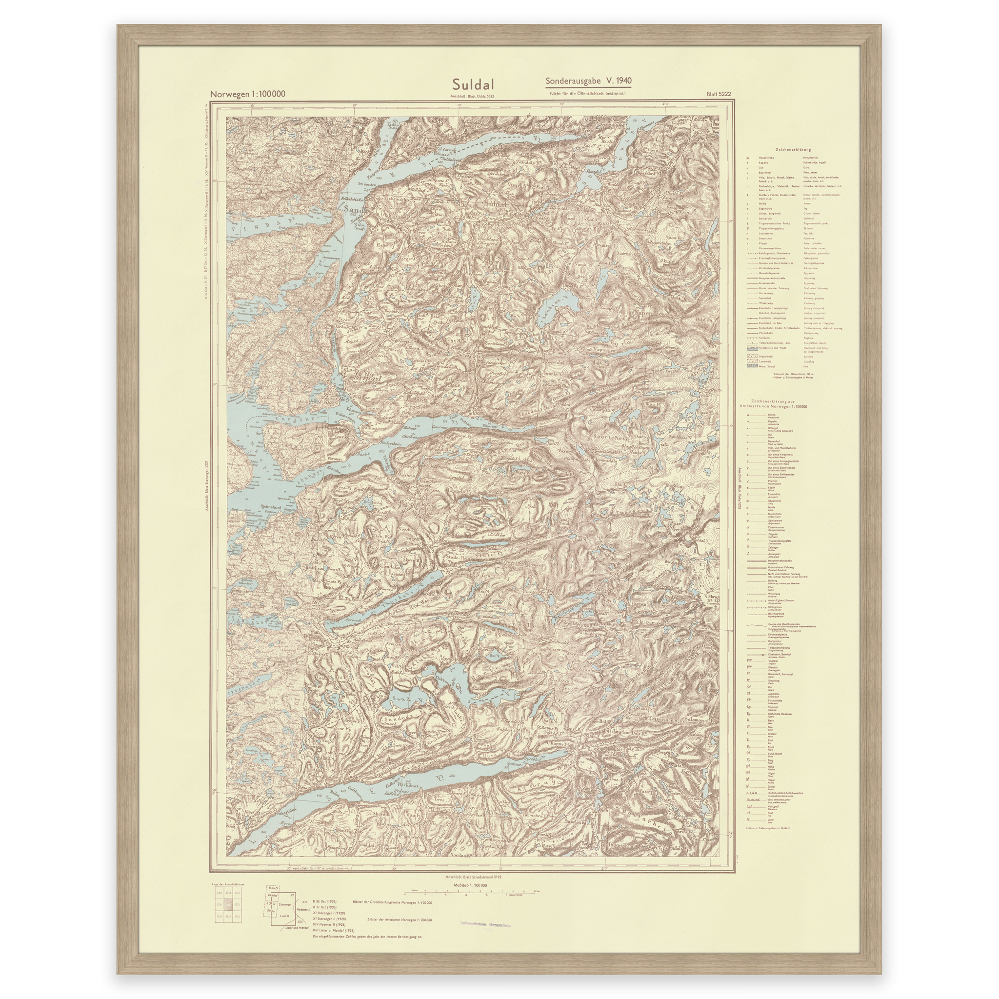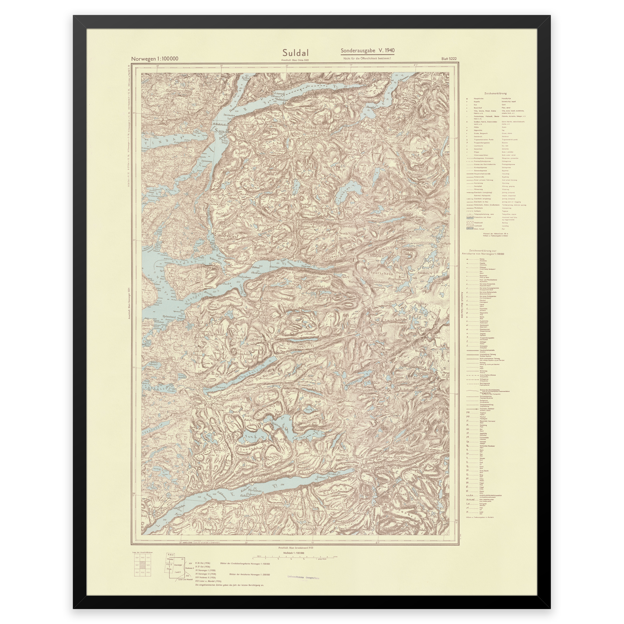 Kart over Suldal utgitt i 1940. Kartet leveres i originalstørrelse 79,1 x 70,3 cm. Størrelsen med ramme og passepartout er 99,1 x 92,3 cm. Ønsker du kartet i en annen størrelse? Bare ta kontakt – vi gir deg gjerne et pristilbud på tilpasning.