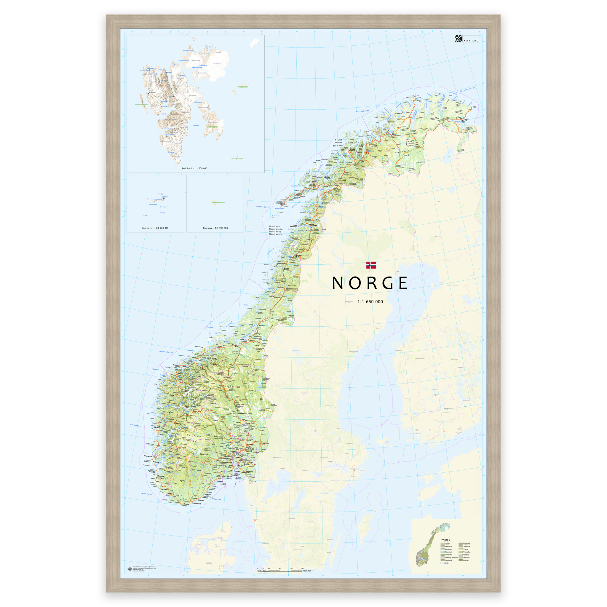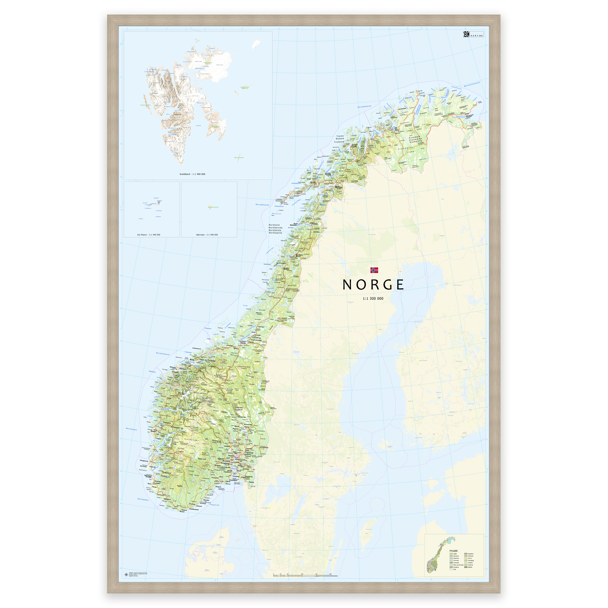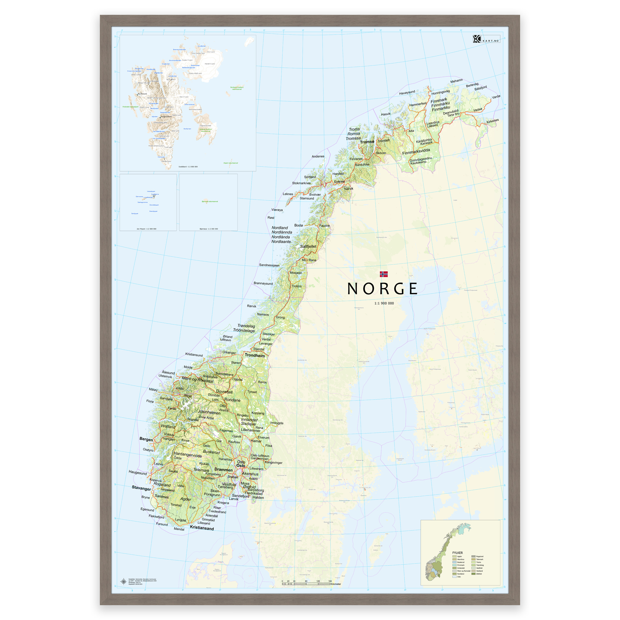 Dekker hele Norge – inkludert Svalbard – med oppdaterte navn og fylkesgrenser. De topografiske terrengskyggene gir en naturtro og tredimensjonal effekt.