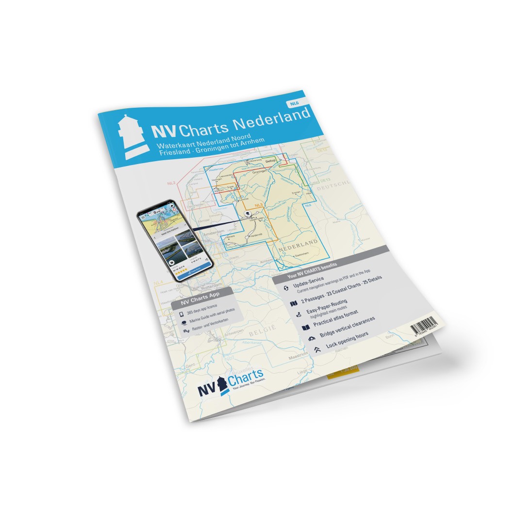 NV Charts NL6 Nederland – Waterkaart Nederland Noord er et omfattende sjøkartsett med papirkart og digitale kart for de nordlige og sentrale delene av Nederlands indre farvann, fra Friesland og Groningen via Drenthe og Overijssel helt ned til Arnhem ved Rhinen. Kartene dekker elver, kanaler, innsjøer og innseilinger som er relevante for fritidsseiling og kanalcruise i dette vakre og sammenkoblede nettverket av vannveier.