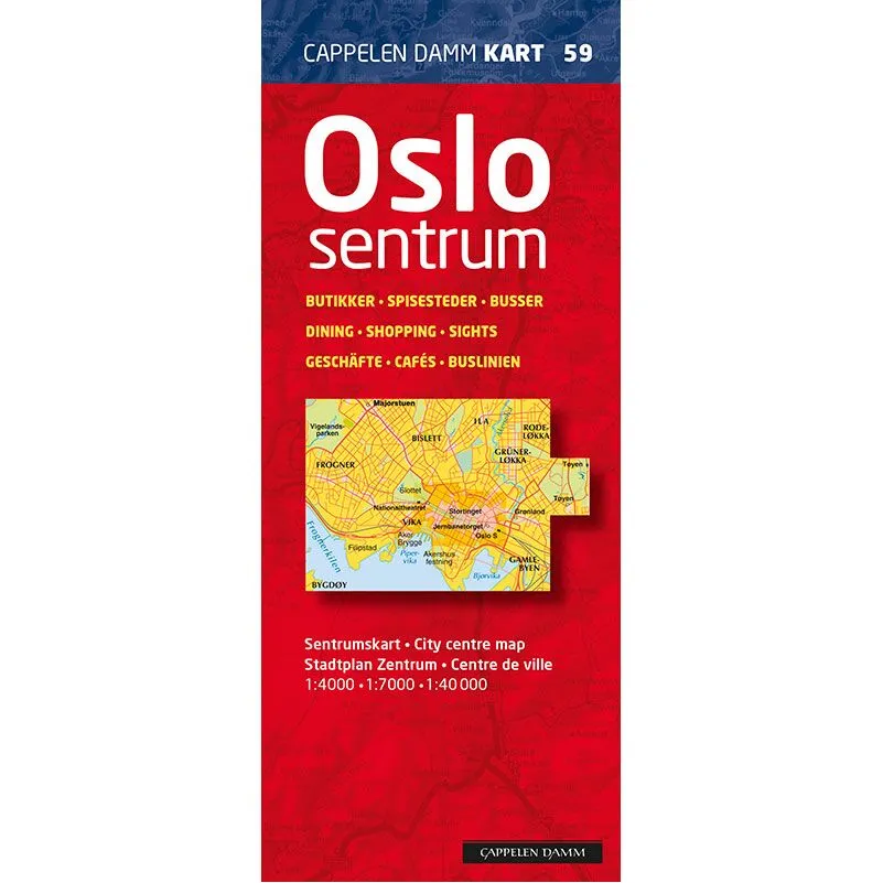 Svært detaljert sentrumskart med navn på spise- og utesteder, statuer og butikker. Trikke- og bussholdeplasser med rutenummer. Kartet er oppdatert med de store forandringene under covid-pandemien. Detailed map of downtown Oslo, showing shops, restaurants, pubs, hotels and bus/tram stops. Updated with lots of covid pandemy changes. Oppdatert i 2022.