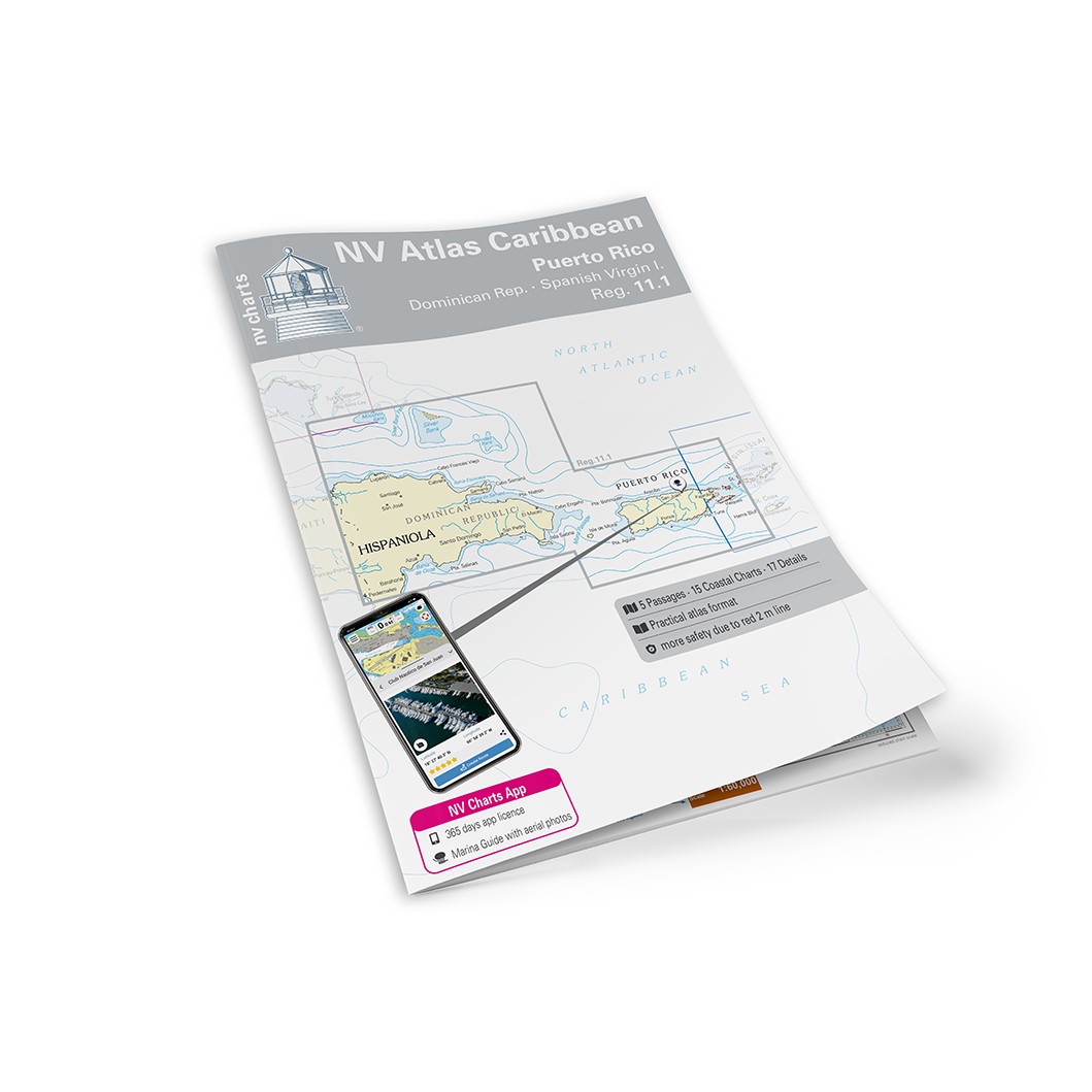 NV Charts Caribbean 11.1 Puerto Rico–Dominican Republic–Spanish Virgin Islands er en komplett kombipakke med papirkart i atlasformat og digitale sjøkart (NV Charts-app / PC / Mac) for seilas i området rundt Puerto Rico, Den dominikanske republikk og de spanske Jomfruøyene (Vieques og Culebra). Kartene er laget for fritidsbåt og turseiling, med tydelig oppsett som gjør det raskt å finne innseilinger, havner og ankringsplasser – både på papir og i appen.