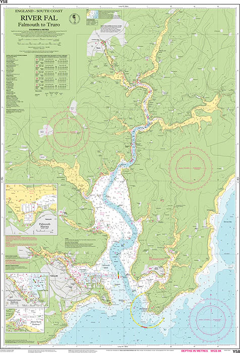 Kartet inkluderer følgende dekning: innseilingen til River Fal fra kysten og videre oppover elveløpet med navigasjonsdetaljer. I tillegg inngår detaljerte havneplaner for blant annet Falmouth Yacht Marina, Falmouth Inner Harbour og Mylor Yacht Harbour, som gir god støtte ved anløp og manøvrering.