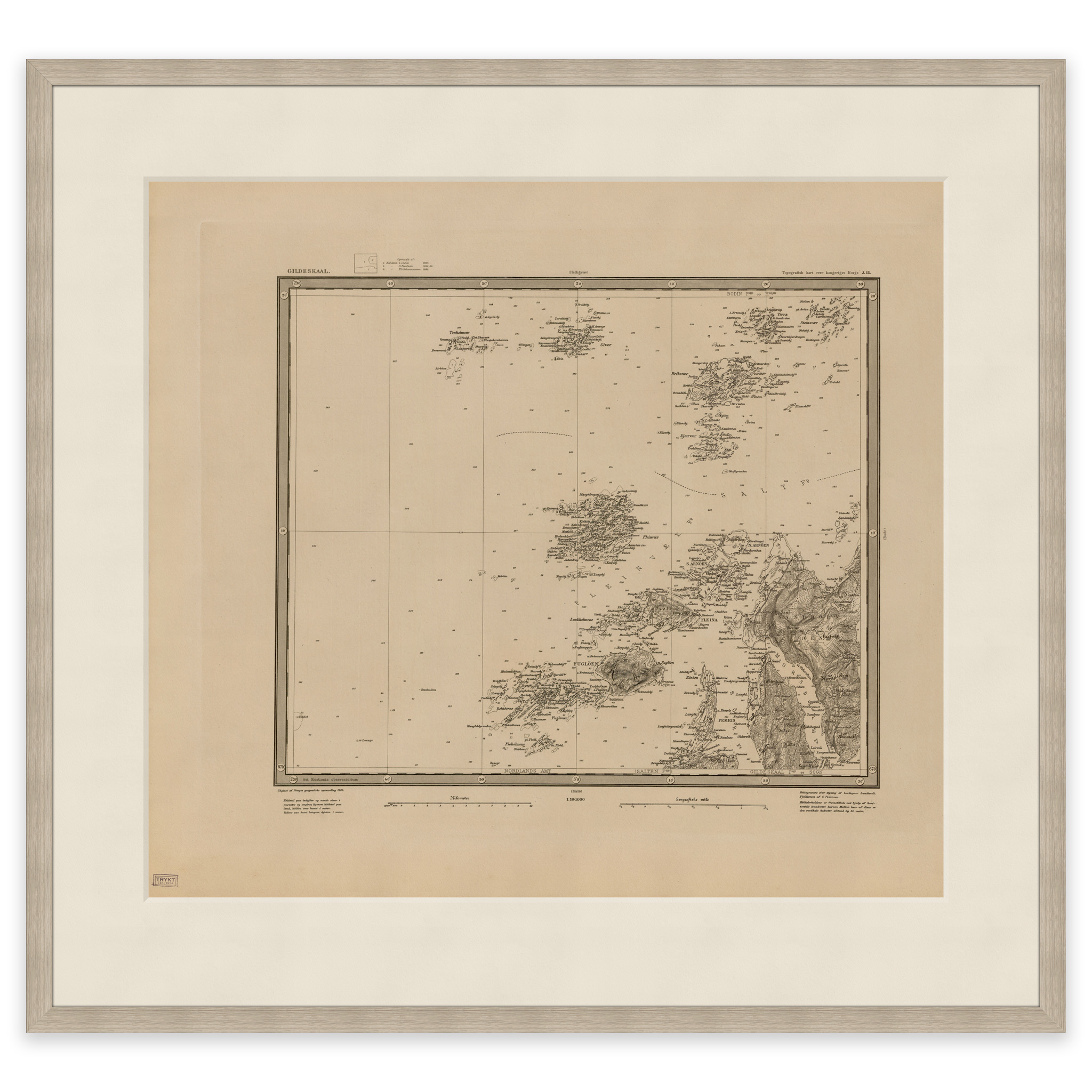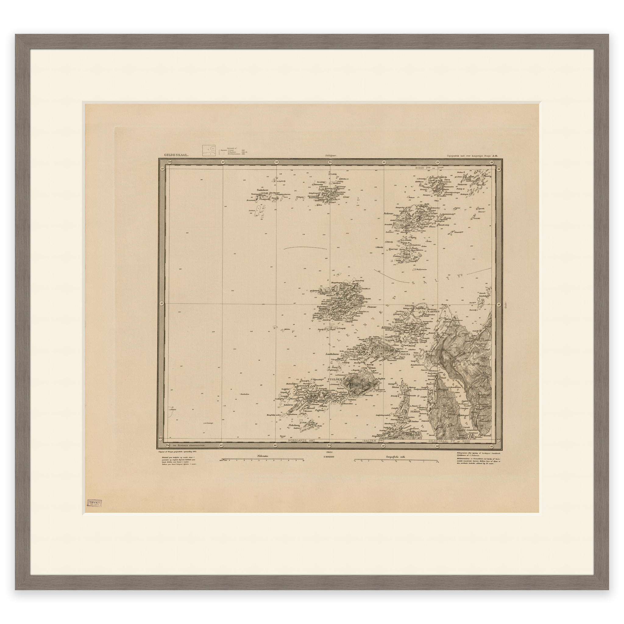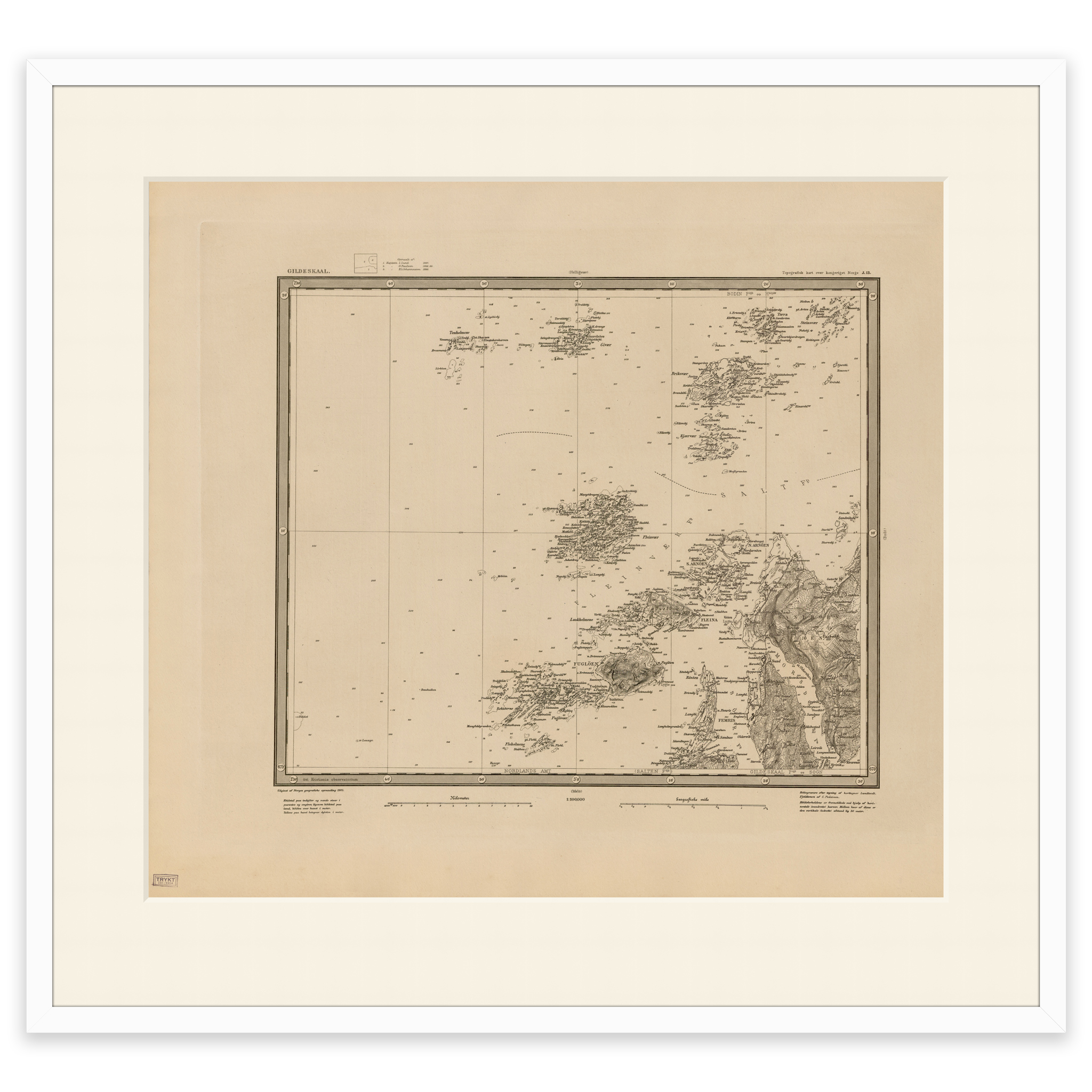 Kart over Gildeskål kommune fra 1903. Kartet leveres i originalstørrelse 61 x 54,9 cm. Størrelsen med ramme og passepartout er 79 x 73,9 cm. Ønsker du kartet i en annen størrelse? Bare ta kontakt – vi gir deg gjerne et pristilbud på tilpasning.