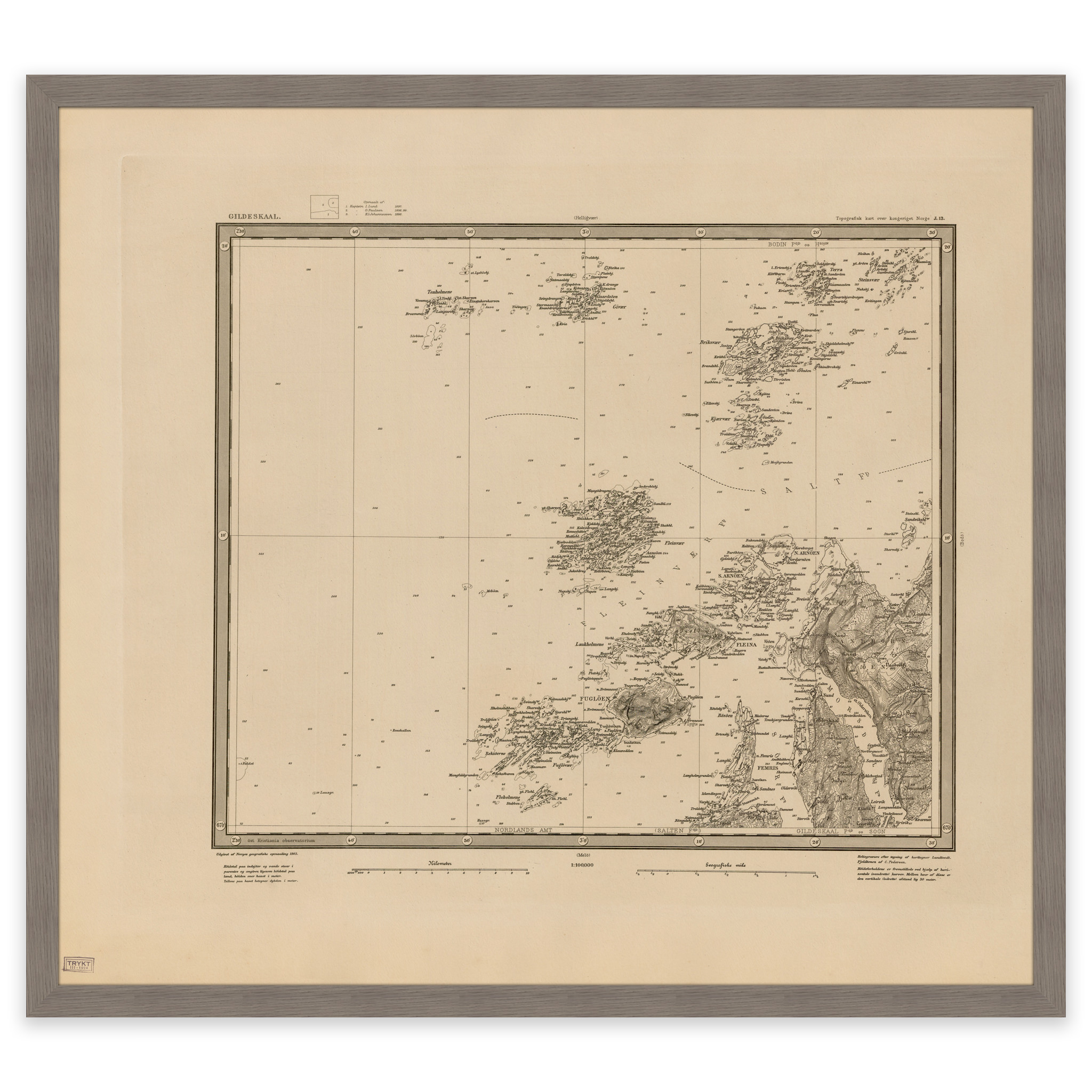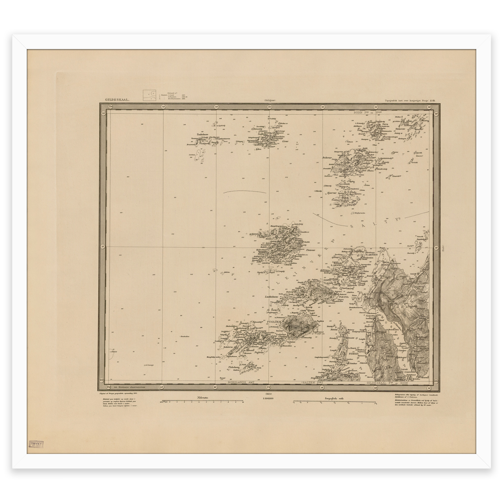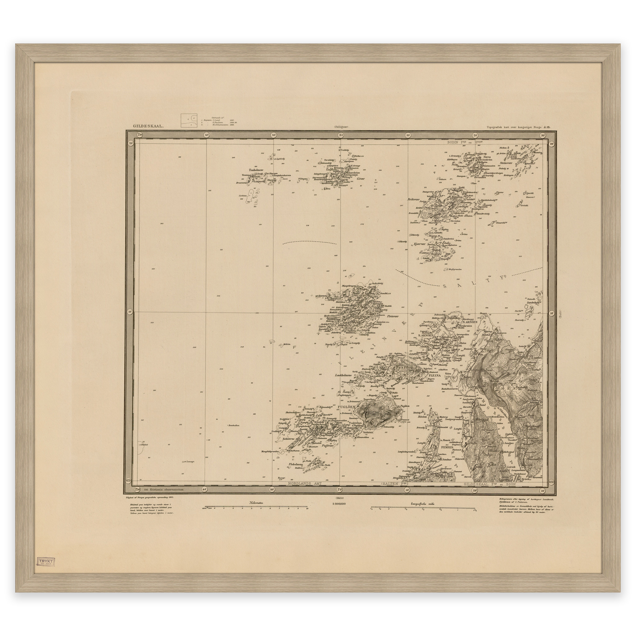 Kart over Gildeskål kommune fra 1903. Kartet leveres i originalstørrelse 61 x 54,9 cm. Størrelsen med ramme og passepartout er 79 x 73,9 cm. Ønsker du kartet i en annen størrelse? Bare ta kontakt – vi gir deg gjerne et pristilbud på tilpasning.