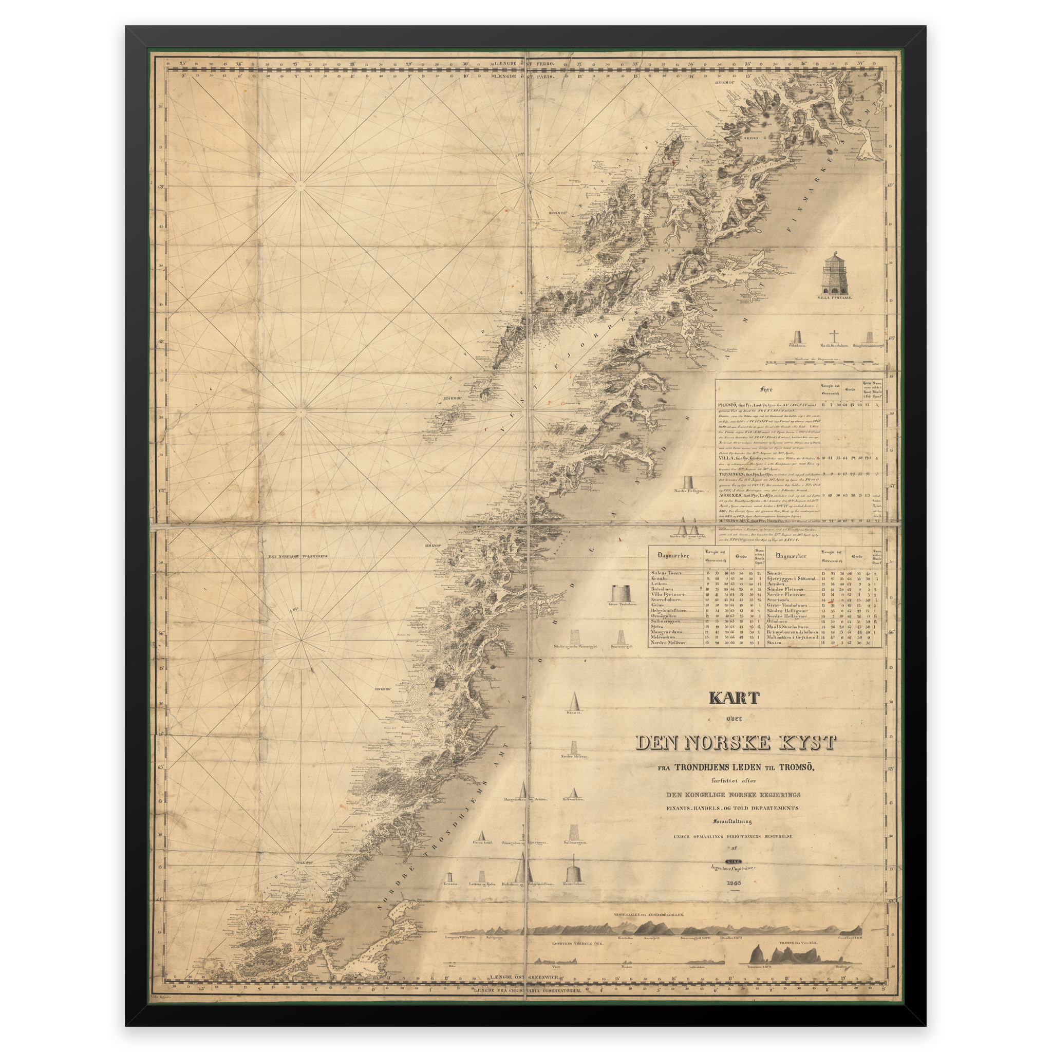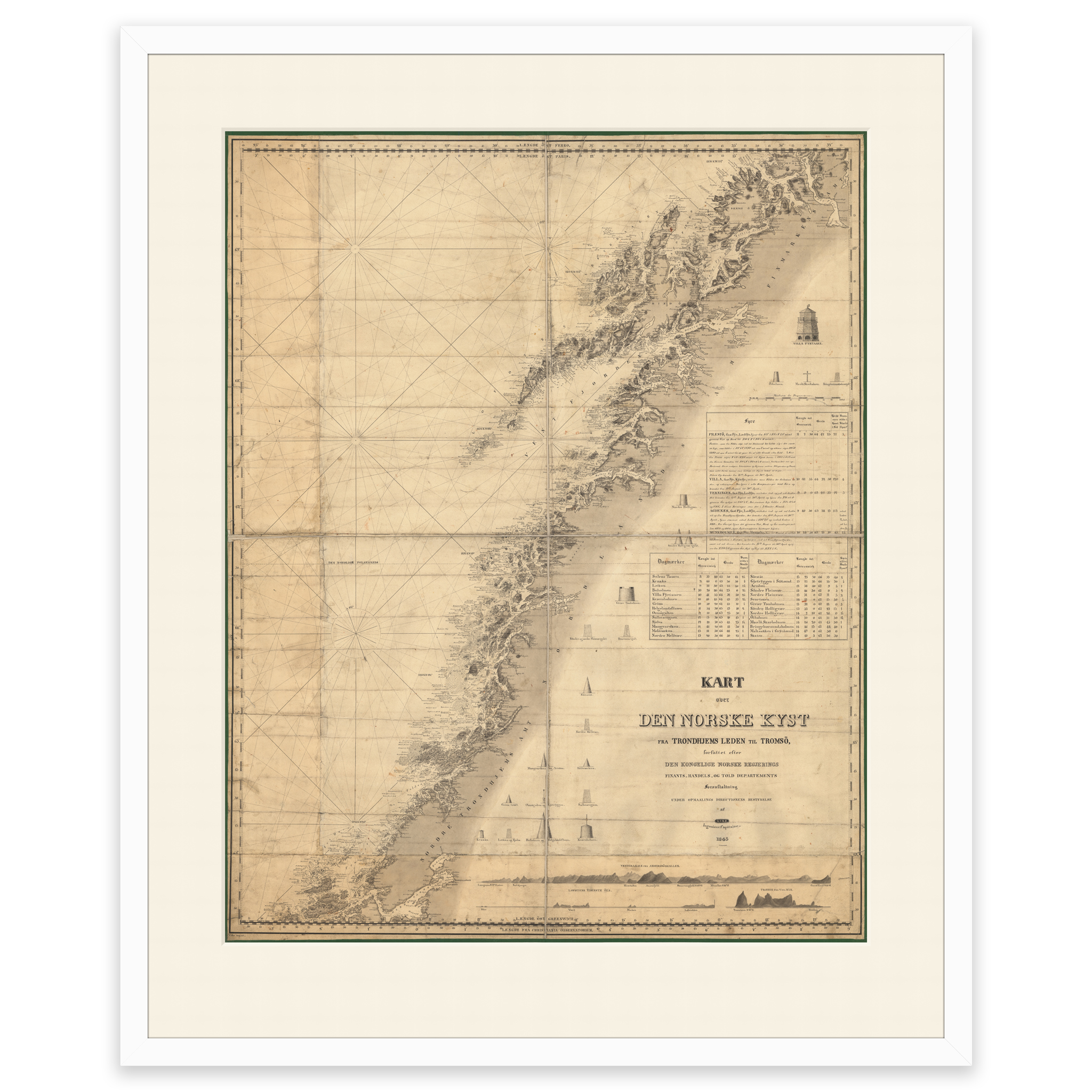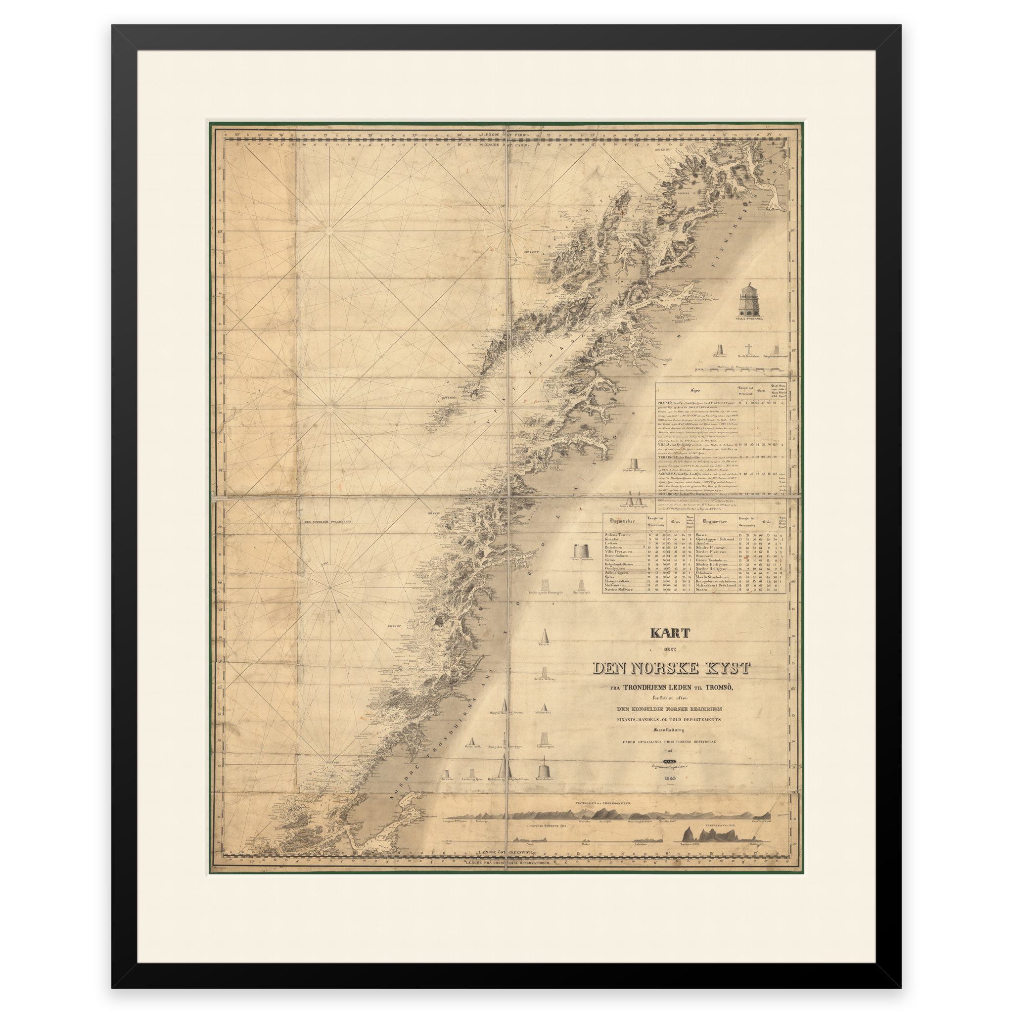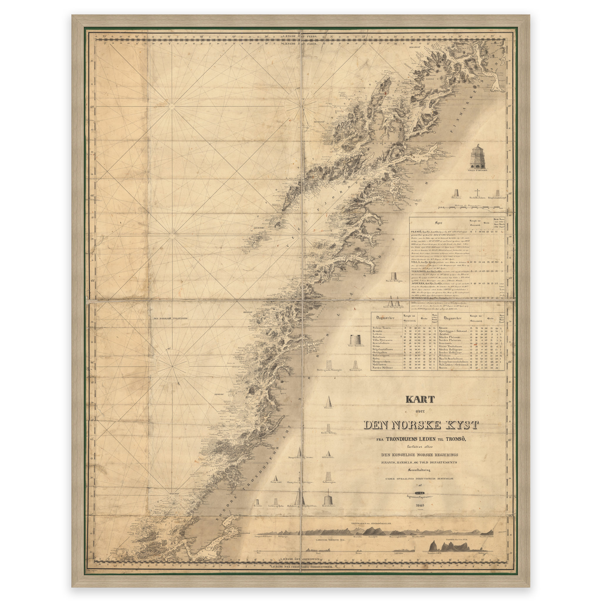 Håndtegnet kart fra 1845 over strekningen Hitra til Tromsø. Kartet leveres i originalstørrelse 67,7 x 87,1 cm. Størrelsen med ramme og passepartout er 87,7 x 109,1 cm. Ønsker du kartet i en annen størrelse? Bare ta kontakt – vi gir deg gjerne et pristilbud på tilpasning.