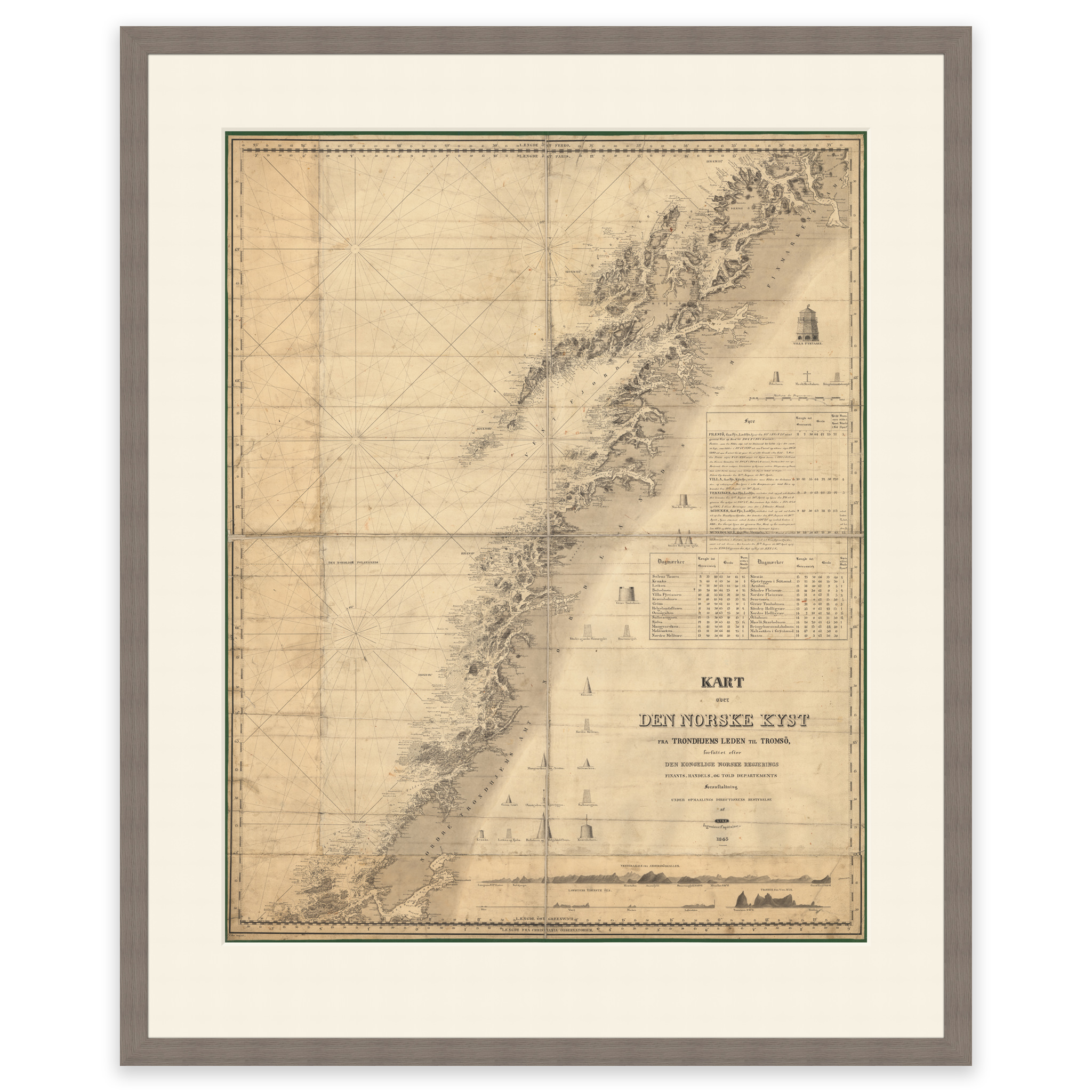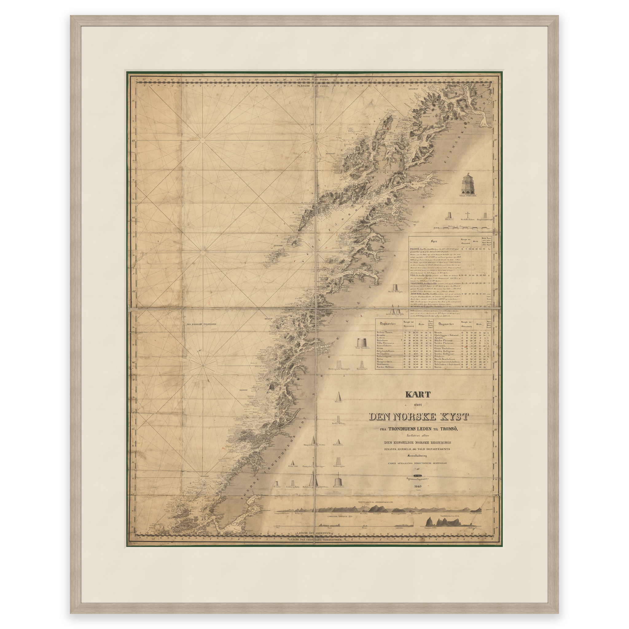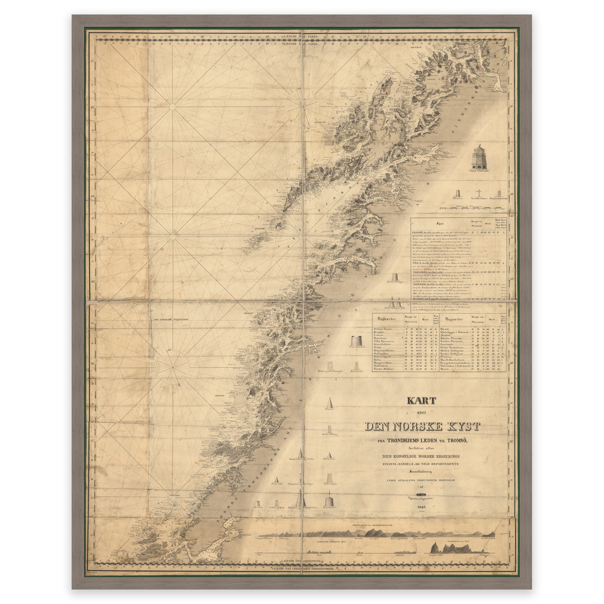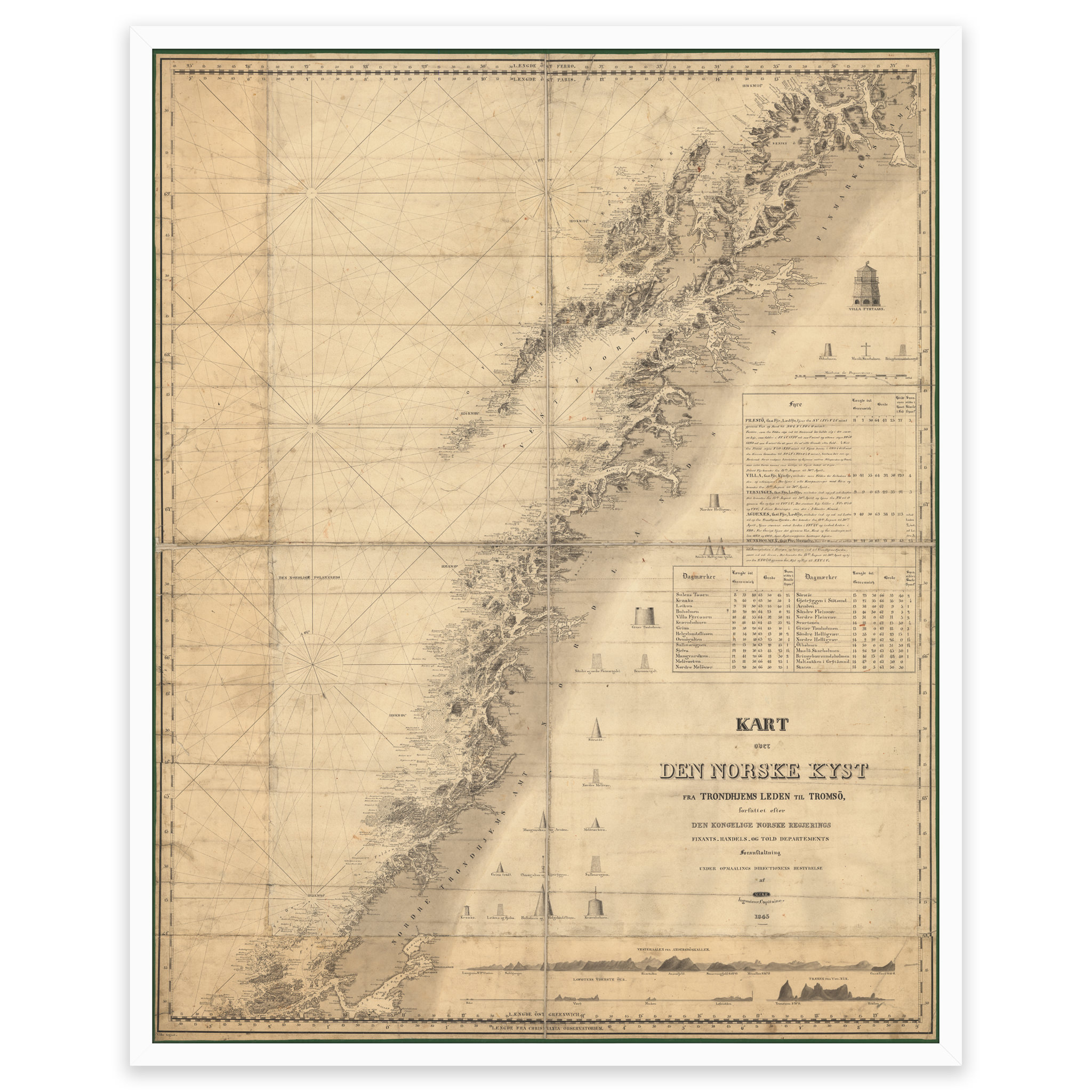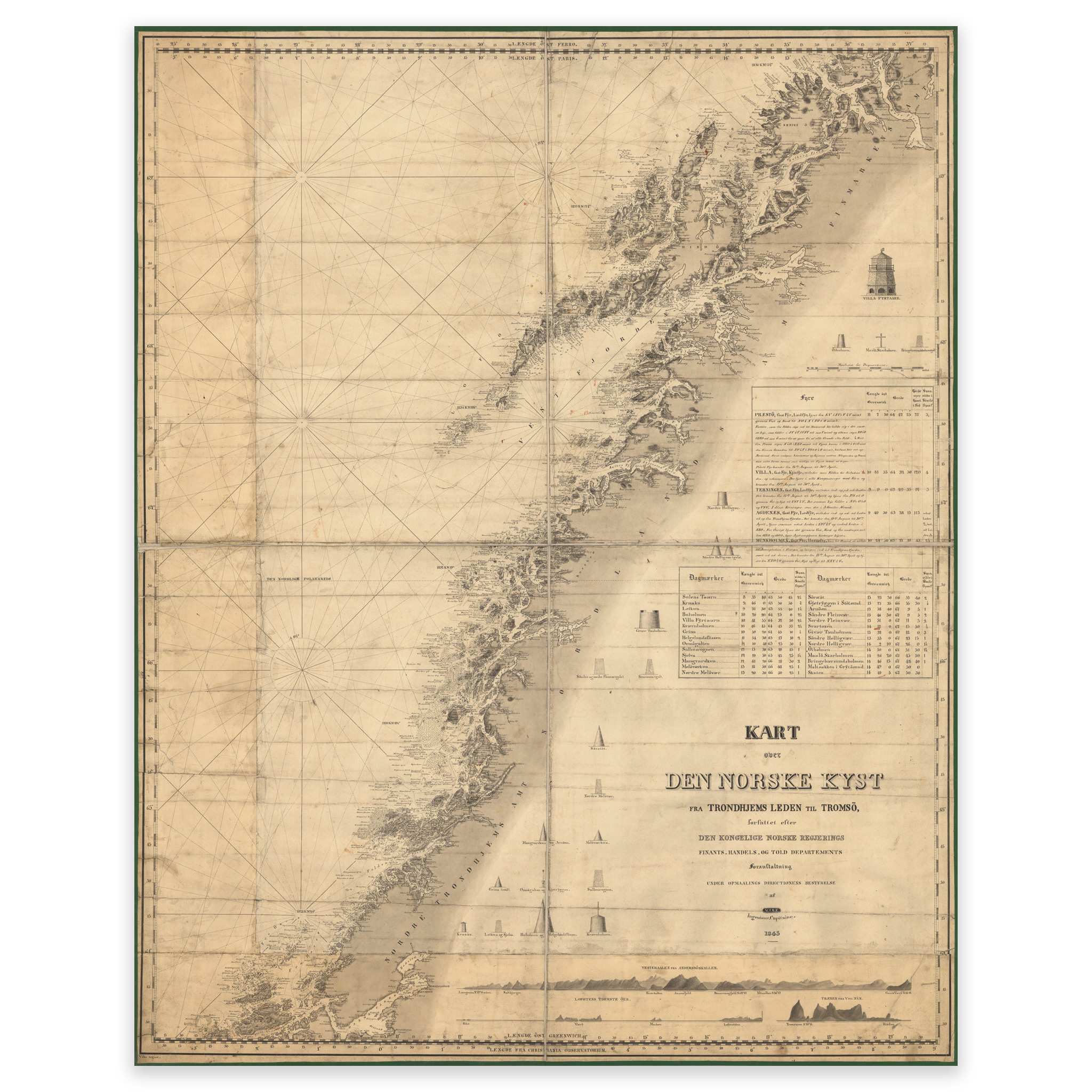 Håndtegnet kart fra 1845 over strekningen Hitra til Tromsø. Kartet leveres i originalstørrelse 67,7 x 87,1 cm. Størrelsen med ramme og passepartout er 87,7 x 109,1 cm. Ønsker du kartet i en annen størrelse? Bare ta kontakt – vi gir deg gjerne et pristilbud på tilpasning.