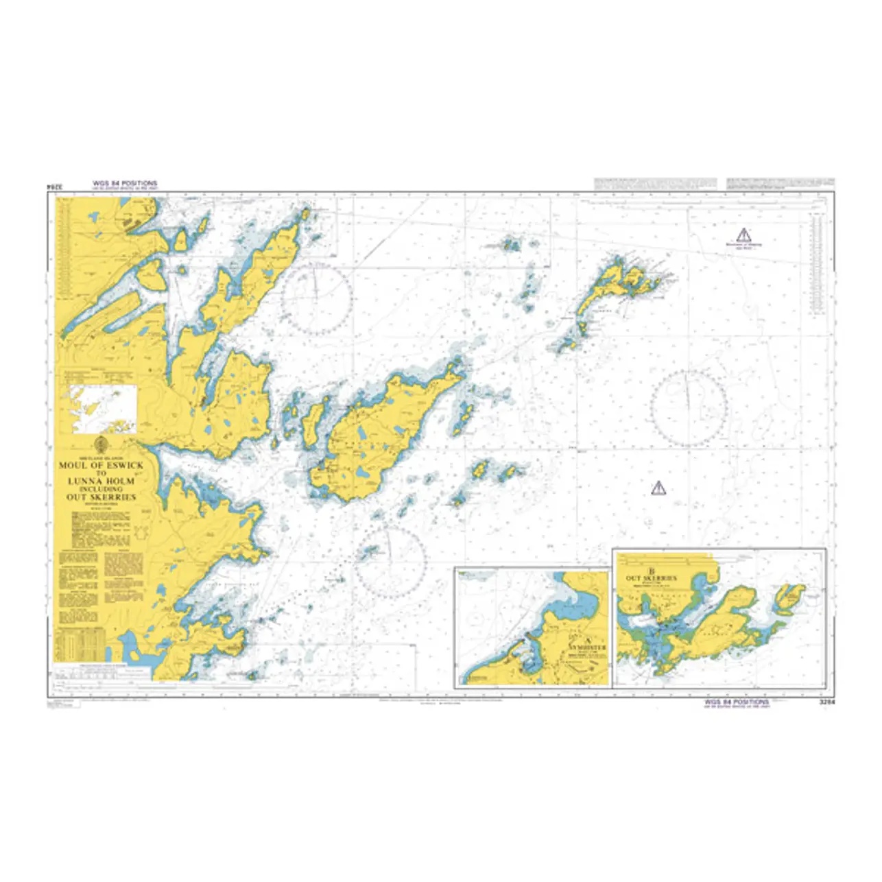 British Admiralty Chart 3284 dekker kyst- og øyområdene fra Moul of Eswick til Lunna Holm på Shetland. Kartet viser detaljerte dybdeangivelser, sjømerker, farleder og navigasjonsinformasjon som er nødvendig for sikker seilas i dette komplekse farvannet med mange skjær og grunner.