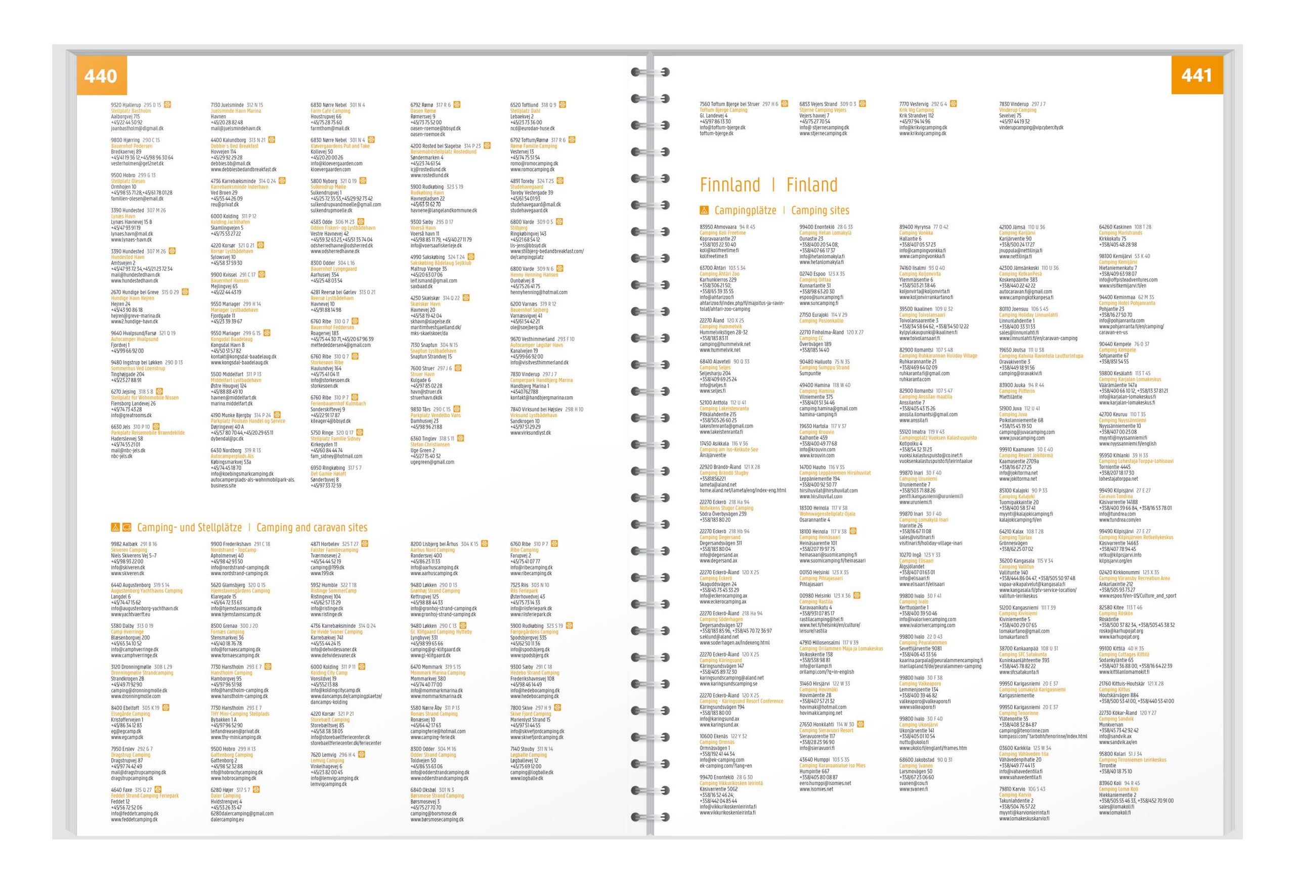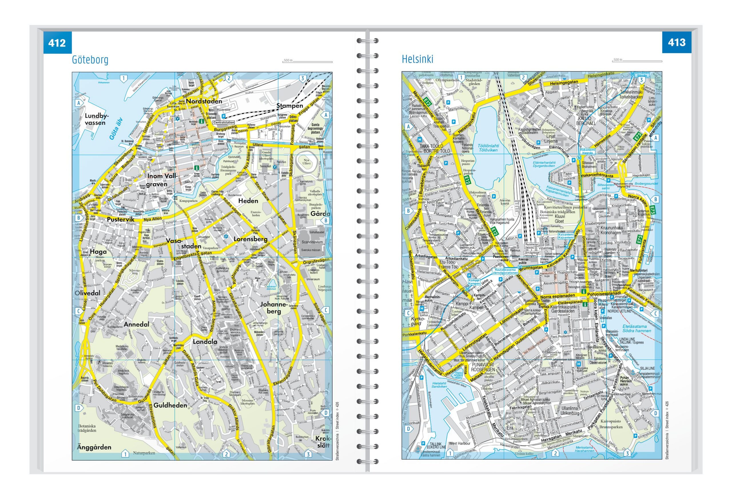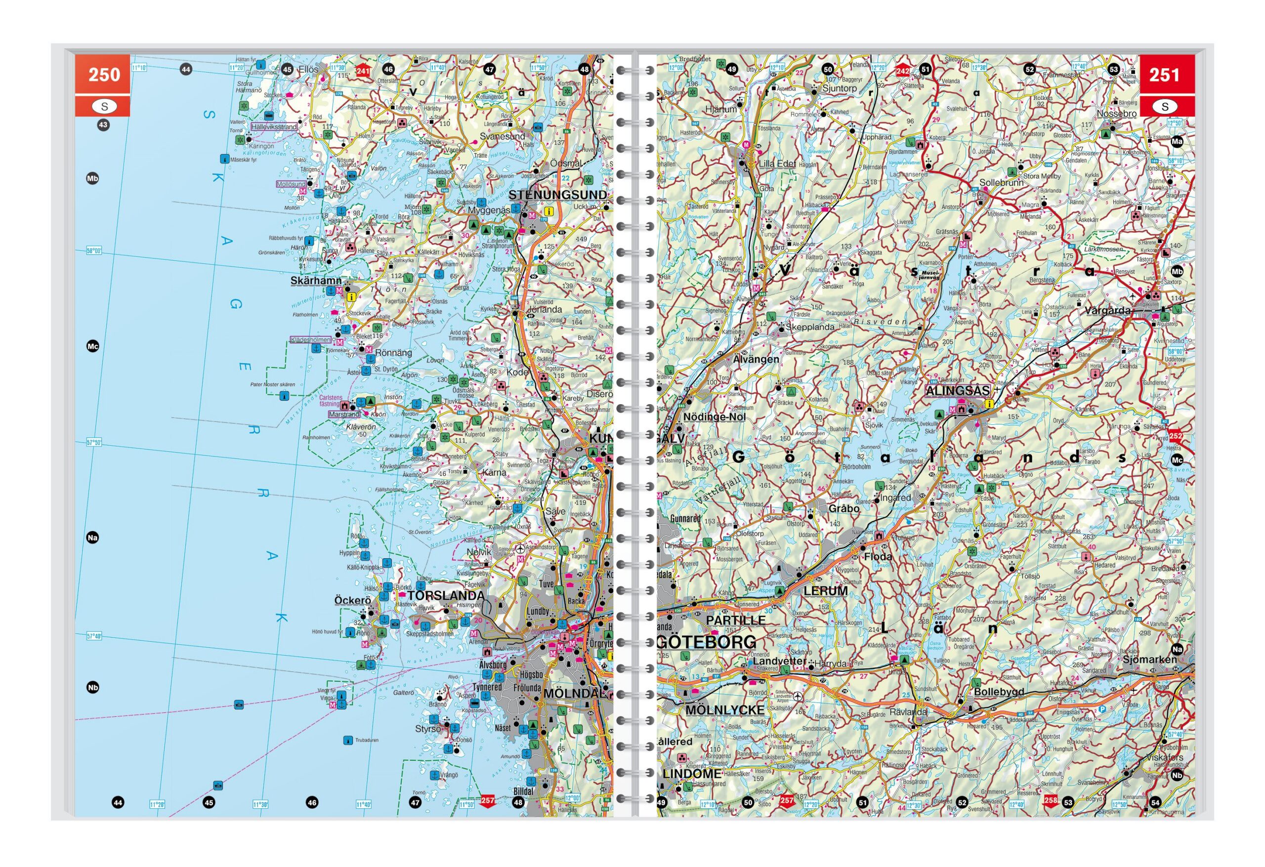 I tillegg til det detaljerte veinettet inneholder atlaset et omfattende stedsregister med postnumre, oversikt over camping- og bobilplasser, turistinformasjon samt 14 bykart for sentrale skandinaviske byer, blant annet Oslo, Bergen, Göteborg, Malmö, København, Helsinki og Stockholm. Atlaset har skjult spiralbinding, som gjør det enkelt å bla i og holde ønsket side åpen under bruk, også i kjøretøy.