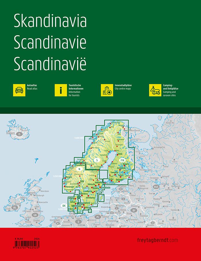 Dette er et svært omfattende og detaljert bilatlas over Skandinavia, utviklet for reisende som ønsker full oversikt over veinettet i Norge, Danmark, Sverige og Finland. Atlaset dekker hele regionen med hele 466 sider og gir både solid støtte til planlegging før reisen og pålitelig orientering underveis. Kartene er produsert med høy kartografisk kvalitet og er tilpasset bruk for bilister, motorsyklister samt reisende med bobil eller campingvogn.