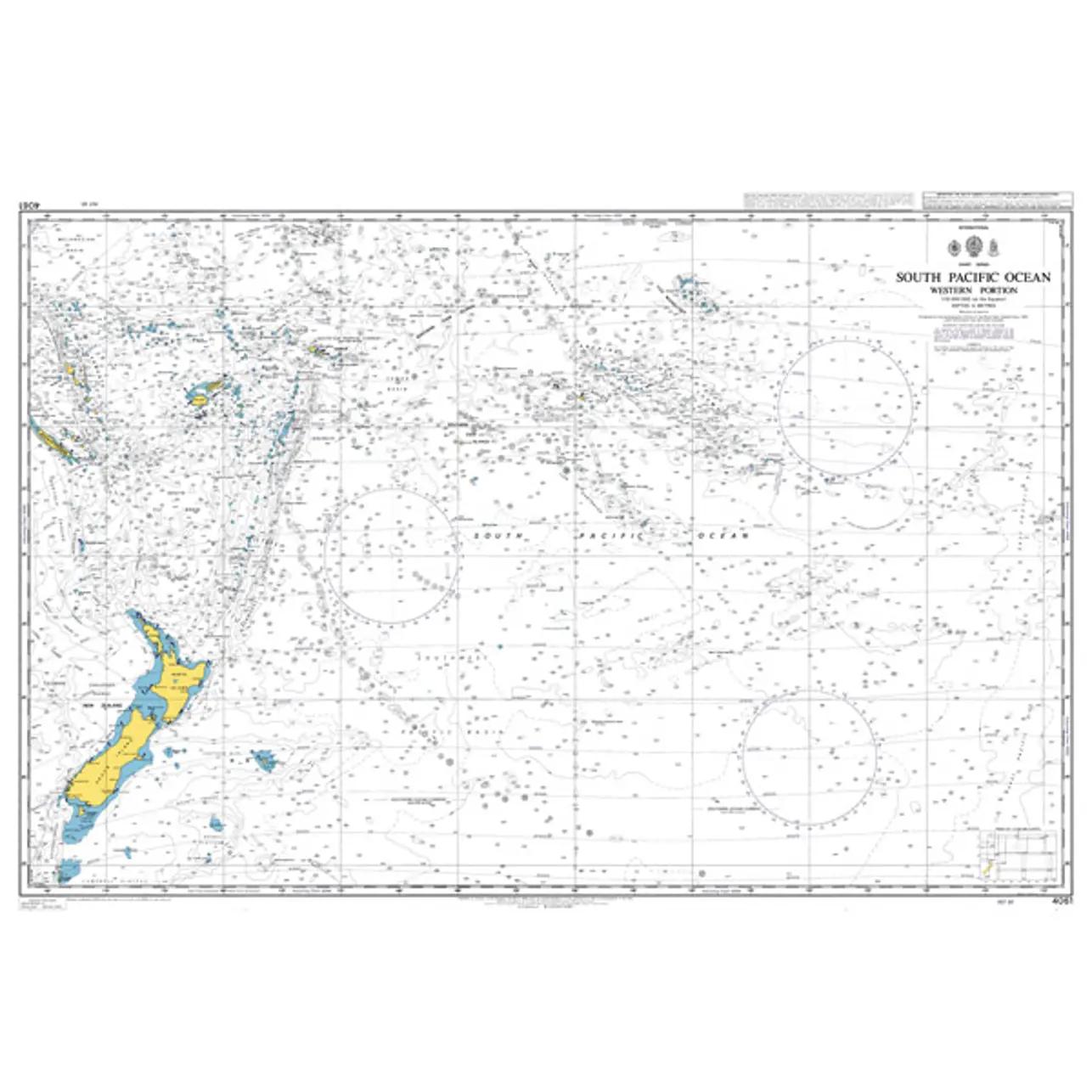 Dette oversiktskartet fra British Admiralty dekker den vestlige delen av det sørlige Stillehavet, med omfattende havområder mellom Australia, New Zealand, Melanesia, Polynesia og tilstøtende øygrupper. Kartet gir et samlet overblikk over et svært stort og åpent havområde som er sentralt for langdistanse seilas i Stillehavet.