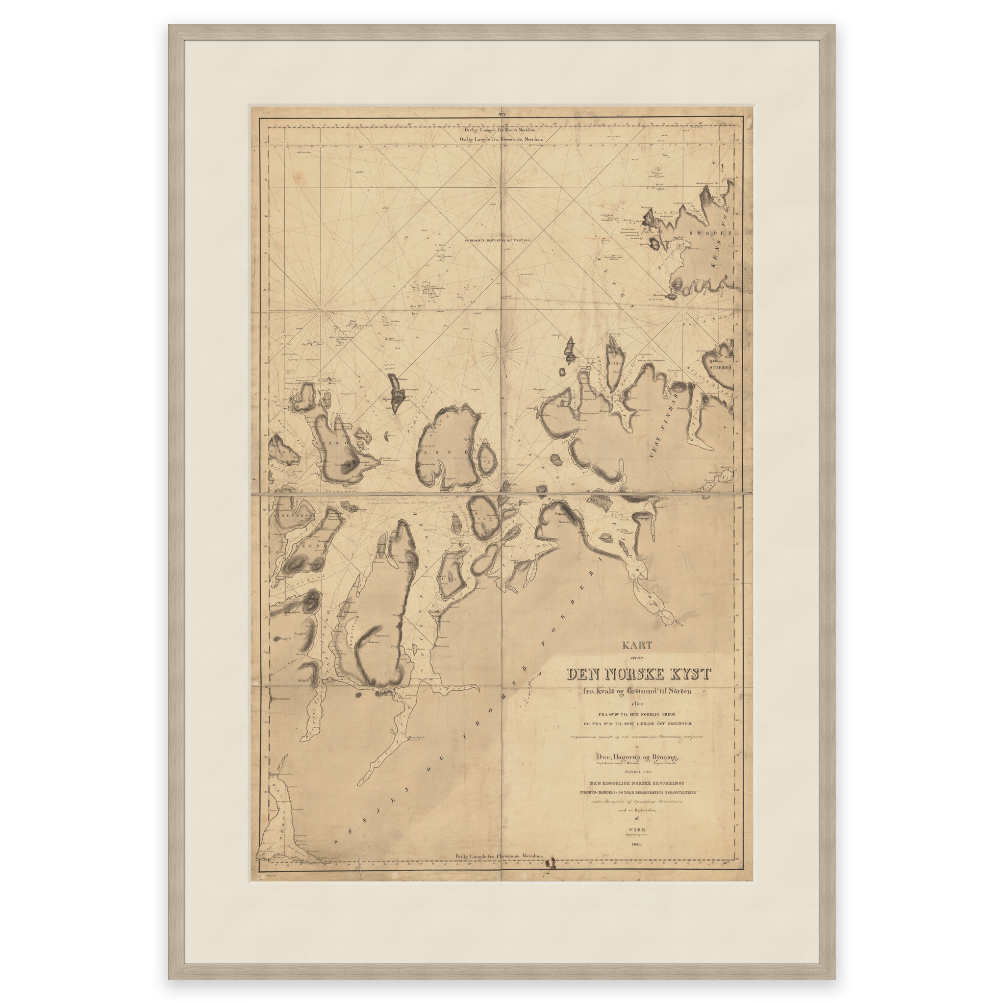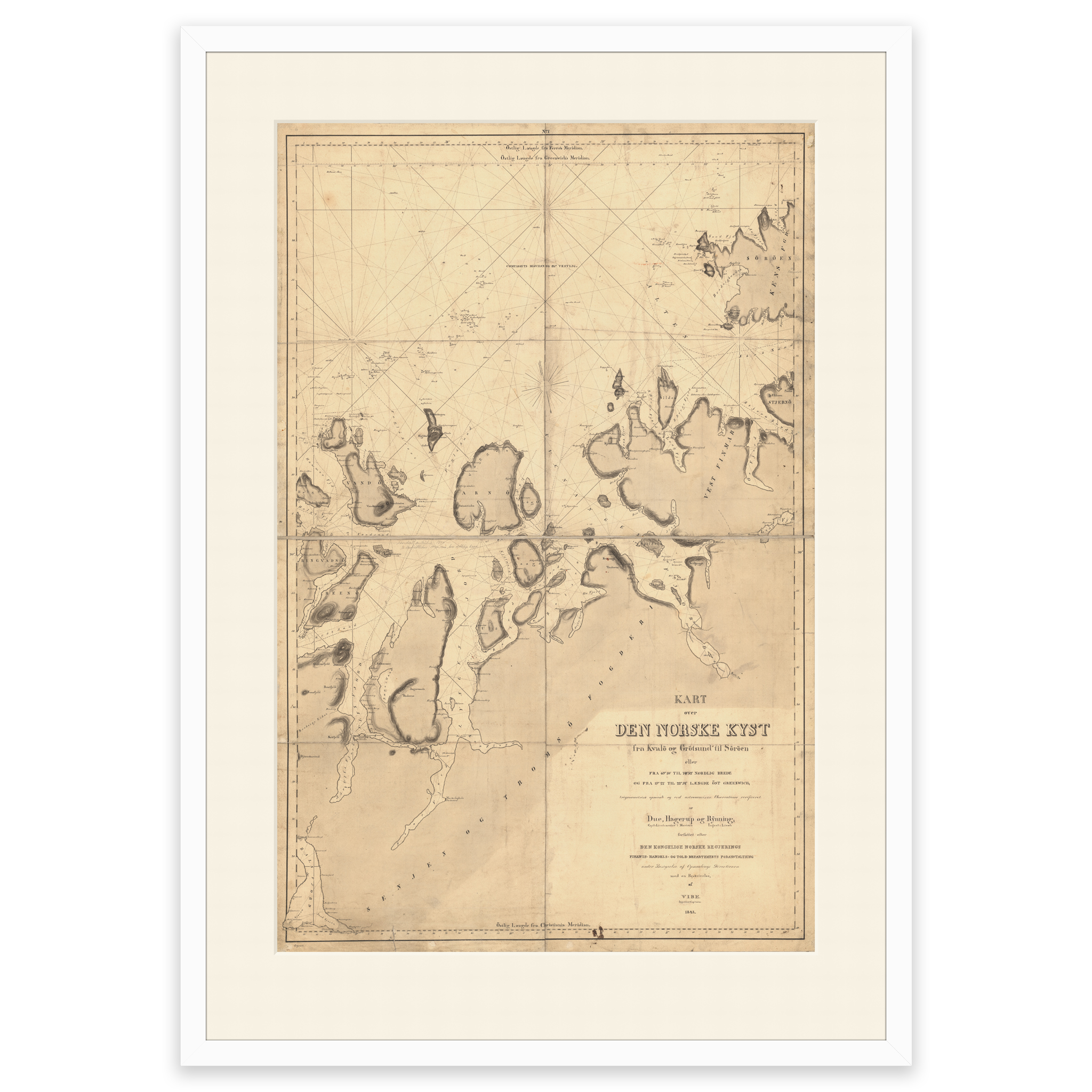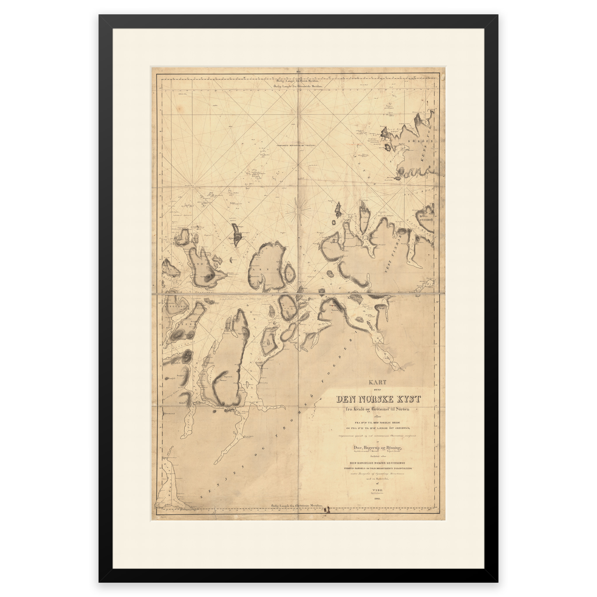 Dette sjøkartet fra 1843 er håndtegnet, og dekker området Kvaløya ved Tromsø til Sørøya. Kartet leveres i originalstørrelse 69,6 x 88 cm. Størrelsen med ramme og passepartout er 89,6 x 110 cm. Ønsker du kartet i en annen størrelse? Bare ta kontakt – vi gir deg gjerne et pristilbud på tilpasning.