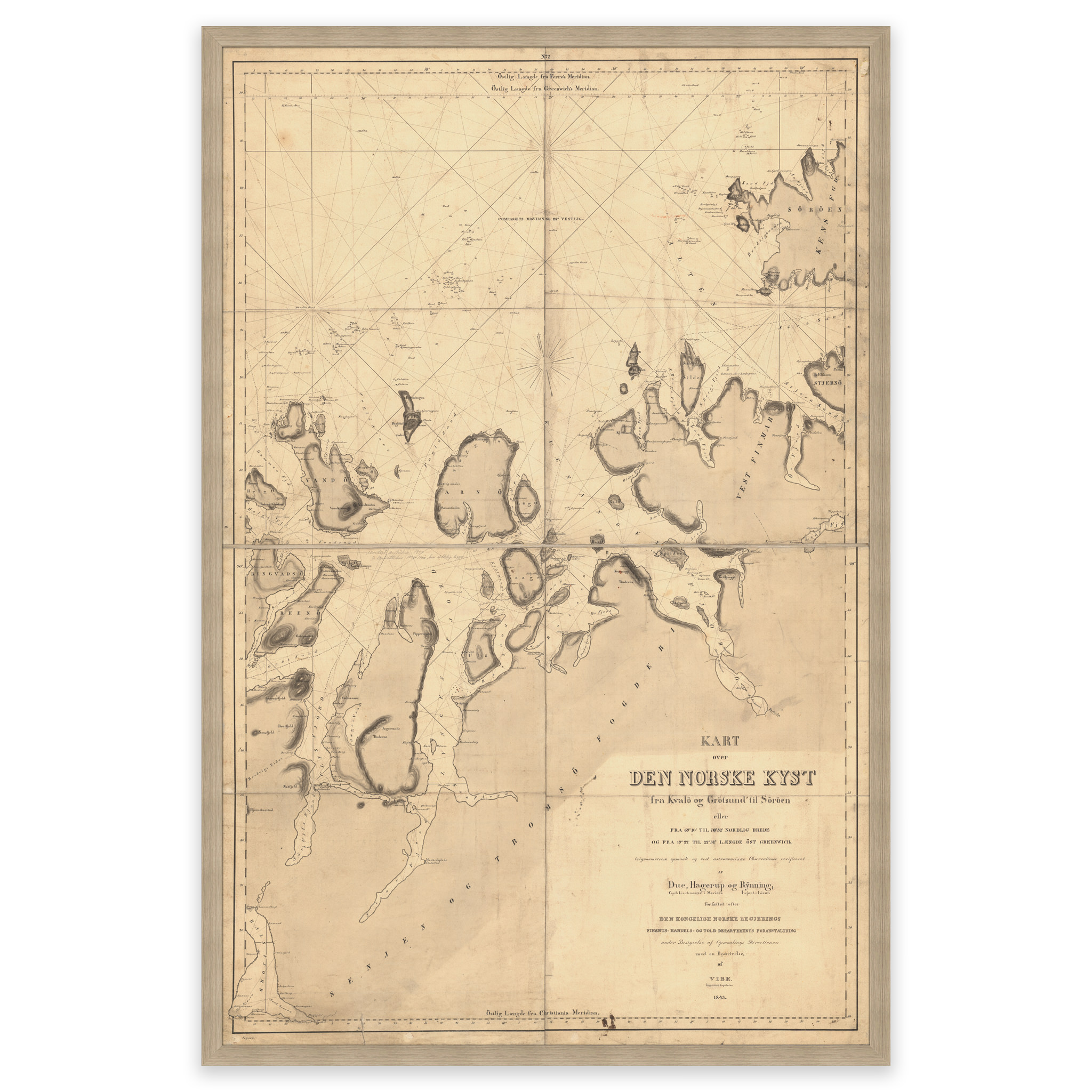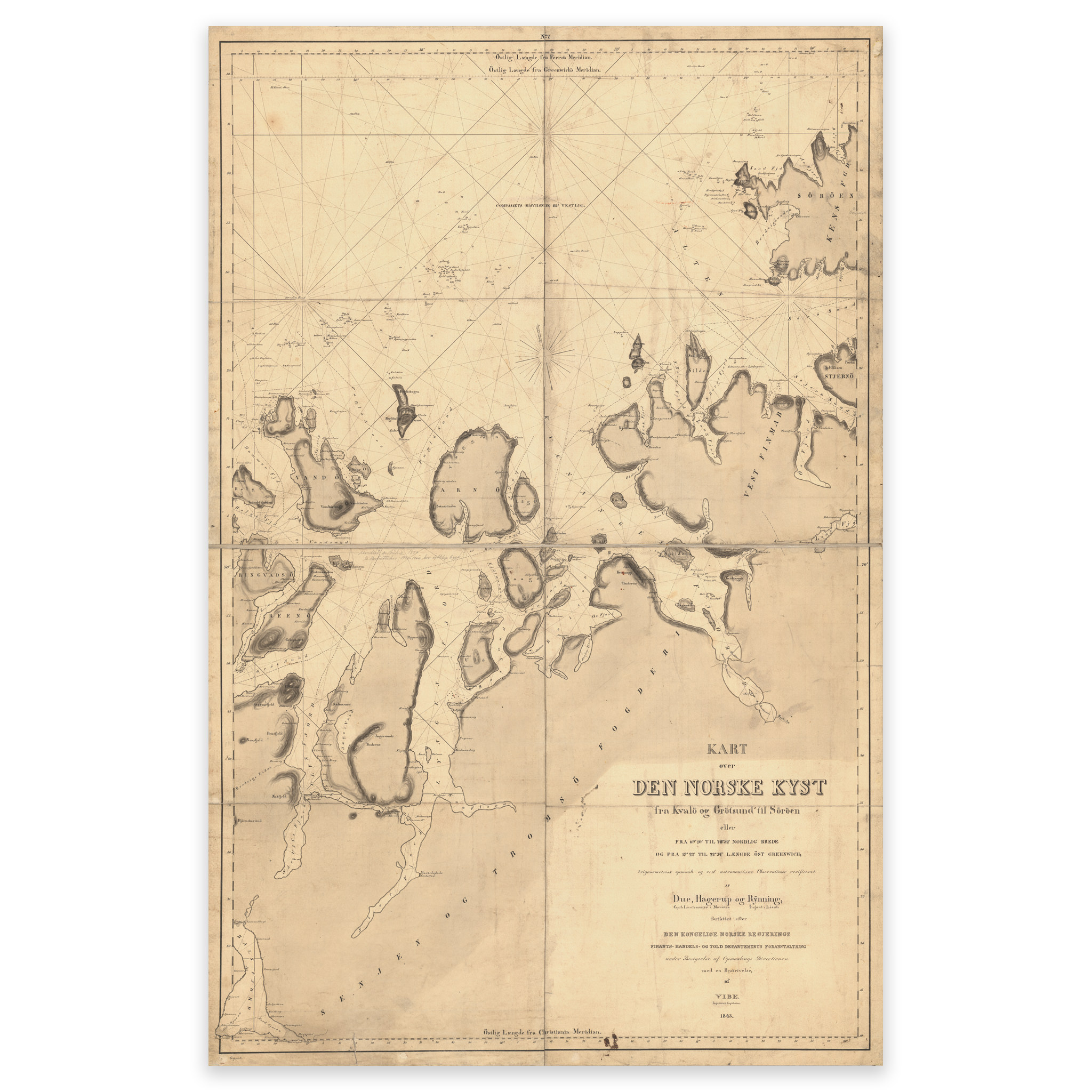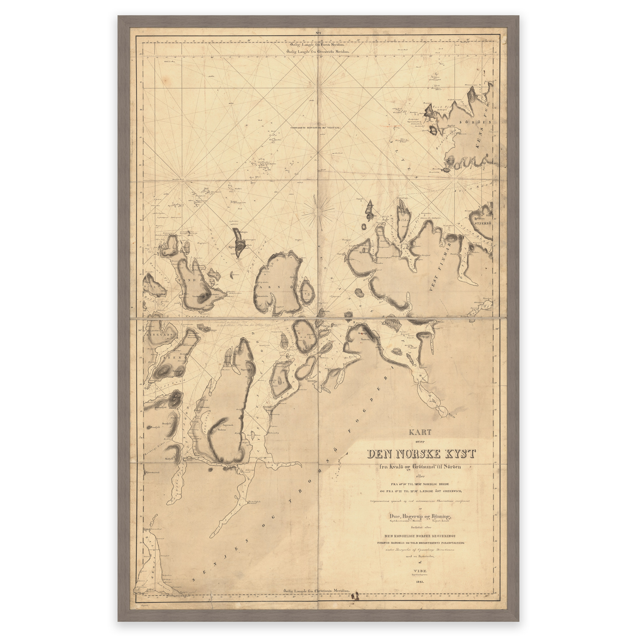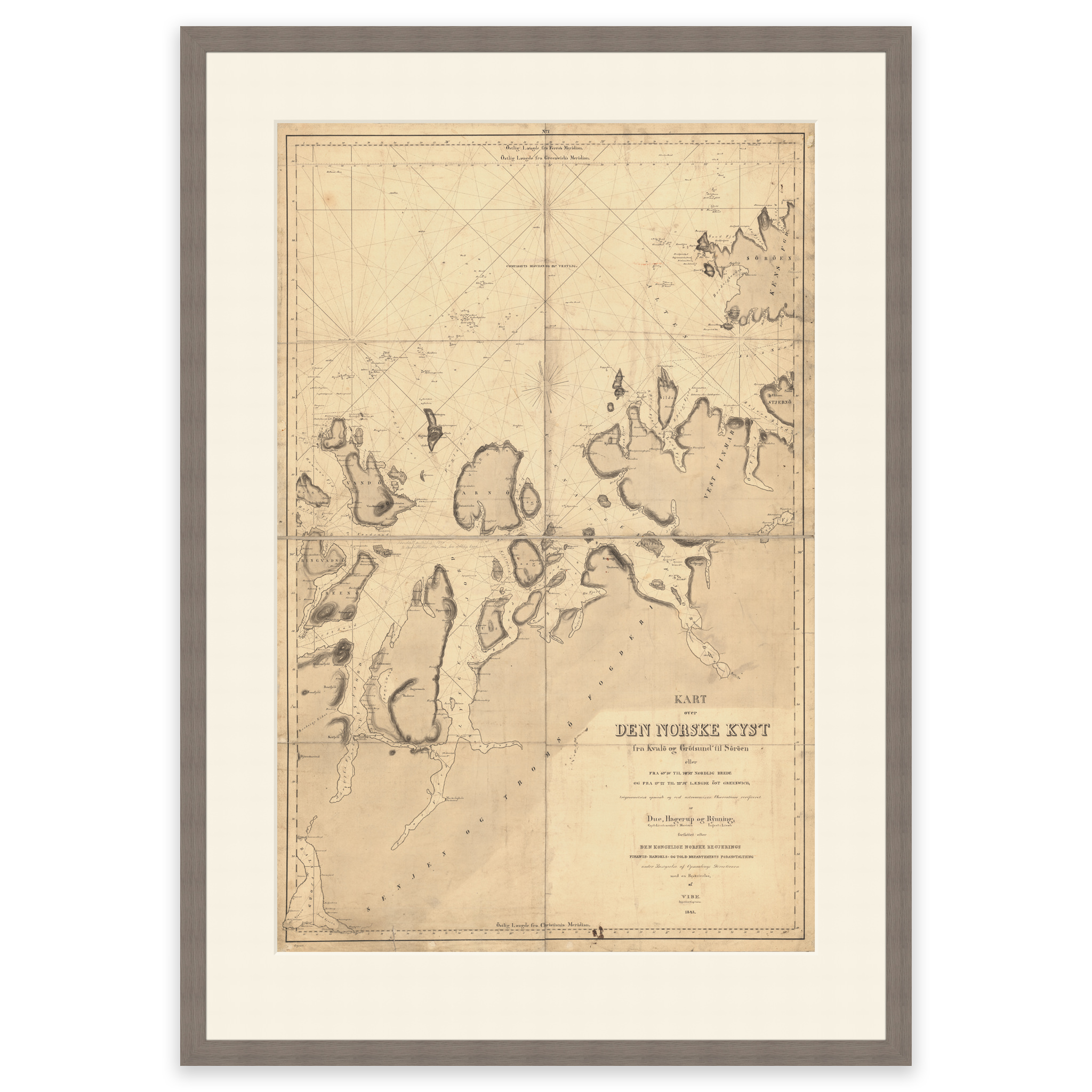 Dette sjøkartet fra 1843 er håndtegnet, og dekker området Kvaløya ved Tromsø til Sørøya. Kartet leveres i originalstørrelse 69,6 x 88 cm. Størrelsen med ramme og passepartout er 89,6 x 110 cm. Ønsker du kartet i en annen størrelse? Bare ta kontakt – vi gir deg gjerne et pristilbud på tilpasning.