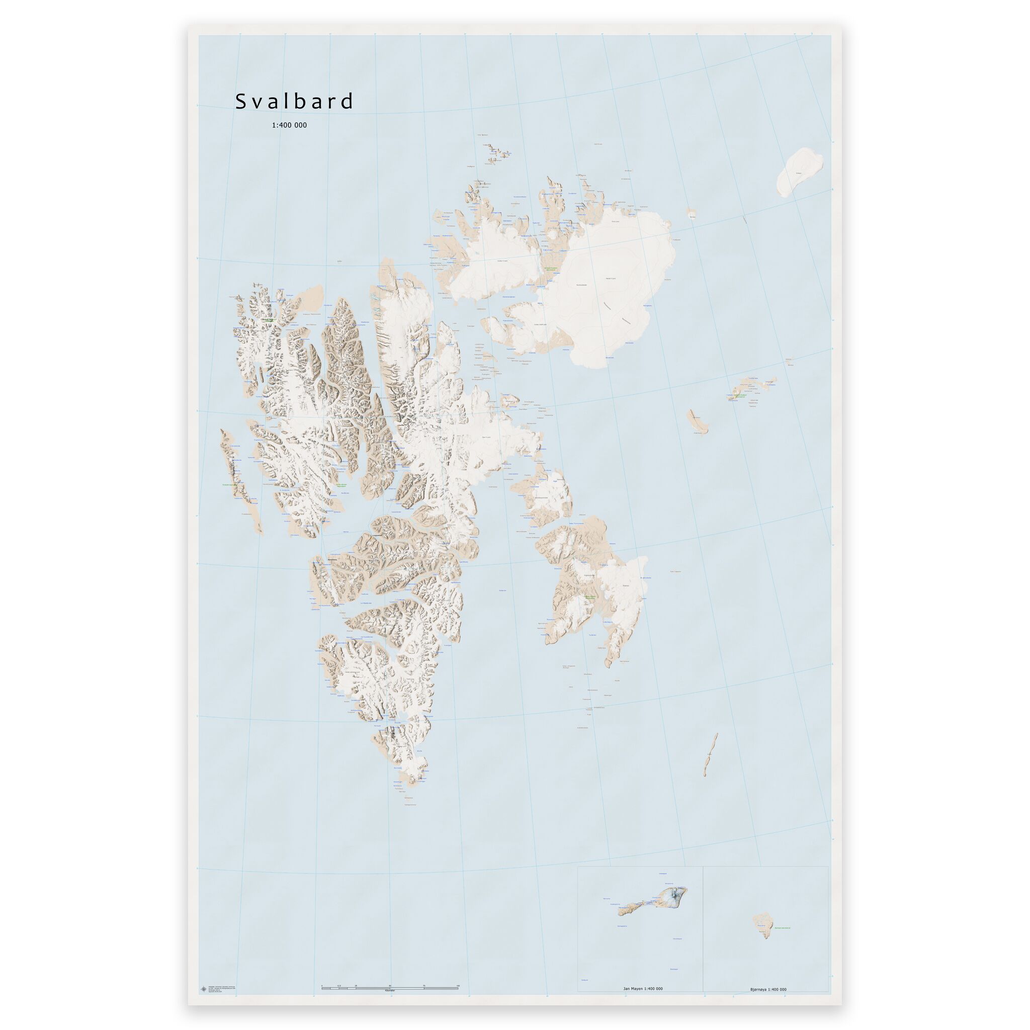 Stilrent og detaljert kart over Svalbard – tilgjengelig i fem størrelser.