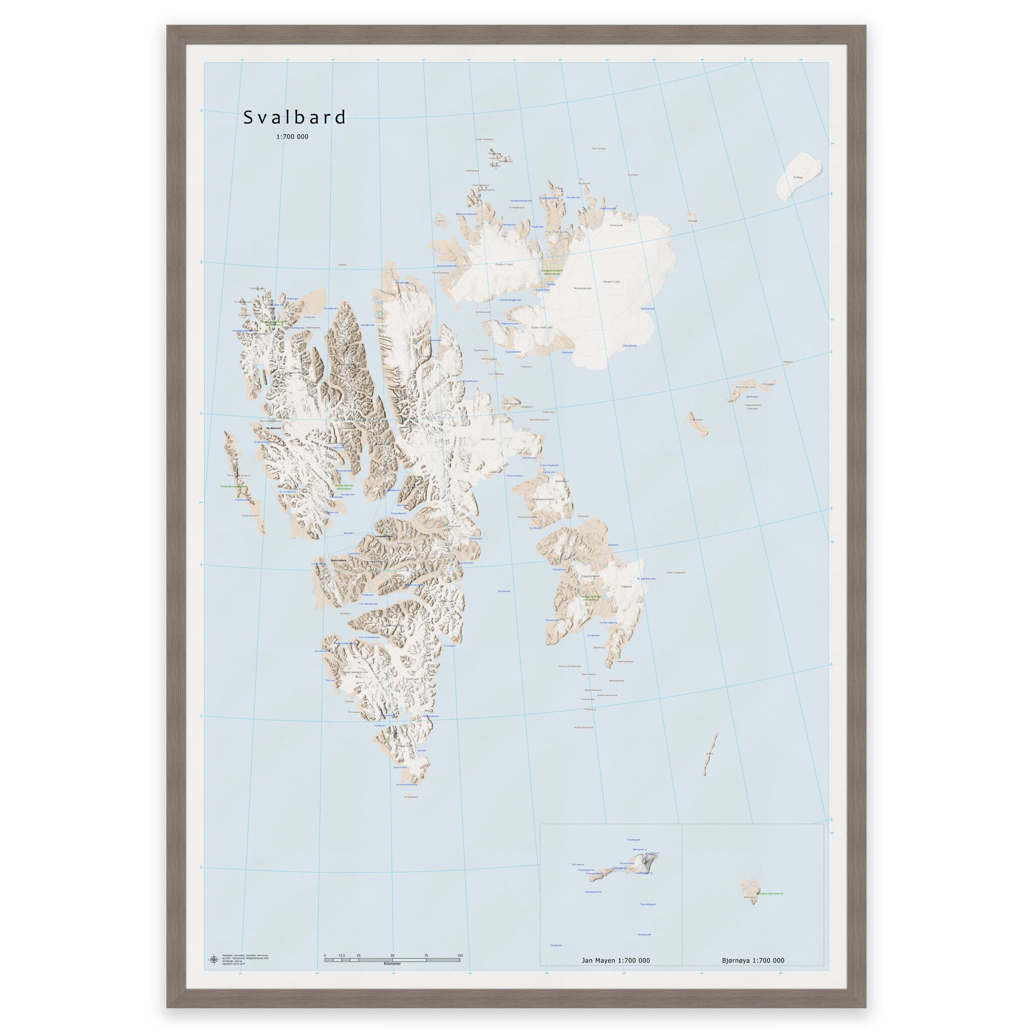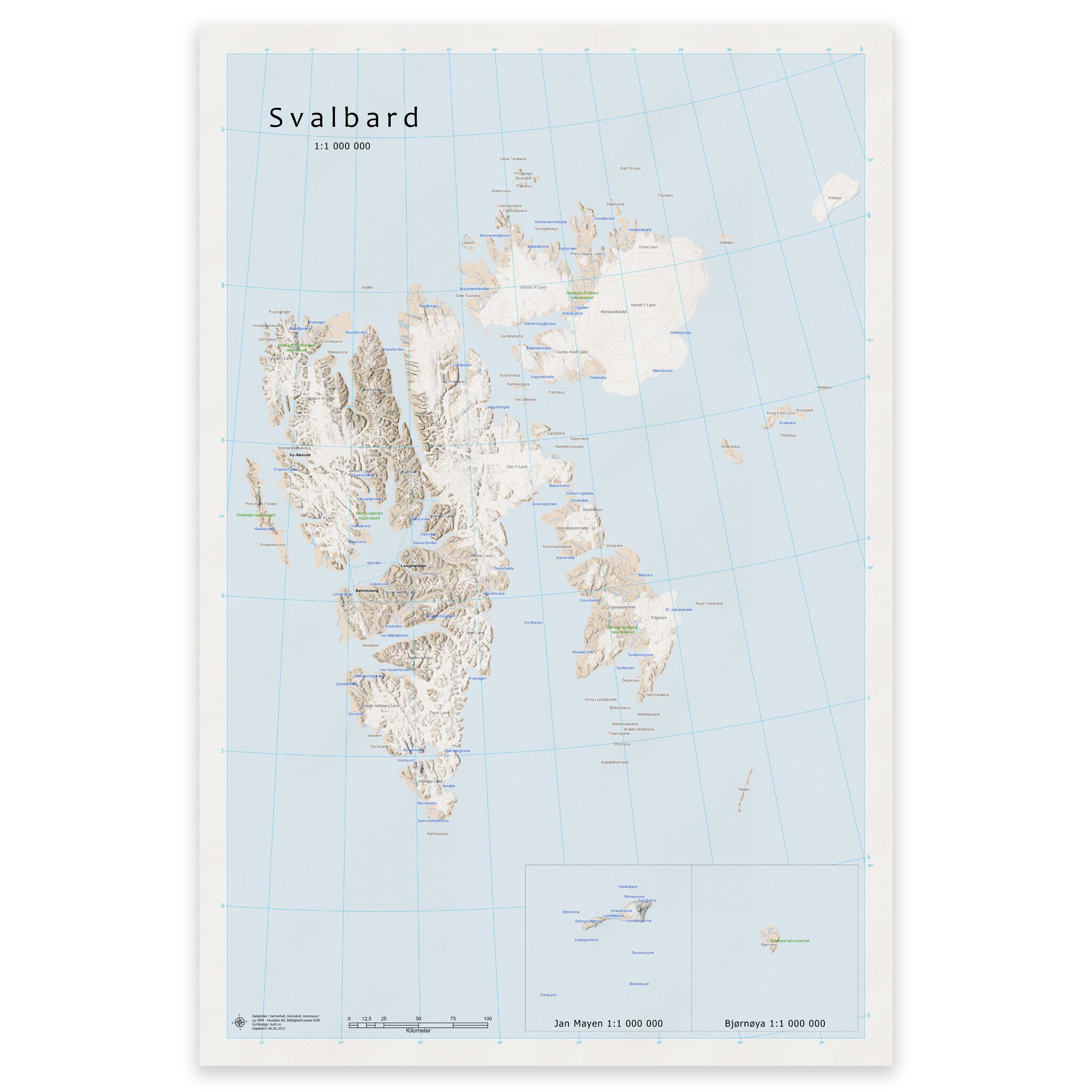 Svalbard – stort veggkart med Bjørnøya og Jan Mayen