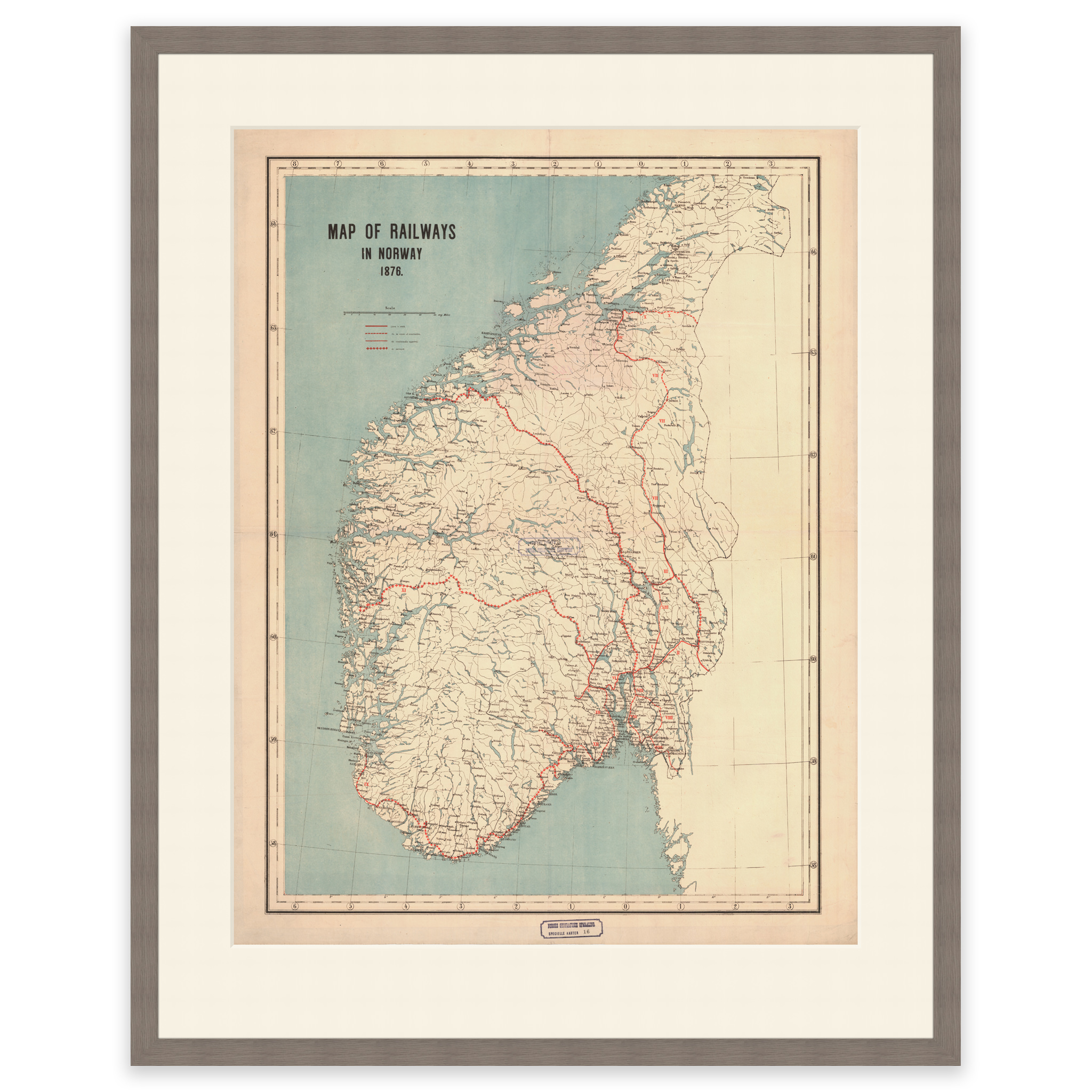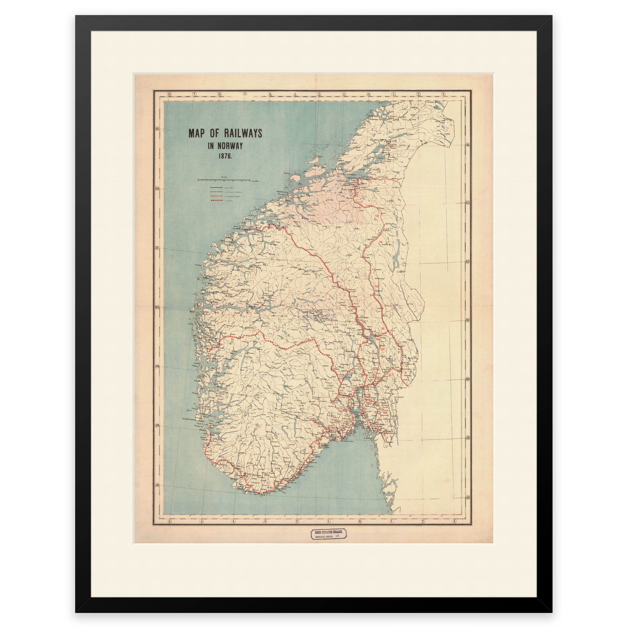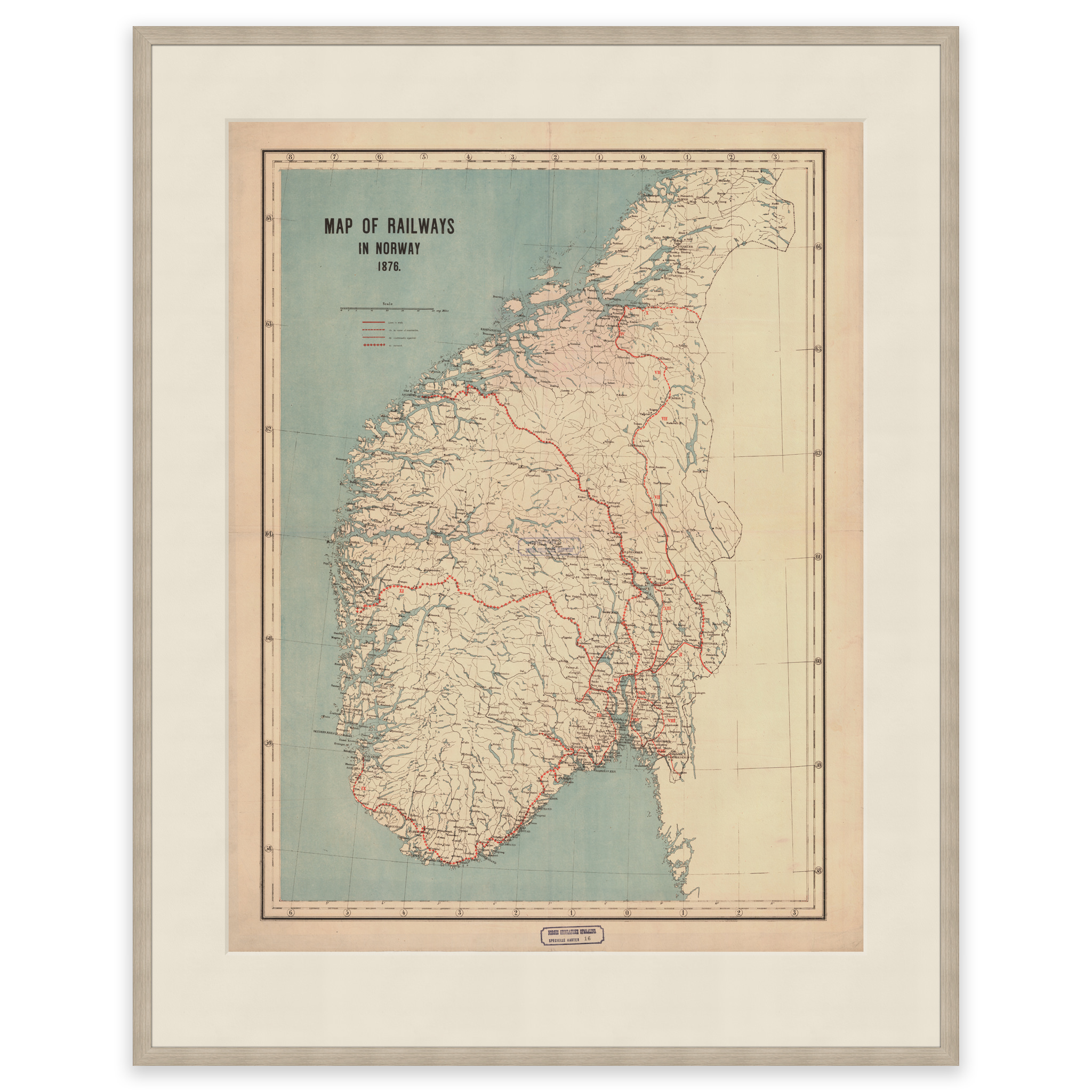 Kart over eksisterende, planlagte og jernbanestrekninger under bygging i 1876. Bergensbanen ble for eksempel ikke åpnet før i 1907 av Kong Håkon VII. Kartet leveres i originalstørrelse 67,1 x 92,3 cm. Størrelsen med ramme og passepartout er 87,1 x 114,3 cm. Ønsker du kartet i en annen størrelse? Bare ta kontakt – vi gir deg gjerne et pristilbud på tilpasning.