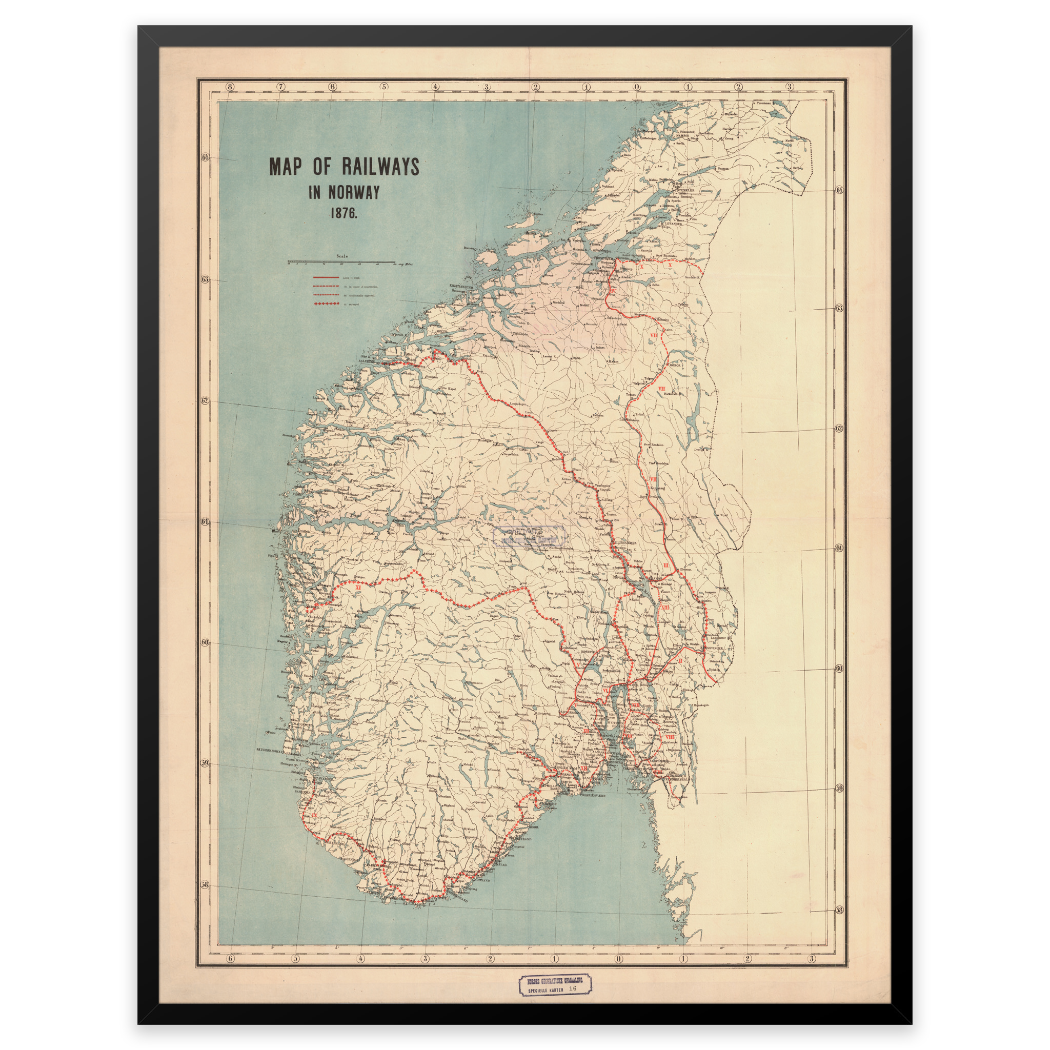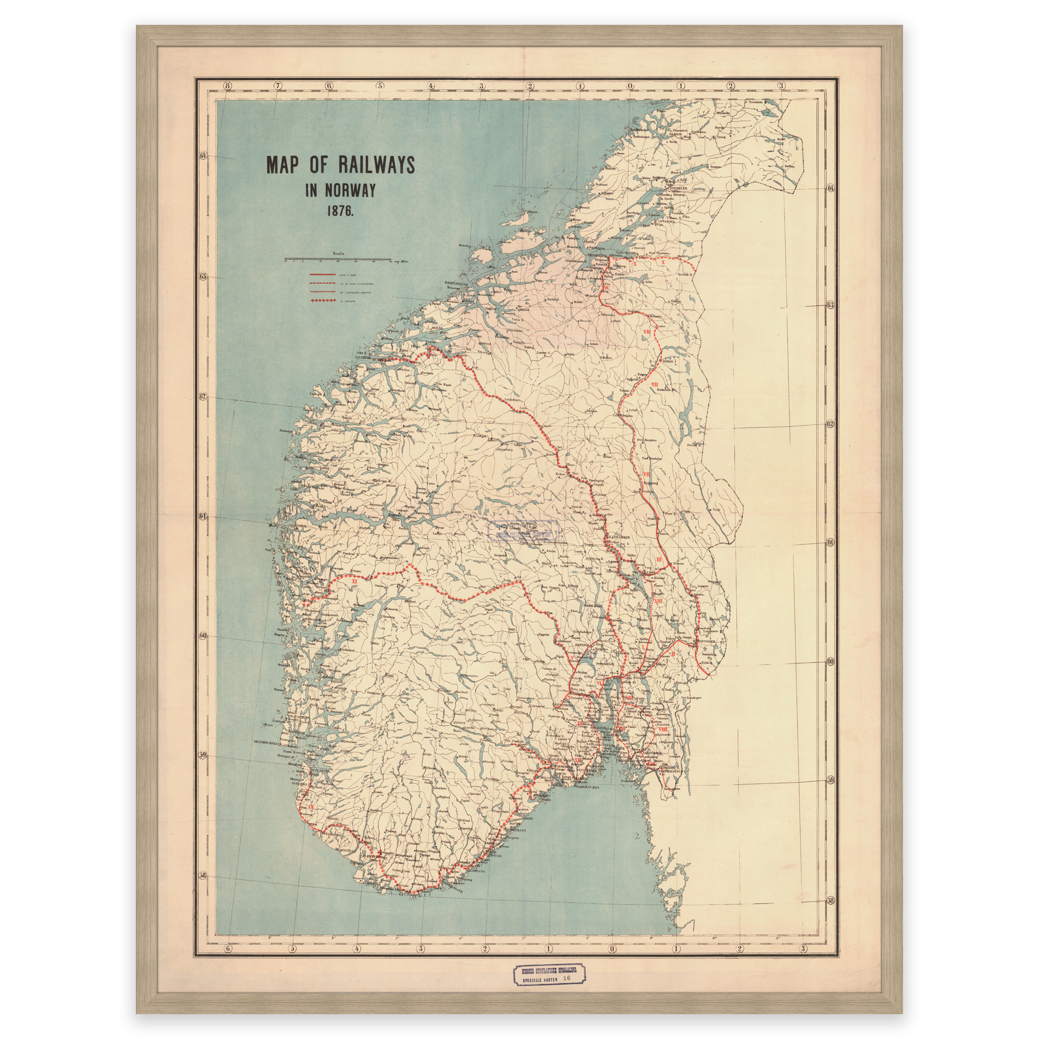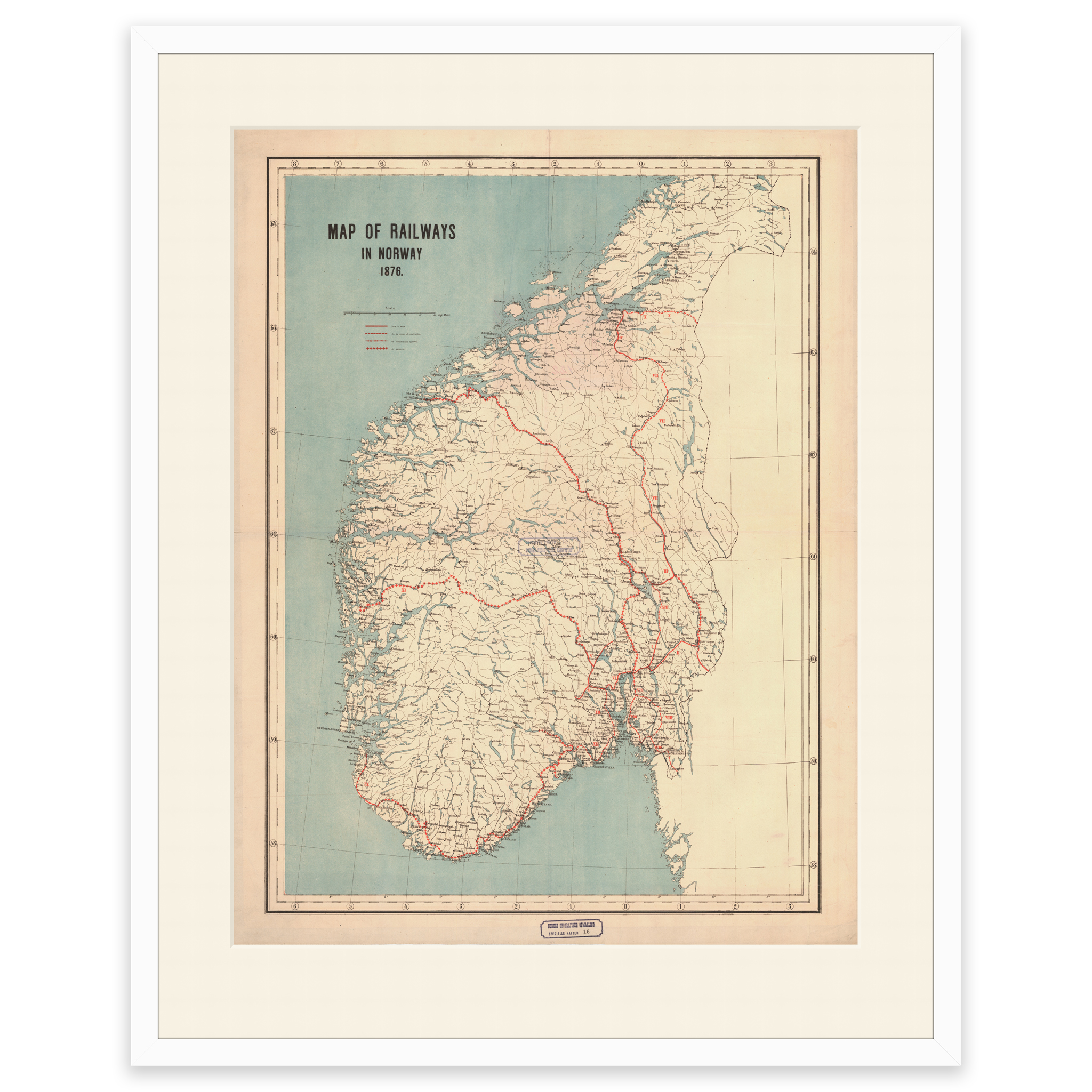 Kart over eksisterende, planlagte og jernbanestrekninger under bygging i 1876. Bergensbanen ble for eksempel ikke åpnet før i 1907 av Kong Håkon VII. Kartet leveres i originalstørrelse 67,1 x 92,3 cm. Størrelsen med ramme og passepartout er 87,1 x 114,3 cm. Ønsker du kartet i en annen størrelse? Bare ta kontakt – vi gir deg gjerne et pristilbud på tilpasning.
