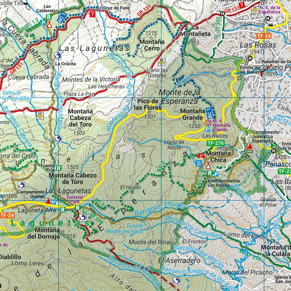 Kartbildet viser et tett nett av merkede turstier, inkludert lengre ruter og lokale stier gjennom ulike landskapstyper som vulkanske områder, skog, fjell og kystnære soner. I tillegg er sykkelruter og mountainbikeløyper inkludert, noe som gjør kartet anvendelig for flere typer aktiviteter. Turistinformasjon og severdigheter er integrert i kartet, og gir god støtte til å planlegge varierte opplevelser.