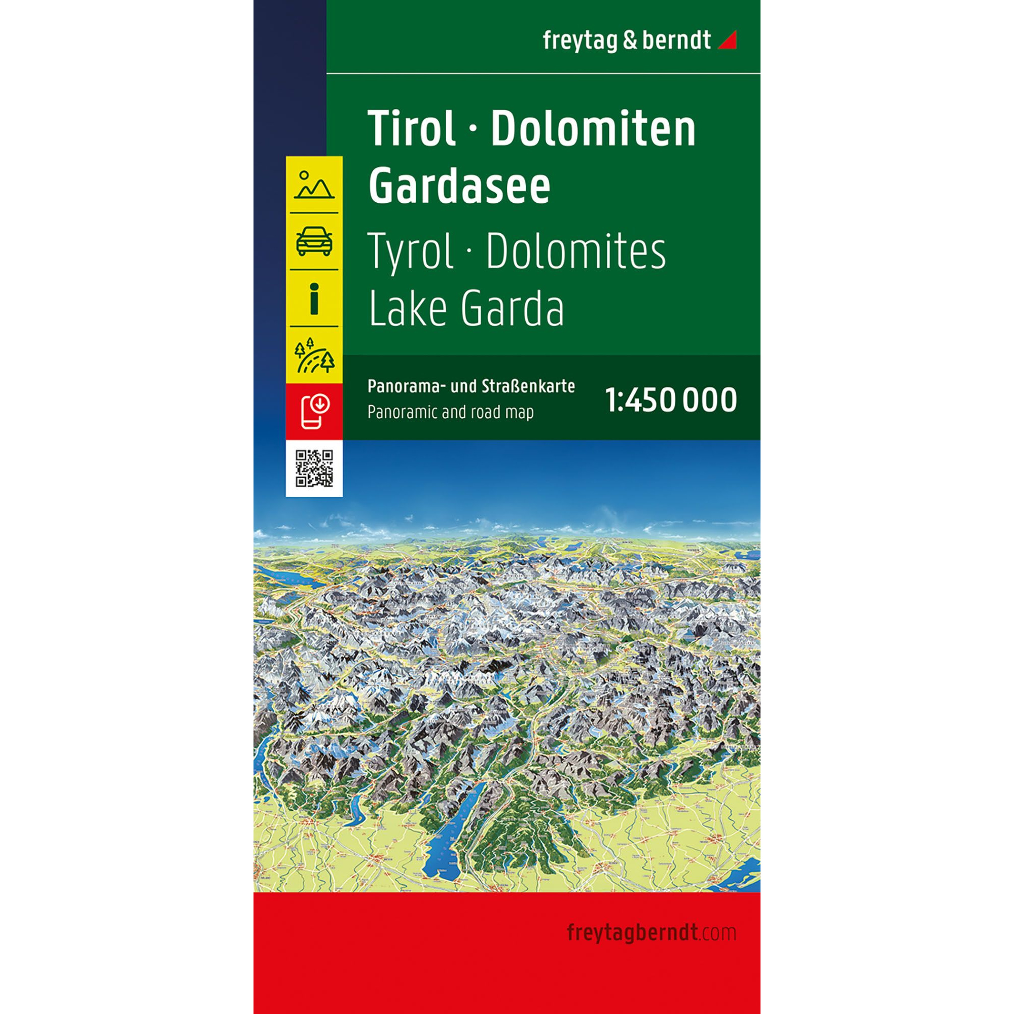 Dette detaljerte panorama- og veikartet dekker Tirol, Dolomittene og Gardasjøen og er utviklet for reisende som ønsker både presis navigasjon og en visuell oversikt over landskapet. Kartet kombinerer et tydelig og lettlest veinett med en illustrert panoramafremstilling av Alpeområdet, noe som gir både praktisk orientering og inspirasjon til reiseplanlegging.