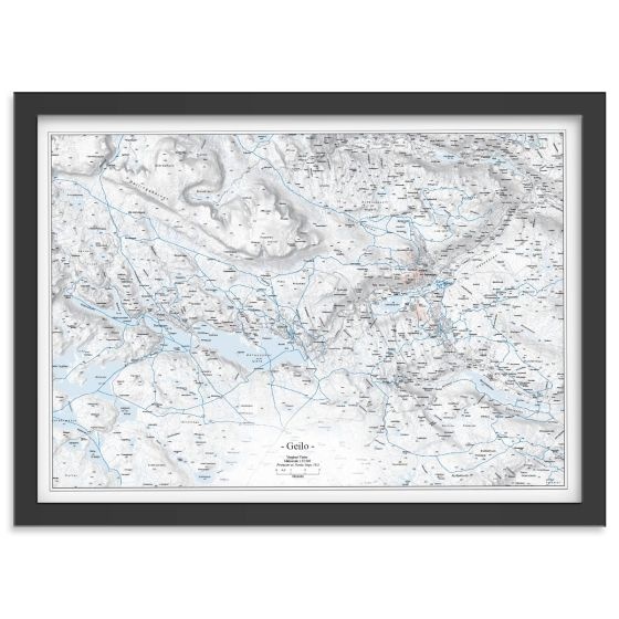 Veggkart Geilo er et eksklusivt og rammevennlig fjellkart i målestokk 1:55 000 som gir en detaljert og oversiktlig fremstilling av Geilo og omkringliggende fjellområder på Hardangervidda i Buskerud. Kartet viser fjelltopper, viddeområder, dalfører, vann, vassdrag, stier, skiløyper, hytteområder og terrengformer, og er fremstilt med tydelige terrengskygger som gir landskapet dybde og et markant tredimensjonalt preg. Dette gir både høy lesbarhet og et rolig, estetisk uttrykk.