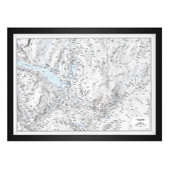 Veggkart Oppdal er et eksklusivt og rammevennlig fjellkart i målestokk 1:50 000 som gir en detaljert og oversiktlig fremstilling av Oppdal og omkringliggende fjellområder. Kartet viser fjelltopper, dalfører, vassdrag, stier, skiløyper og bebyggelse, og er fremstilt med diskrete skyggelag som gir terrenget dybde og et tydelig tredimensjonalt preg. Dette gjør kartet både lett å lese og visuelt tiltalende.