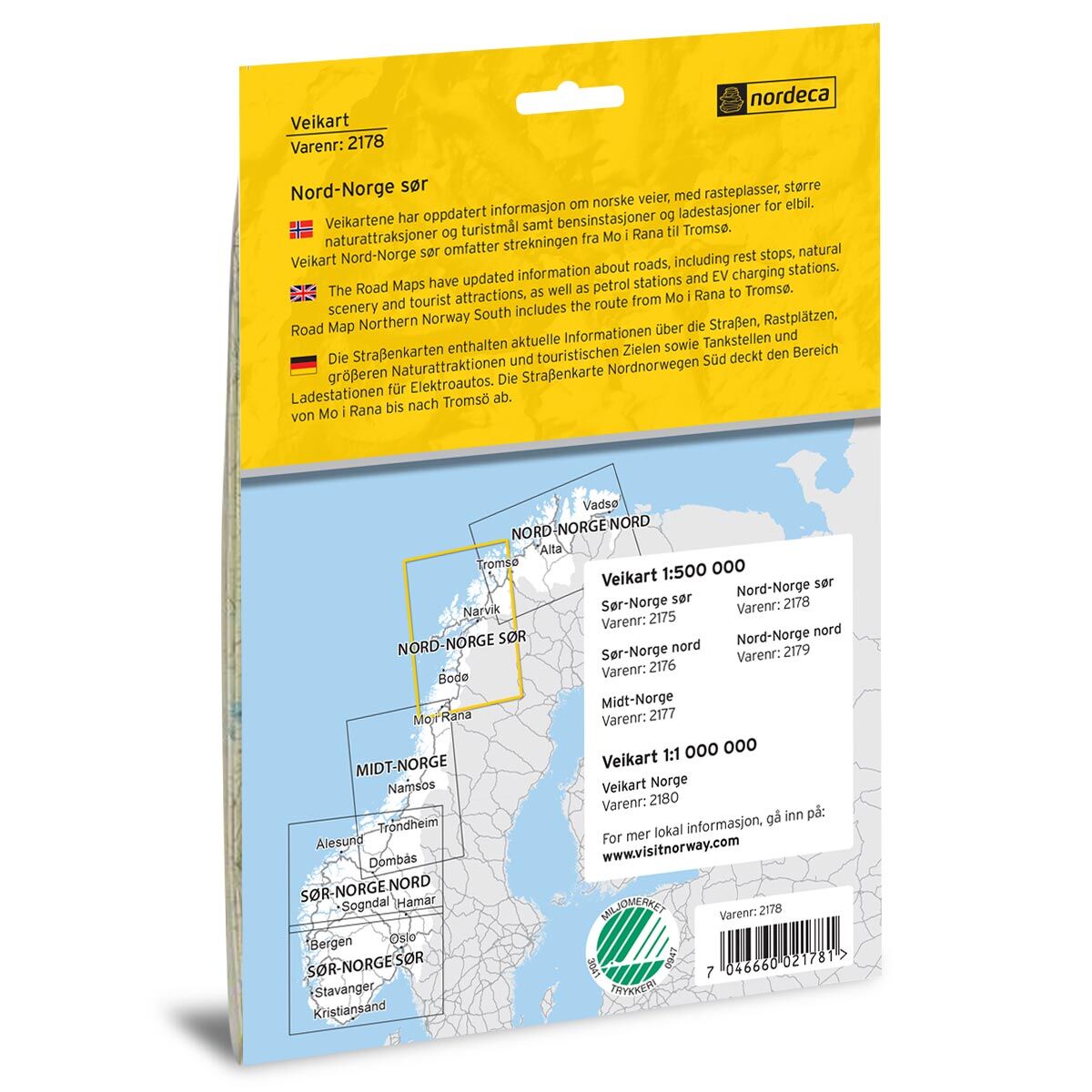 Veikartene har oppdatert informasjon om norske veier, med rasteplasser, avstandstabell, fergestrekninger, større naturattraksjoner og turistmål samt bensinstasjoner og ladestasjoner for elbil.Kartet dekker strekningen fra Mo i Rana til Tromsø.