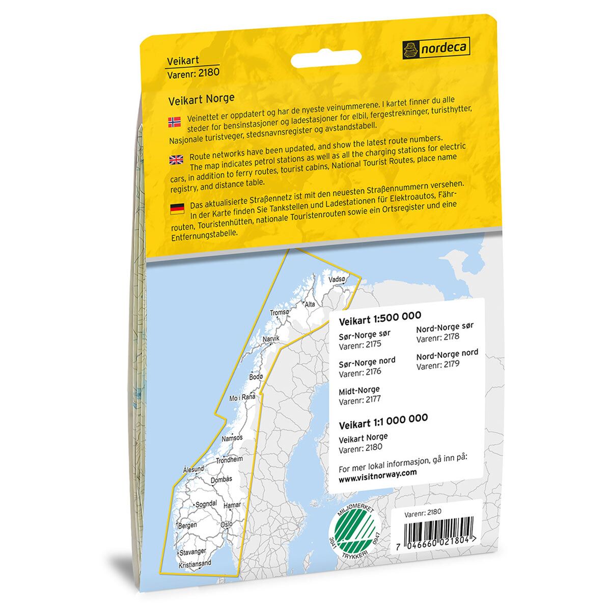 I kartet finner du bensinstasjoner og hurtigladestasjoner for elbil, fergestrekninger, turisthytter, stedsnavnsregister, større naturattraksjoner og turistmål samt avstandstabell.