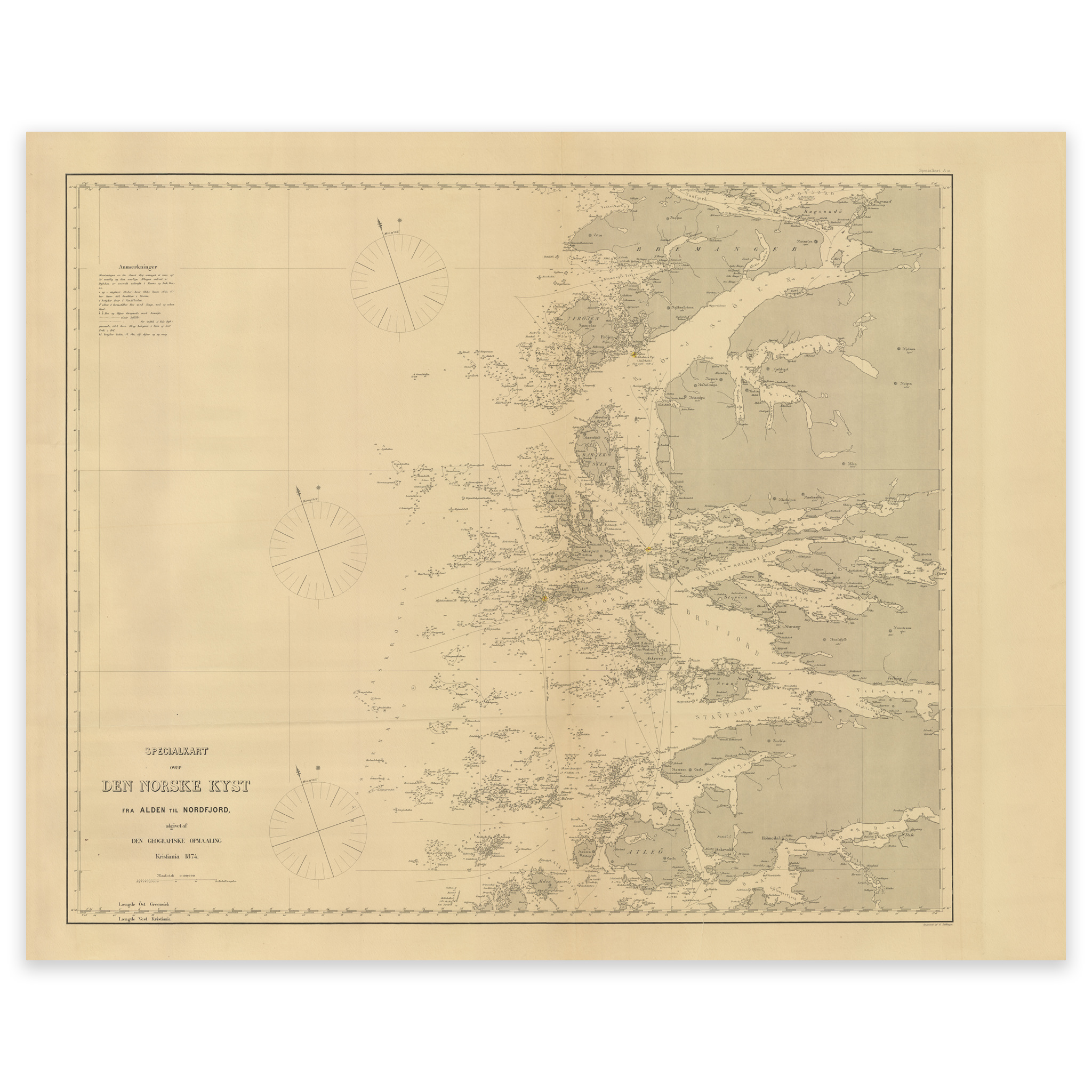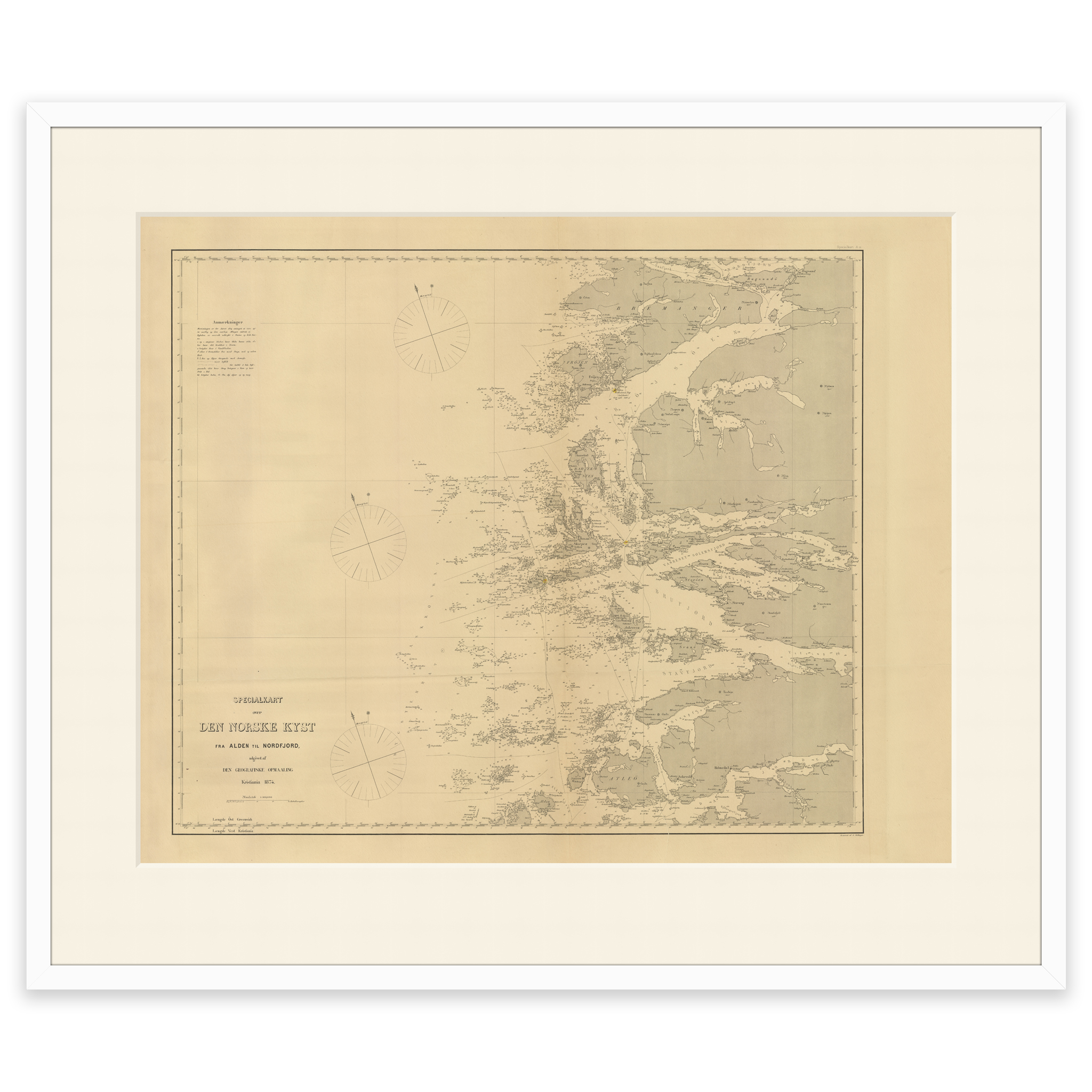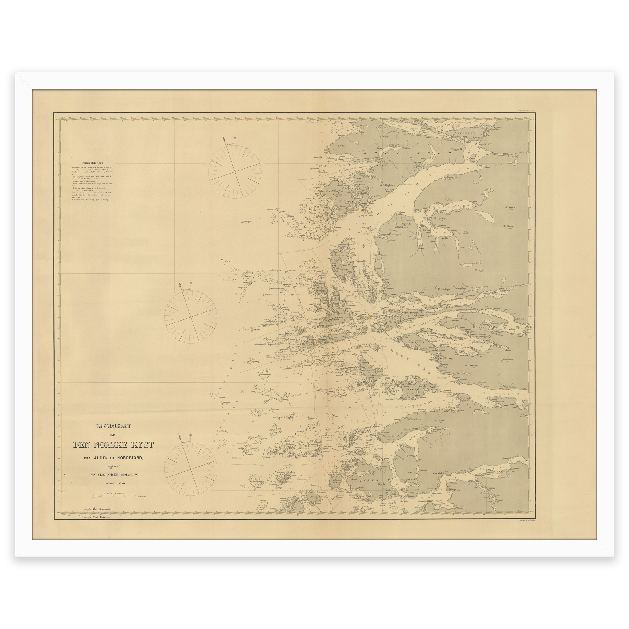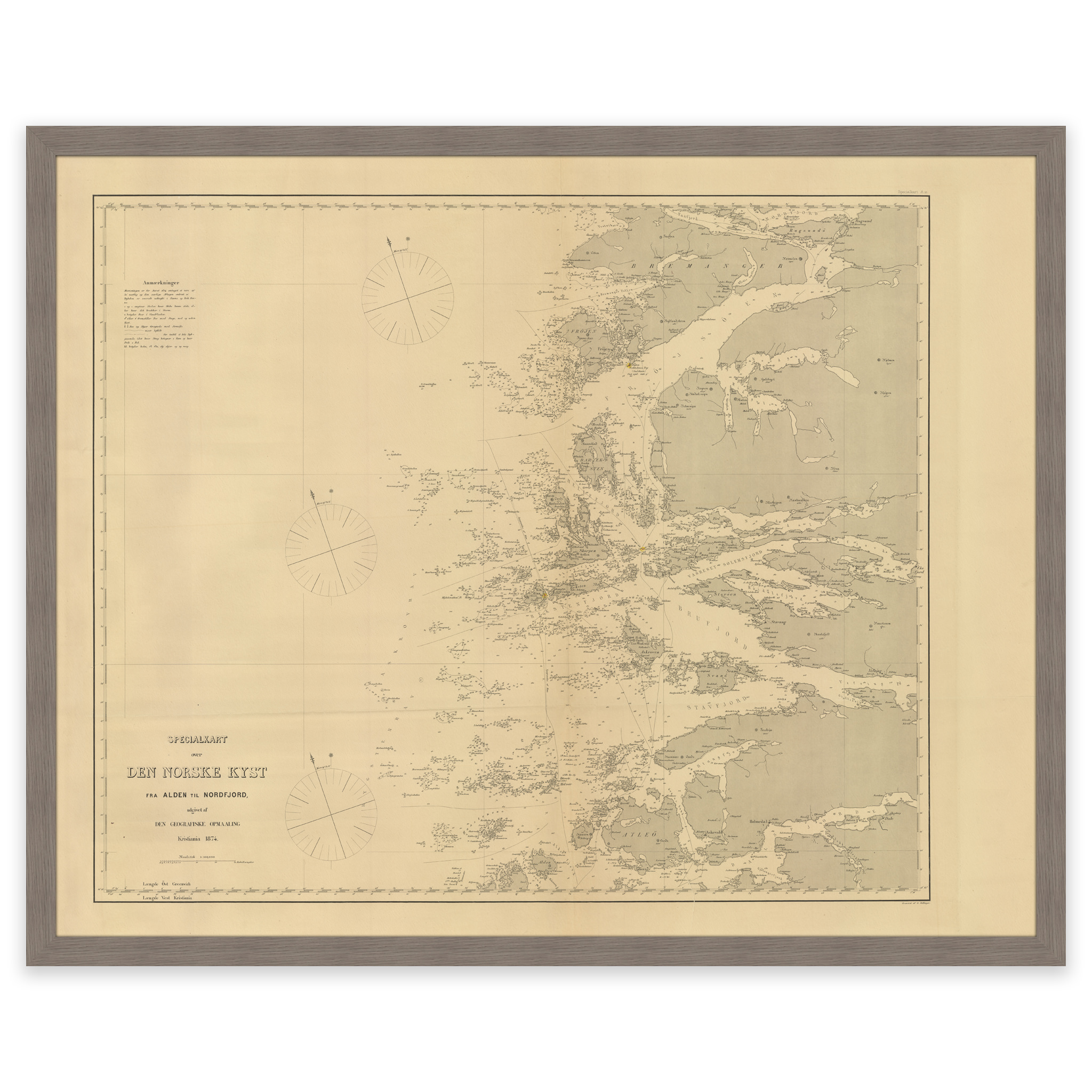 Kartet fra 1874 viser området fra Alden til Bremanger. Kartet leveres i originalstørrelse 66,7 x 53,1 cm. Størrelsen med ramme og passepartout er 84,7 x 72,1 cm. Ønsker du kartet i en annen størrelse? Bare ta kontakt – vi gir deg gjerne et pristilbud på tilpasning.