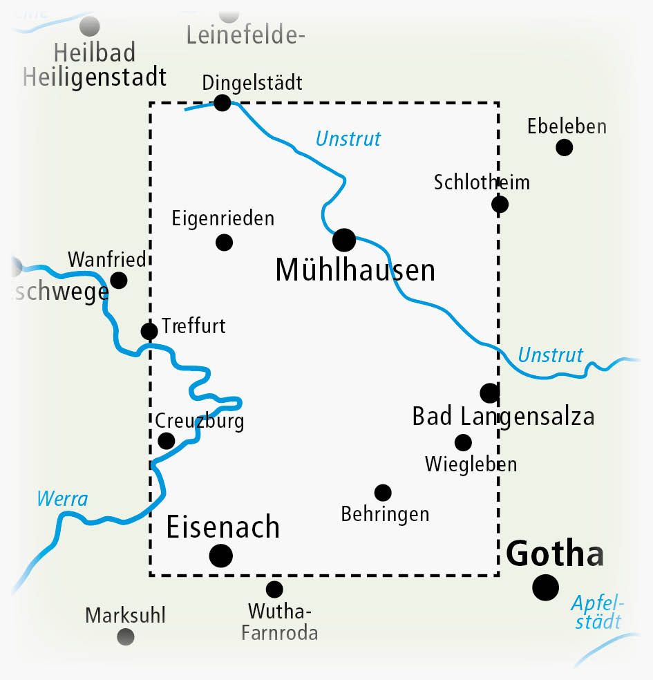 Dette sykkel- og turkartet dekker Welterberegion Wartburg Hainich i Thüringen og er utviklet for aktiv utforskning til fots og på sykkel. Kartet gir en detaljert og oversiktlig fremstilling av rad- og vandreruter i et av Tysklands mest særegne naturområder, og egner seg godt både til planlegging og bruk ute i terrenget.
