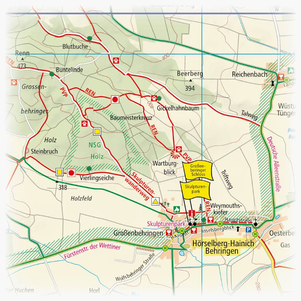 Området omfatter deler av Hainich nasjonalpark, et av de største sammenhengende løvskogene i Europa og oppført på UNESCOs verdensarvliste. Kartet viser et tett nett av lokale og regionale sykkel- og vandreruter som knytter sammen naturområder, tettsteder og severdigheter. Ruter mot Eisenach, Bad Langensalza, Eichsfeld samt langs elvene Unstrut og Werra er tydelig markert.