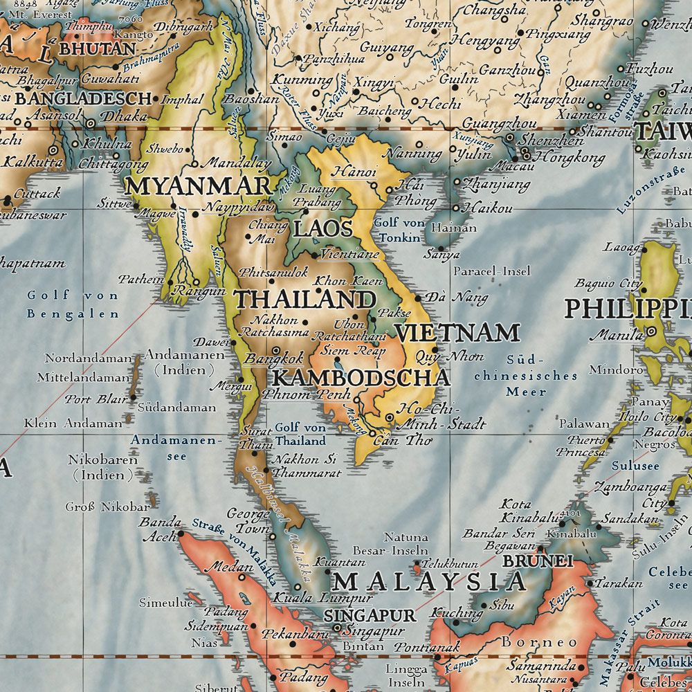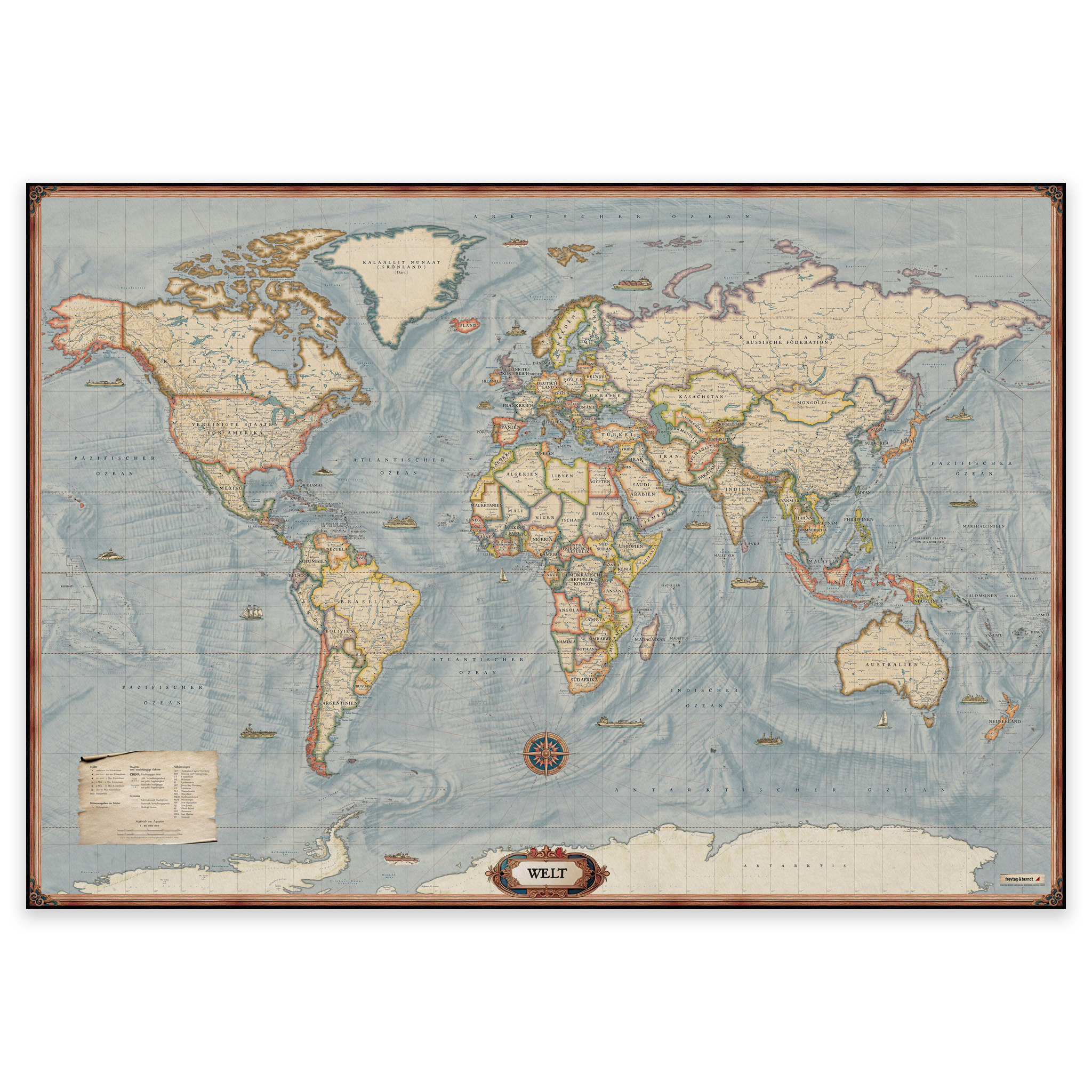 Dette verdenskartet kombinerer et klassisk, antikkinspirert uttrykk med moderne politiske kartdata. Kartbildet har varme fargetoner og et historisk preg, samtidig som landegrenser og geografisk inndeling er basert på oppdaterte og ajourførte kilder. Resultatet er et kart som fungerer både som et oversiktlig referansekart og som et dekorativt blikkfang på veggen.