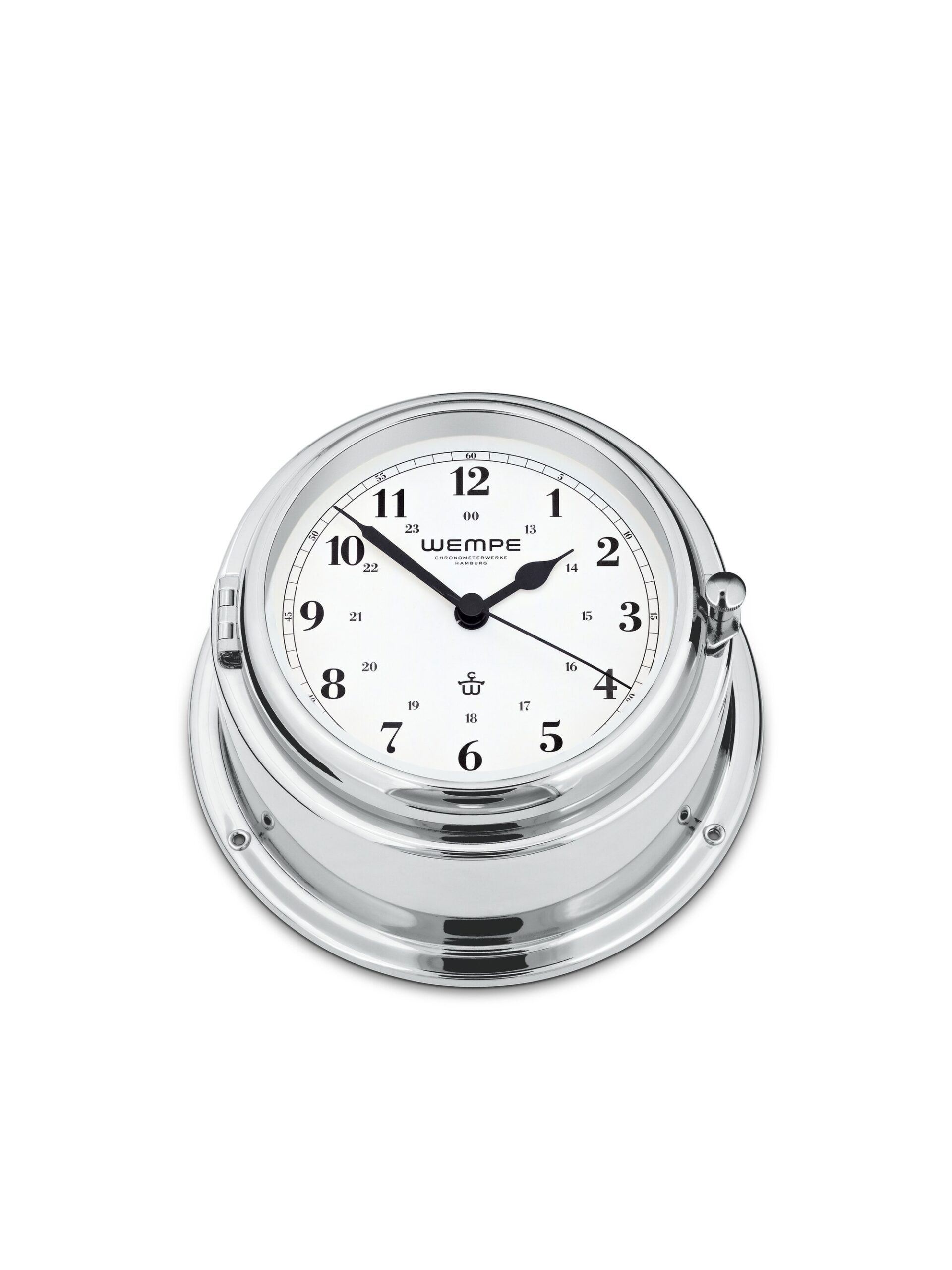 Wempe Bremen II – Ship’s Clock 150 mm i krom-belagt messing er et maritimt instrument som kombinerer tradisjonelt håndverk med moderne presisjon og et tidløst uttrykk. Denne skipets klokke har et solid hus i krom-belagt messing og en tydelig hvit urskive med svarte markeringer som gir enkel og elegant avlesning.