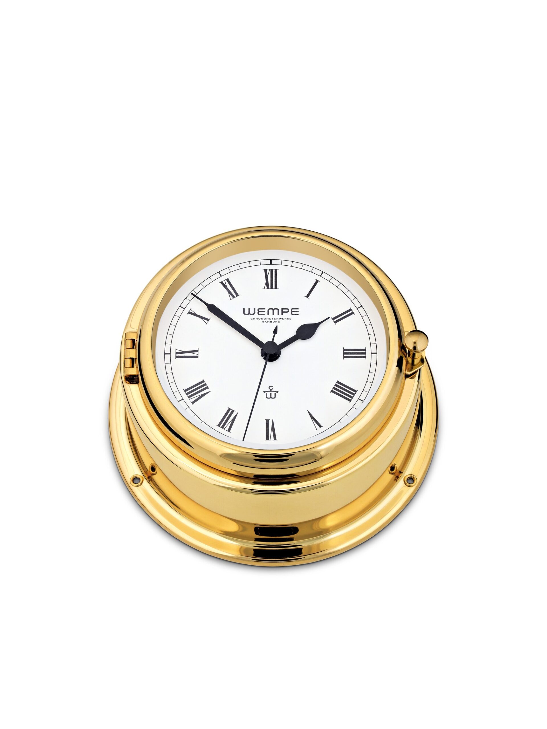 Wempe Bremen II – Ship’s Clock 150 mm i polert messing (romertall) er et klassisk maritimt instrument som kombinerer tradisjonell estetikk med moderne funksjon. Klokken har et solid hus i polert messing og en hvit urskive med sorte romertall som gir et tidløst og elegant uttrykk, samtidig som tiden er lett å lese.