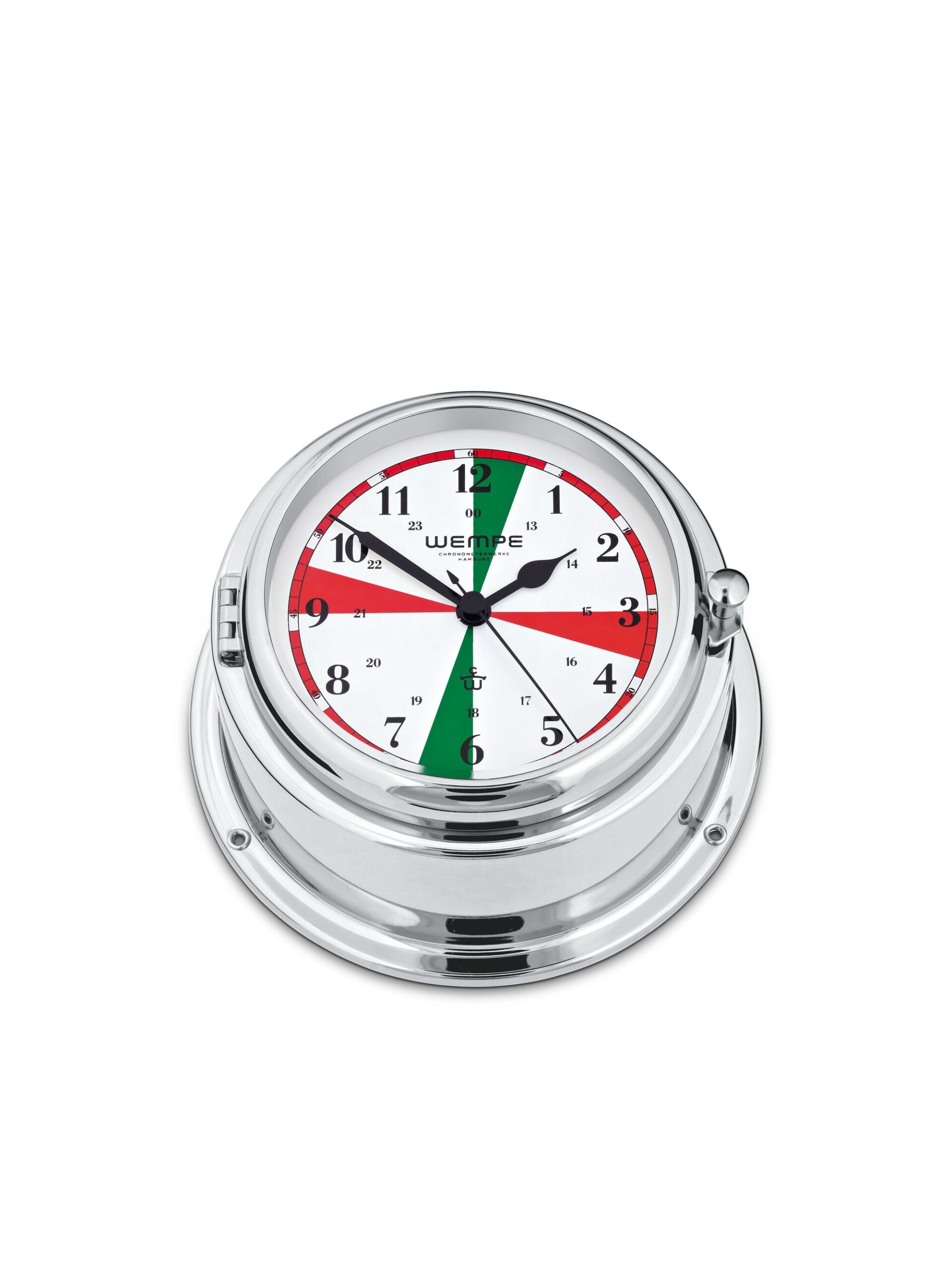 Wempe Bremen II – Radio Room Ship’s Clock 150 mm i krom-belagt messing er et maritimt instrument som kombinerer klassisk estetikk med teknisk funksjon. Denne skipets klokke har en solid kasse i krom-belagt messing og en tydelig hvit urskive med sorte markeringer og fargede radiosektorer som hjelper deg å følge radiokommunikasjonsintervaller. Dette gir både funksjonell og visuell verdi for den maritime brukeren.