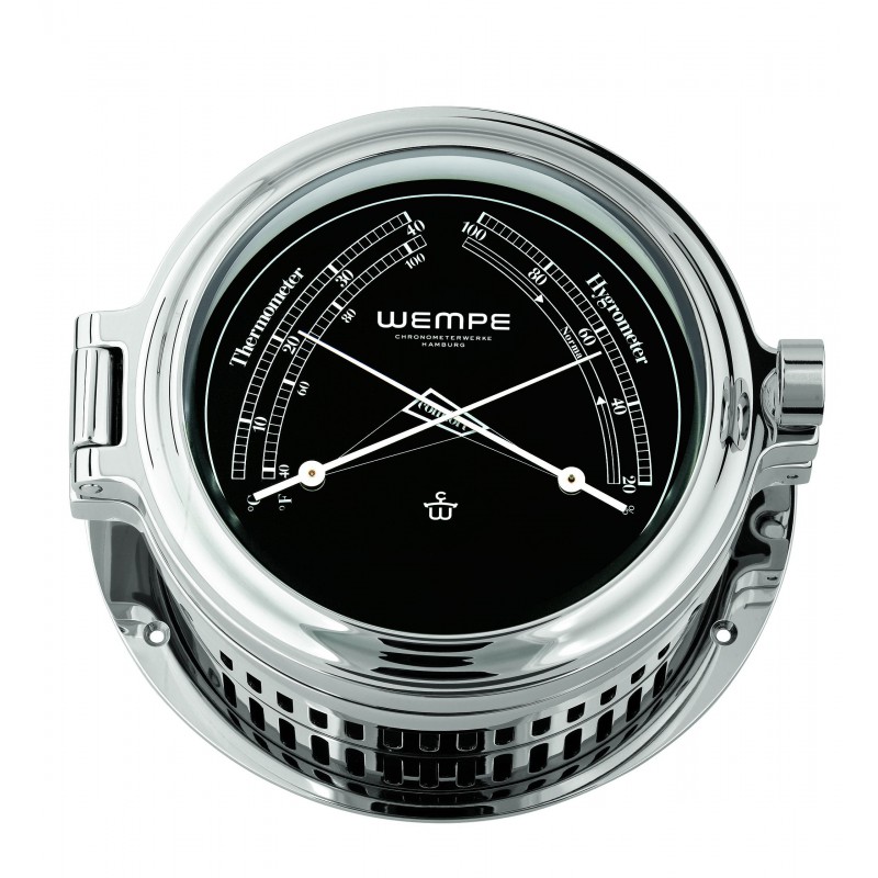 Wempe Regatta – Comfortmeter 140 mm i polert rustfritt stål er et maritimt instrument som gir nøyaktige målinger av både temperatur og relativ luftfuktighet i ett elegant og funksjonelt instrument. Comfortmeteret har et hus i polert rustfritt stål og en tydelig urskive med kontrastmarkører som gir enkel avlesning under alle lysforhold.
