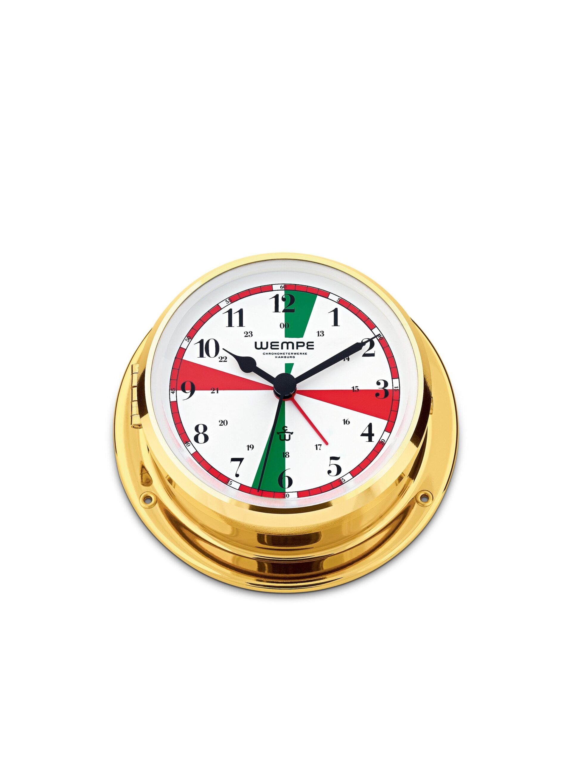 Wempe Skiff – Radio Room Ship’s Clock 110 mm i polert messing er et maritimt instrument som kombinerer tidløs estetikk med moderne funksjonalitet. Dette radio-roms skipets klokke har et kompakt hus i polert messing med høyt speilglans og transparent lakk, og en tydelig hvit urskive som er enkelt å lese.